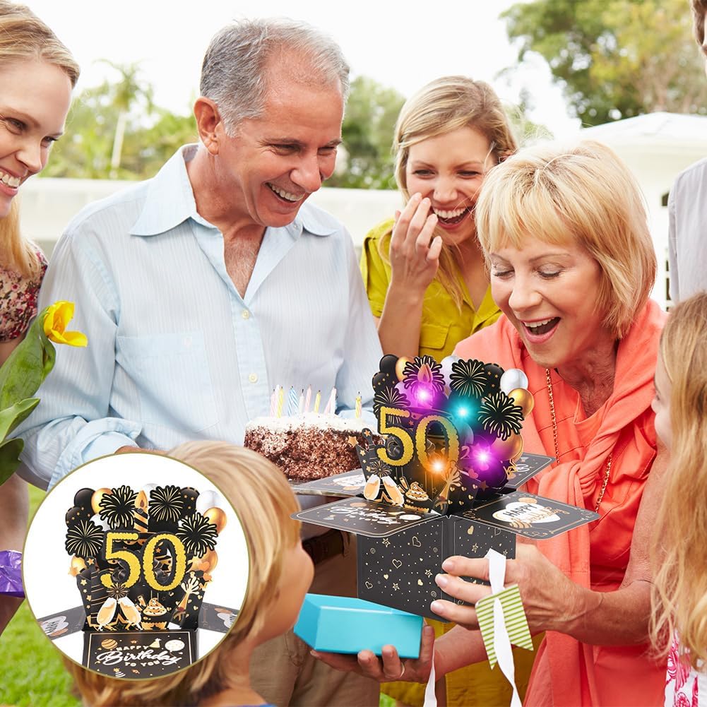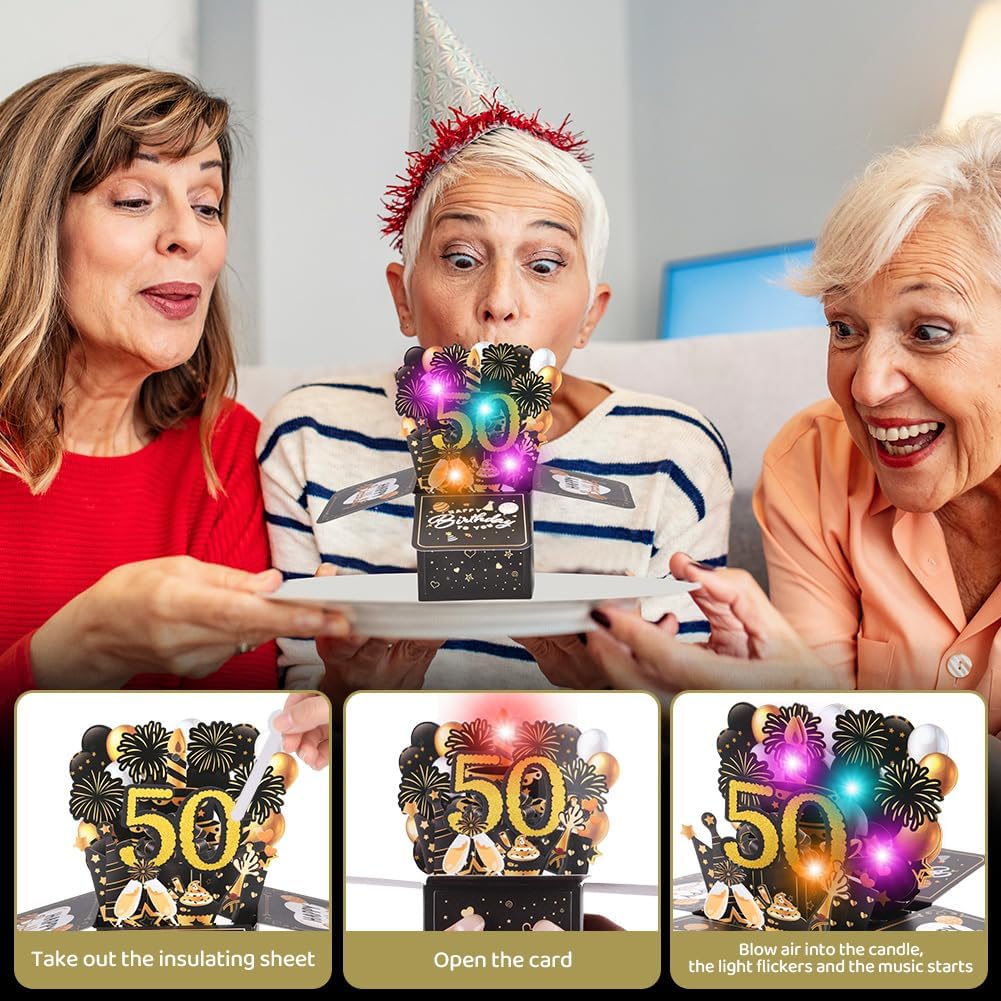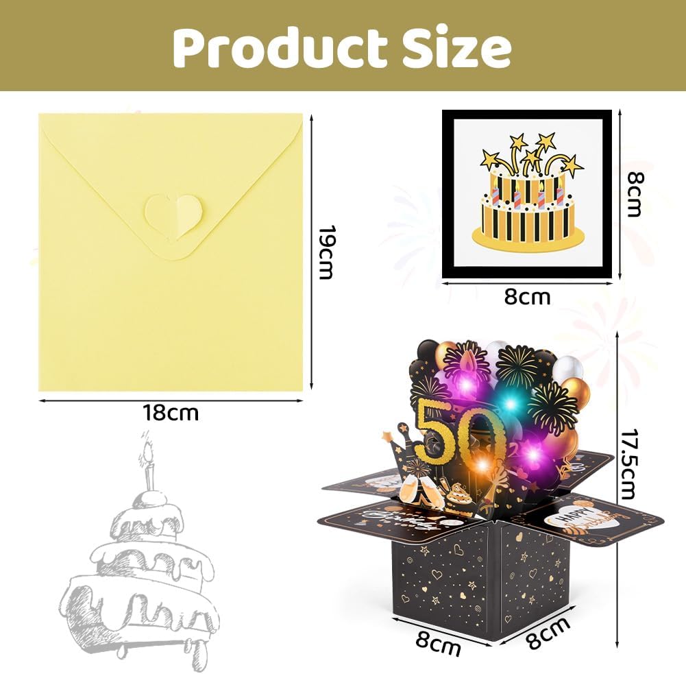 💥【Biglietto d'auguri 3D】Riceverai 1 biglietto pop-up per il 50° compleanno + 1 busta + 1 messaggio. Dimensioni della carta 3D: 8*8*17,5 cm. Se stai cercando un biglietto regalo unico e memorabile, questo biglietto d'auguri pop-up musicale 3D fa per te 💥 【Biglietto pop-up 3D con luci musicali】 Il biglietto si apre, la striscia bianca viene rimossa e la candela si accende. Spegni la candela LED e il biglietto suonerà automaticamente la melodia della canzone tradizionale "Happy Birthday", creando un'atmosfera gioiosa e calda per questo giorno speciale. Realizzati con materiali e lavorazione artigianale di alta qualità, sono durevoli e possono essere conservati a lungo dai tuoi cari. 💥 【Biglietto d'auguri scrivibile】 Questo biglietto d'auguri dal design pop-up è decorato con graziosi numeri di compleanno. Il biglietto d'auguri con busta contiene un biglietto d'auguri vuoto. Puoi scriverci sopra i tuoi desideri a mano e regalarli al tuo partner 💥【Regali creativi】 È il biglietto di auguri ideale per mamma, papà, figlio, figlia, moglie, marito, fidanzata, fidanzato e tutti i membri della famiglia, indipendentemente dalla loro età o status