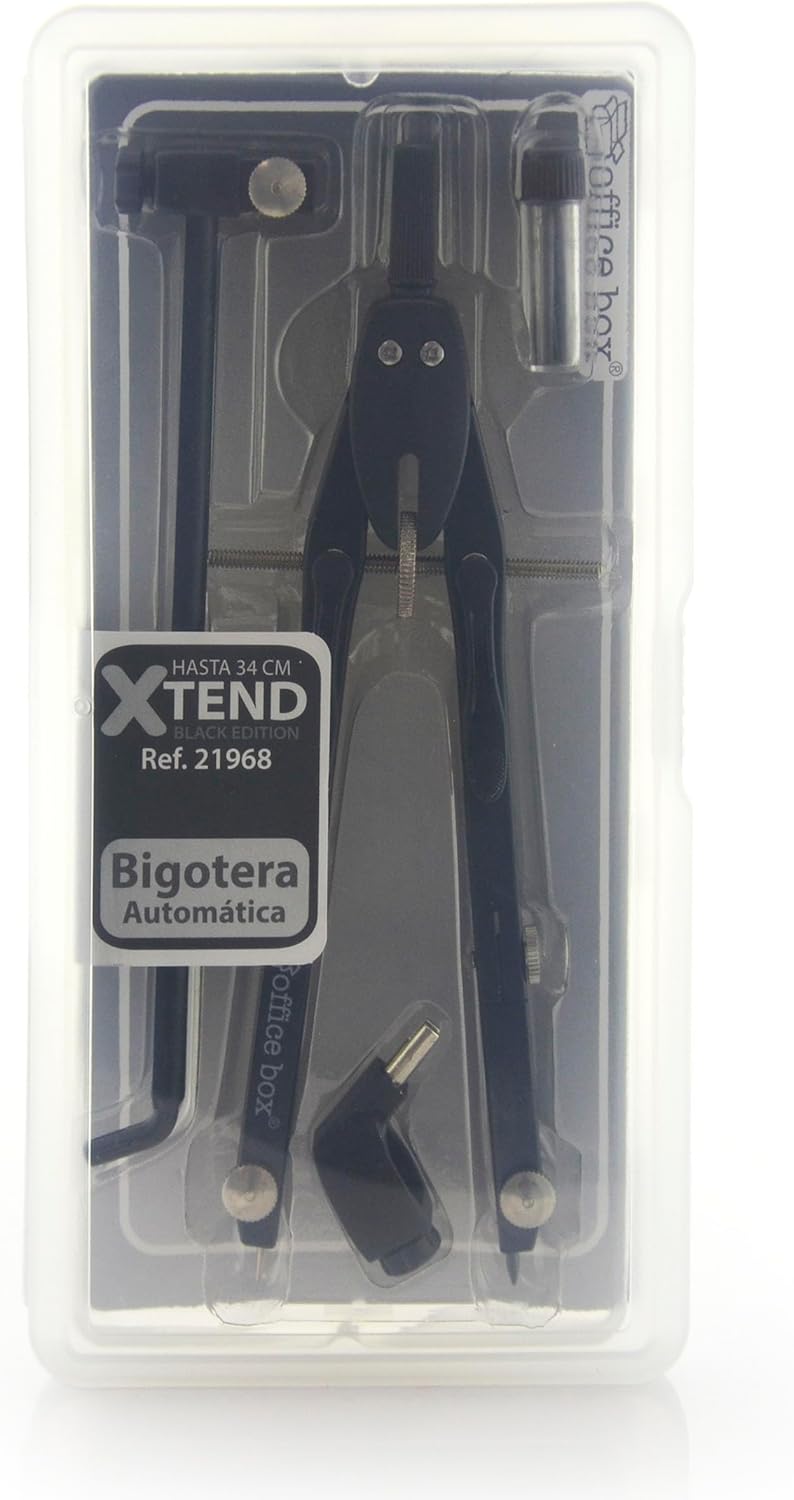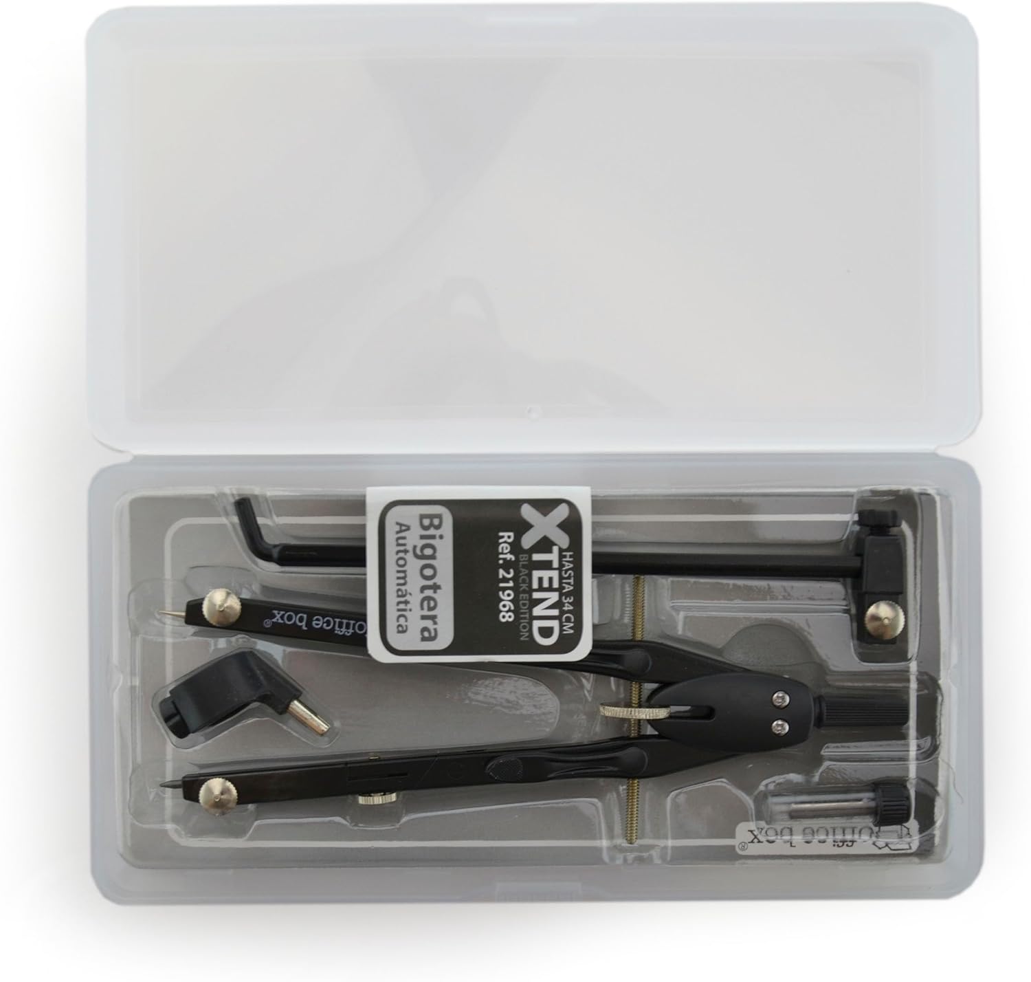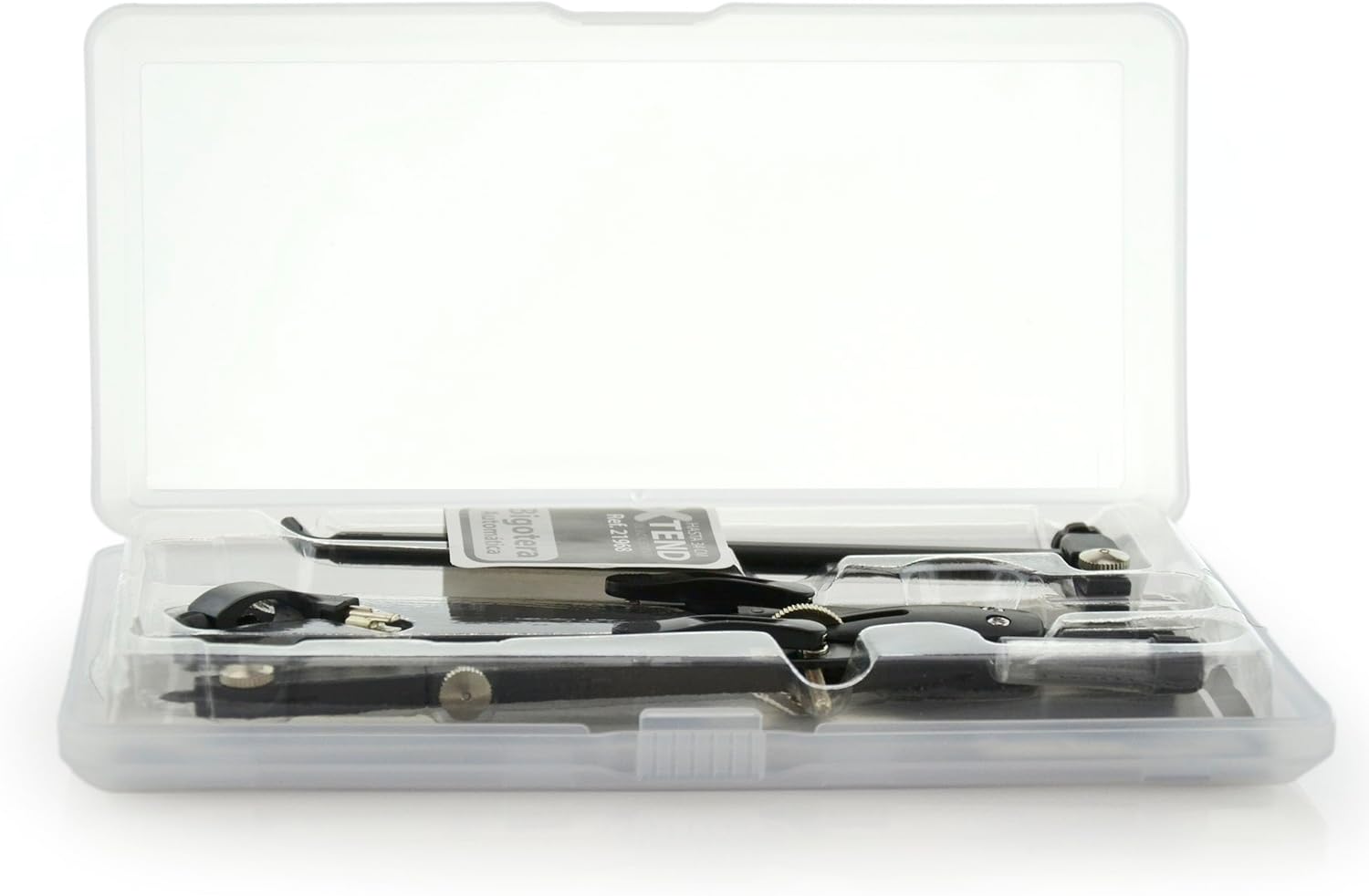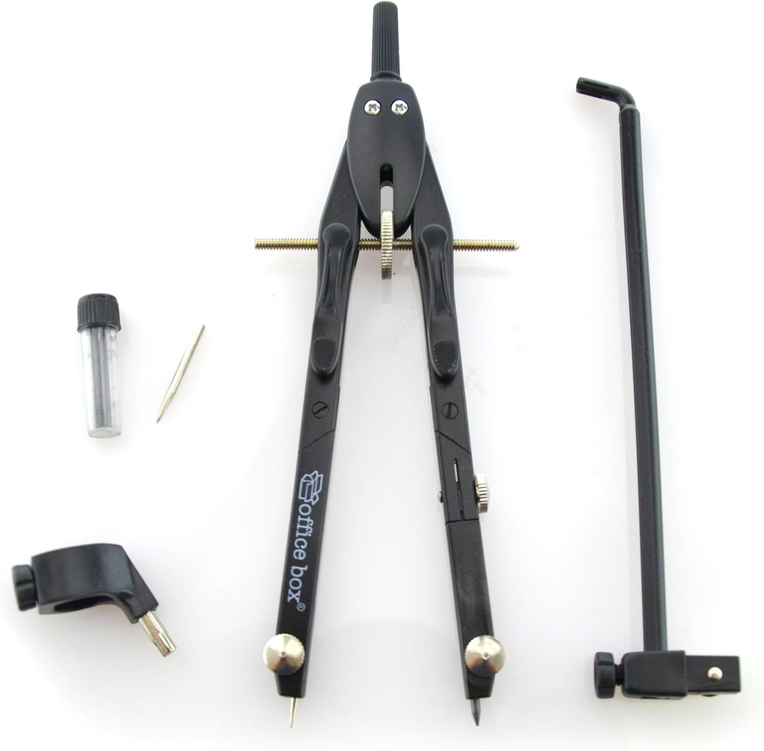 Due bracci articolati metallici di grande resistenza e durata. Prolunga metallica in colore abbinato fino a 34 cm. Presentato in scatola di plastica rigida resistente agli urti, ideale per durare molto più a lungo di un corso. Il set di bussola più completo, massima precisione con adattatore universale in colore abbinato incluso. Piccolo barattolo di ricambio per mine – 2 mine extra incluse e punzone extra. Elegante e attraente colore nero con qualità per durare tutto il corso.