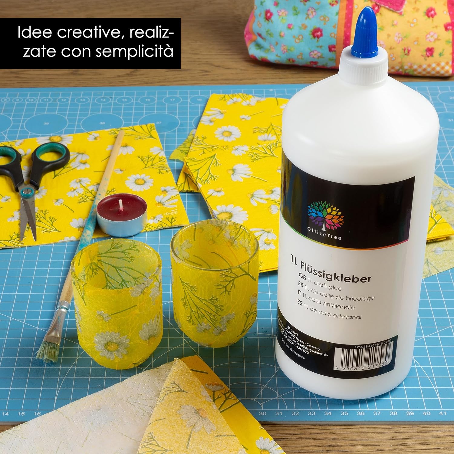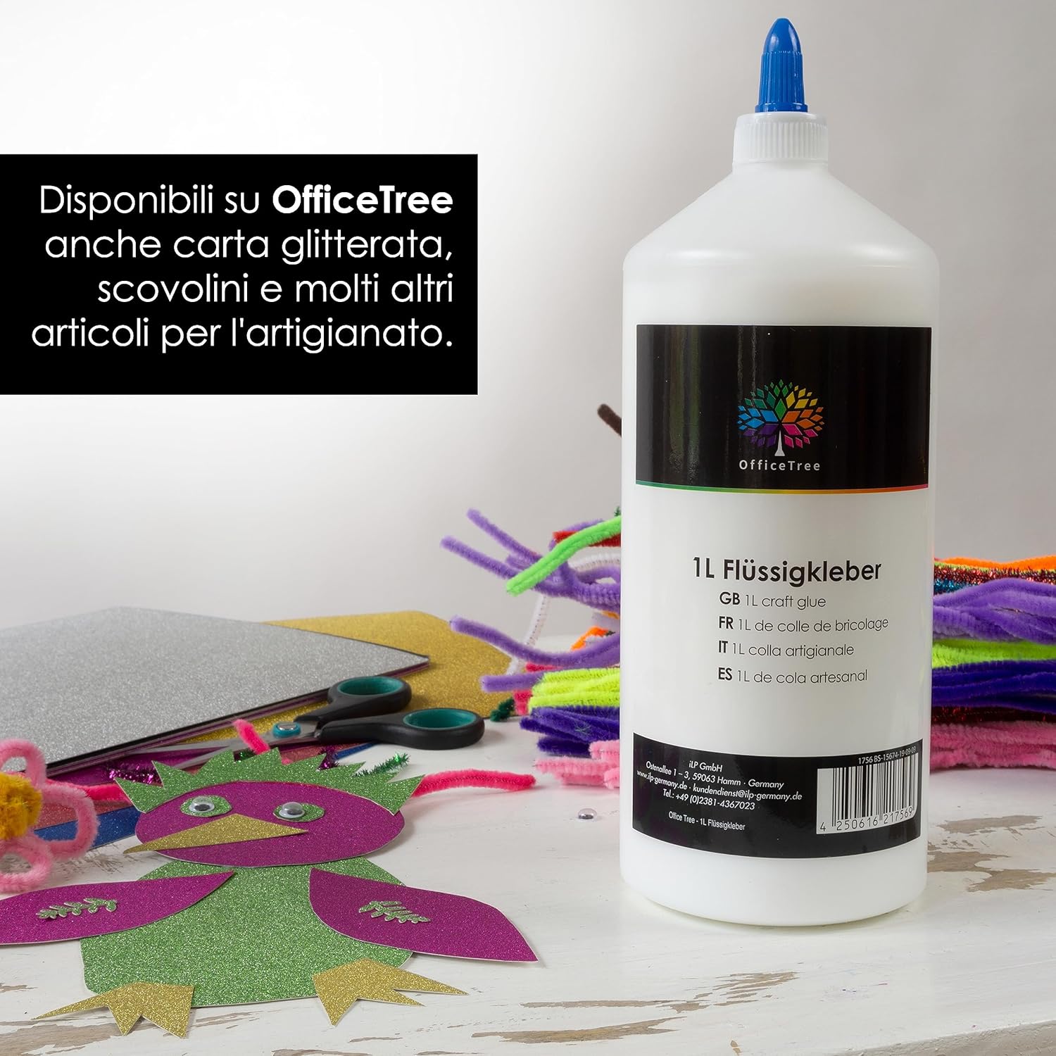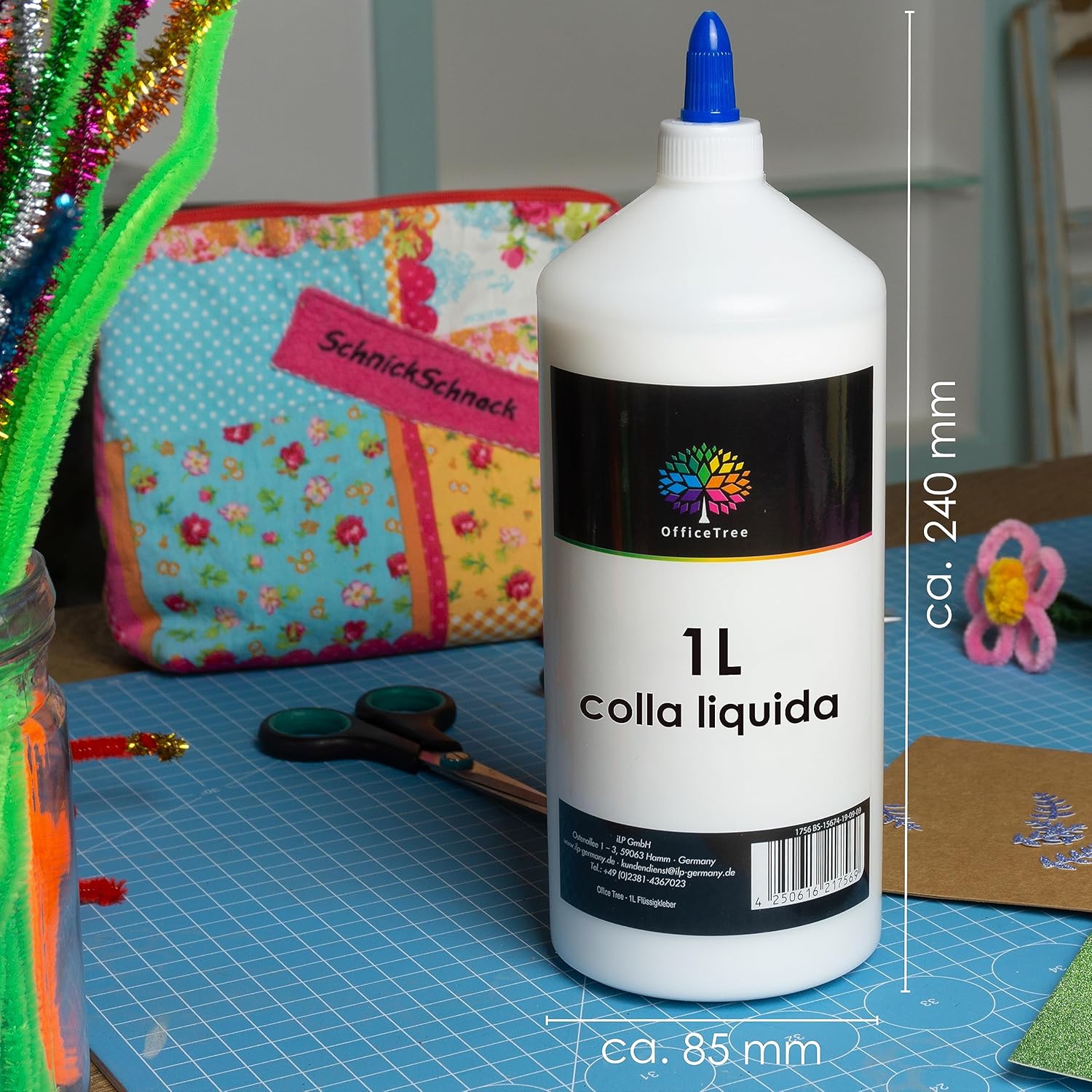 TRASPARENTE – 1 L di colla bianca per bricolage da OfficeTree, che diventa trasparente una volta asciutta; a base acquosa, priva di solventi e idrosolubile VERSATILE – Colla universale per carta, cartone, legno, feltro, tessuti, polistirolo e molto altro; adatta per i bambini PRONTA ALL'USO – Colla liquida trasparente forte per progetti di bricolage all'asilo, a scuola, a casa, per hobbistica e per lavoro DI PRIMA QUALITÀ – Colla inodore per bricolage e decorazioni, di ottima qualità, ideale per piccole e grandi superfici APPLICAZIONE FACILE – Si applica in modo semplice e pulito direttamente dal flacone schiacciabile, ideale per le mani dei bambini; lavabile prima che si asciughi