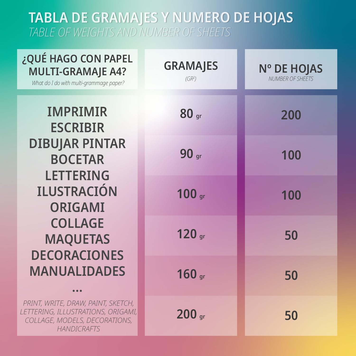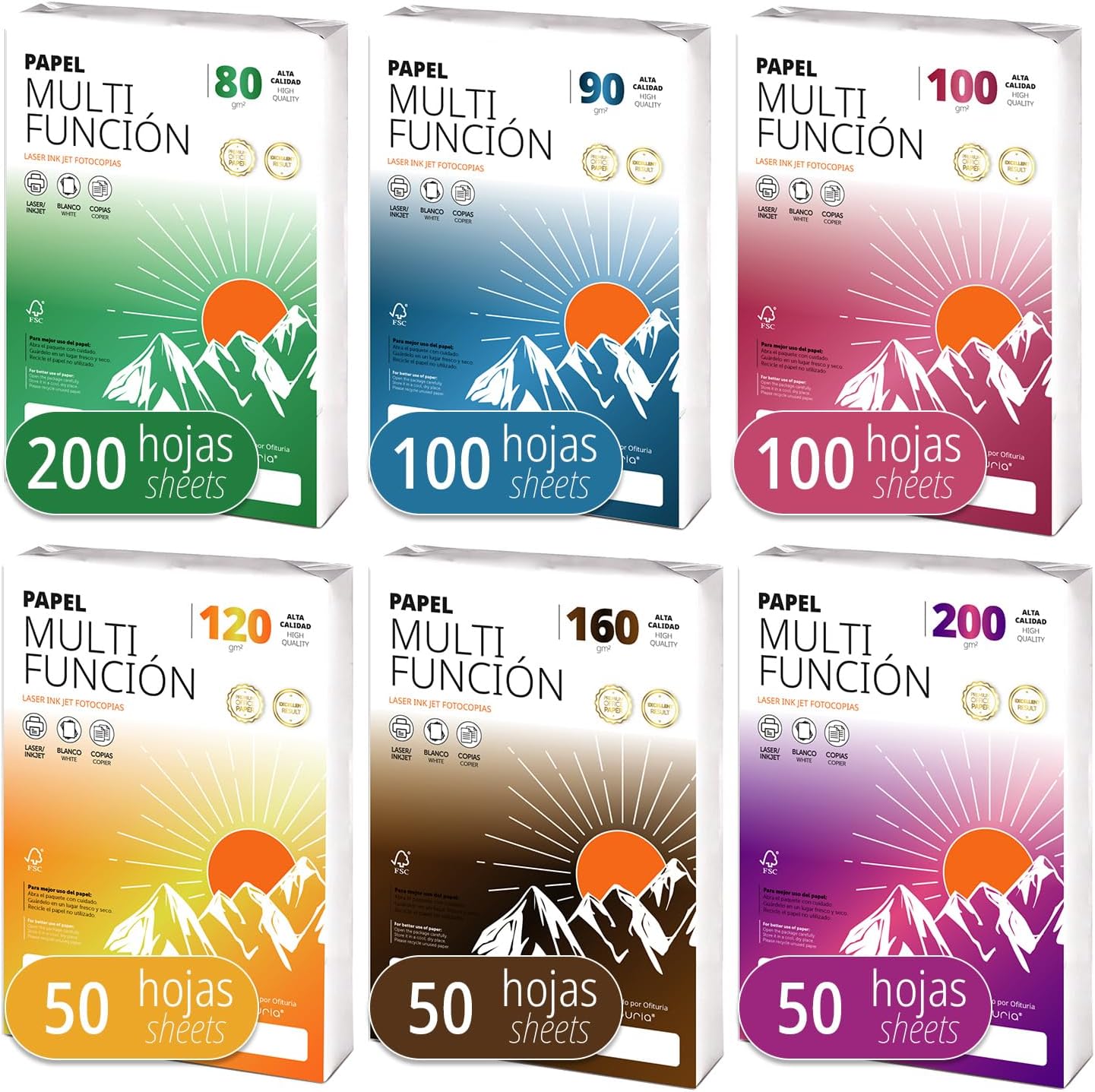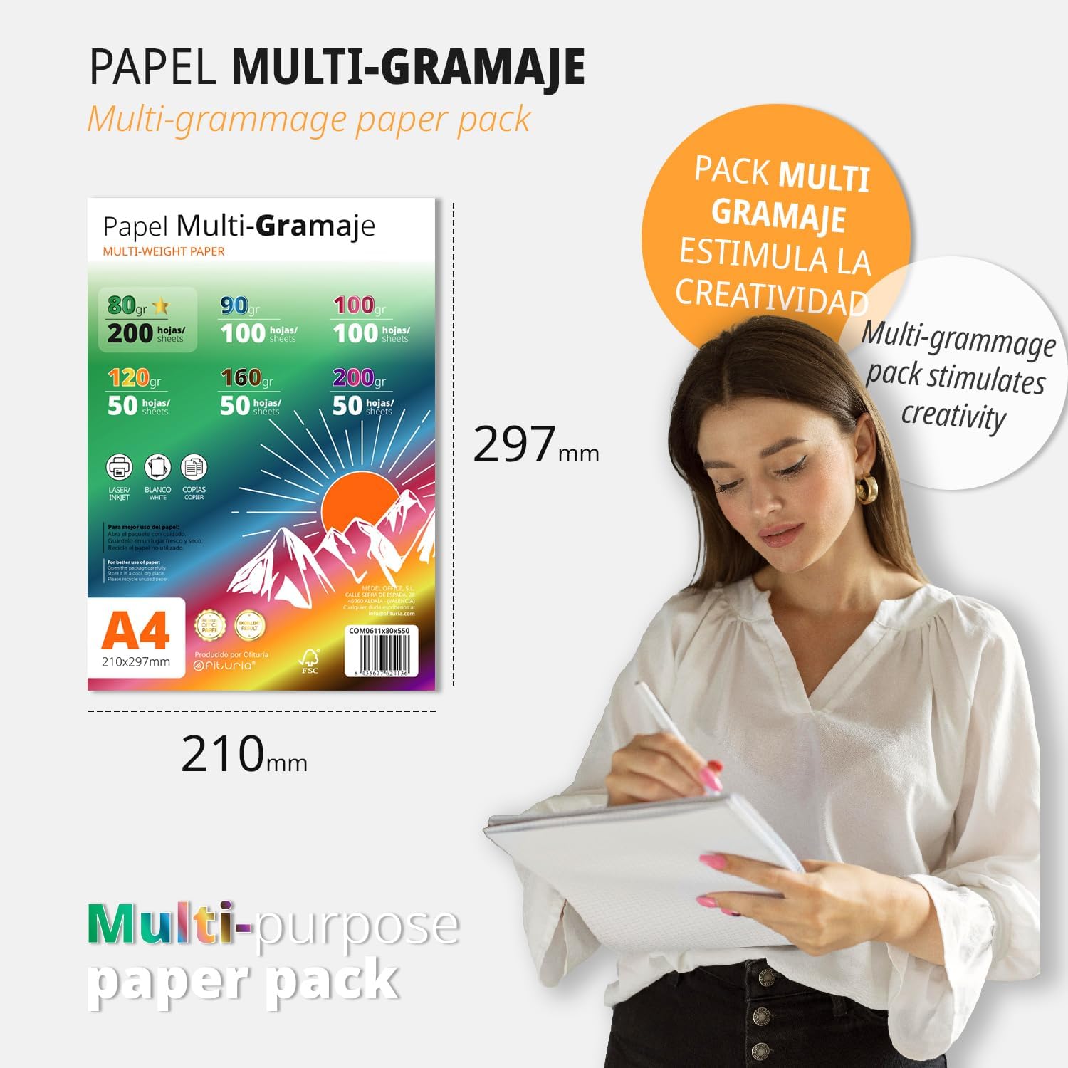 PACCHETTO MULTI-GRAMMATURE 80GR+: questo pacchetto contiene 200 fogli da 80gr, 100 fogli da 90gr, 100 fogli da 100gr, 50 fogli da 120gr, 50 fogli da 160gr e 50 fogli da 200gr. Un totale di 550 fogli in ogni confezione. VERSATILITÀ A PORTATA DI MANO: Perfetto per ogni progetto, dalla stampa di documenti e la scrittura di appunti al lavoro creativo e all'artigianato. Con pesi diversi in un'unica confezione, hai tutto ciò che ti serve in un unico acquisto. FOLIE ADATTATE ALLE TUE ESIGENZE: grammature leggere per la stampa quotidiana, grammature medie per schizzi e scritte e grammature pesanti per progetti e modelli artistici. Ottieni risultati ottimali in qualsiasi attività, indipendentemente dal tipo di carta. IDEALE PER CASA, UFFICIO O SCUOLA: Che si tratti di lavori scolastici, compiti domestici o presentazioni professionali, questo pacchetto di carta multigrammatura copre tutte le basi, offrendo un'esperienza personalizzata per ogni esigenza. ESPLORA NUOVE TECNICHE E PESI: sperimenta tecniche come pittura, collage, calligrafia e altro ancora. Questo versatile pacchetto di carta ti invita a esplorare la tua creatività con carte che supportano inchiostro, pittura e tutti i tipi di strumenti.