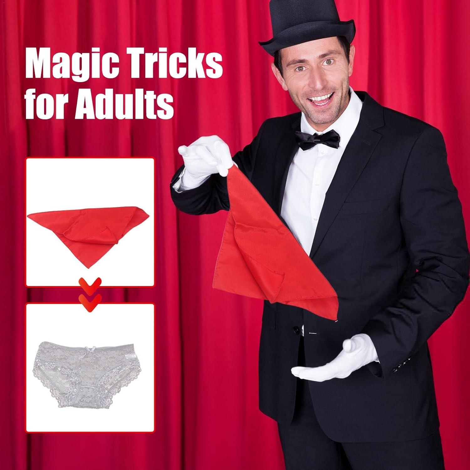 Biancheria intima inaspettata: una sciarpa di seta diventa sorprendentemente biancheria intima quando viene tirata da due membri del pubblico: questo trucco magico unico crea un'illusione scenica sorprendente e inspiegabile. Set di ciondoli multiuso: crea un aspetto indimenticabile in ogni evento con questa versatile raccolta di trucchi. Lascia il segno sul palco e stupisci gli ospiti alle feste, agli eventi di giochi da tavolo e altro ancora con un set di ciondoli dinamico e versatile. Aggiungi fascino: il nostro set è dotato di oggetti di scena magici fin dall'inizio ed è molto adatto ai principianti, quindi puoi diventare rapidamente un mago professionista. Con fantastici accessori per spettacoli di fascino, il tuo aspetto sarà perfetto. Morbido e confortevole: questo set di ciondoli per adulti garantisce la massima sicurezza e presenta superfici lisce e prive di spine e materiale robusto e di alta qualità, in modo che le tue dita non vengano facilmente danneggiate o ferite. Facile da trasportare: grazie al nostro design compatto e pratico, disordine e danni appartengono al passato. Conserva i tuoi trucchi magici in borse o zaini in modo da poterli eseguire ovunque e in qualsiasi momento.