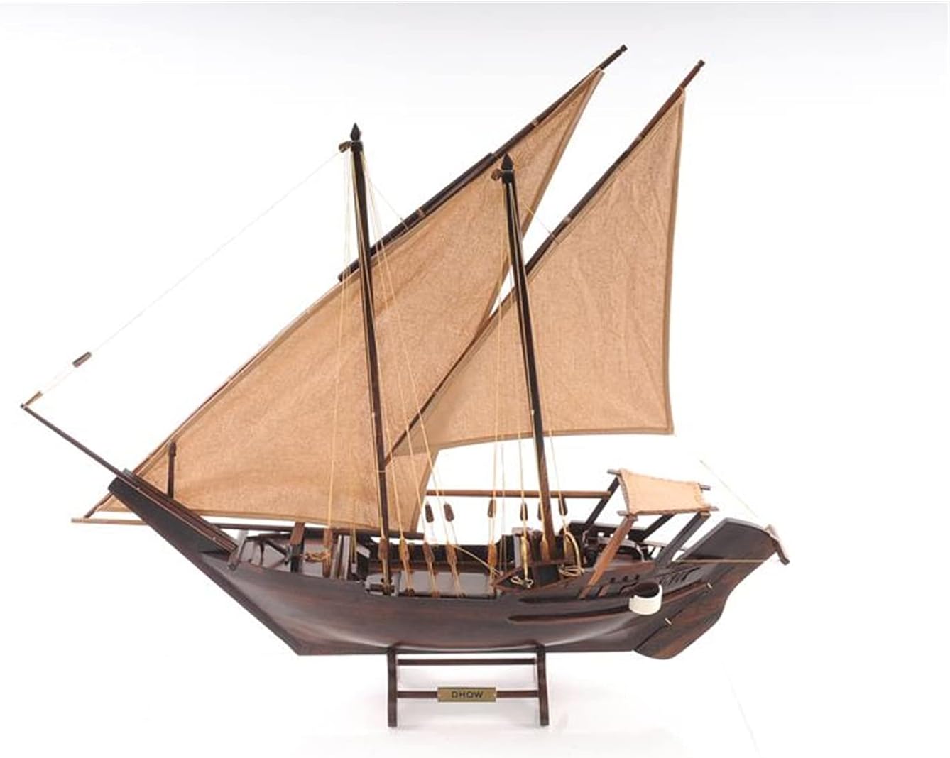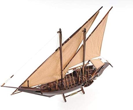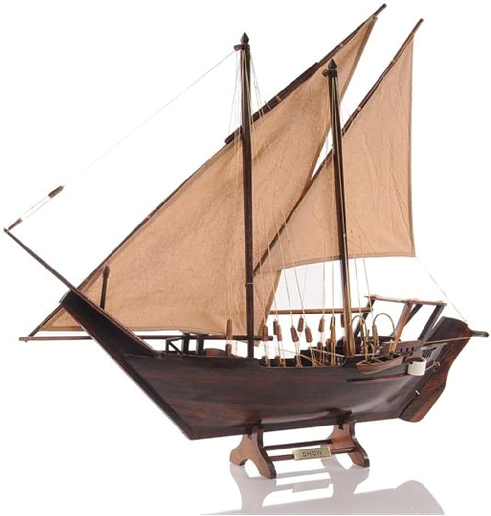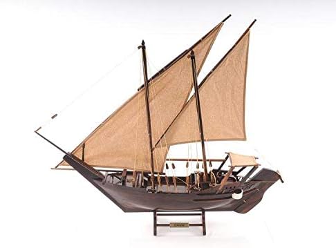 Dimensioni: Questo modello di barca Old Modern Handicrafts misura 30,5L x 5,0P x 26,5A pollici Legno Pregiato: Realizzato con precisione utilizzando legni pregiati – cedro rosso occidentale, legno di rose e mogano – arricchito con statue e ornamenti in ottone per un tocco di opulenza Dettagli Intricati: Il modello include sartie e cime annodate a mano, con vele spiegate realizzate in lino fine, replicando l'iconico design triangolare del Dhow Pronto per la Mostra: Completamente assemblato e montato su un supporto, questo modello di Dhow è pronto per essere esibito come un'aggiunta unica e storica al tuo arredamento Artigianato Senza Tempo: Caratterizzato da vele cucite a mano, ancore in metallo e timone in legno, questo modello cattura l'essenza della costruzione tradizionale delle Dhow