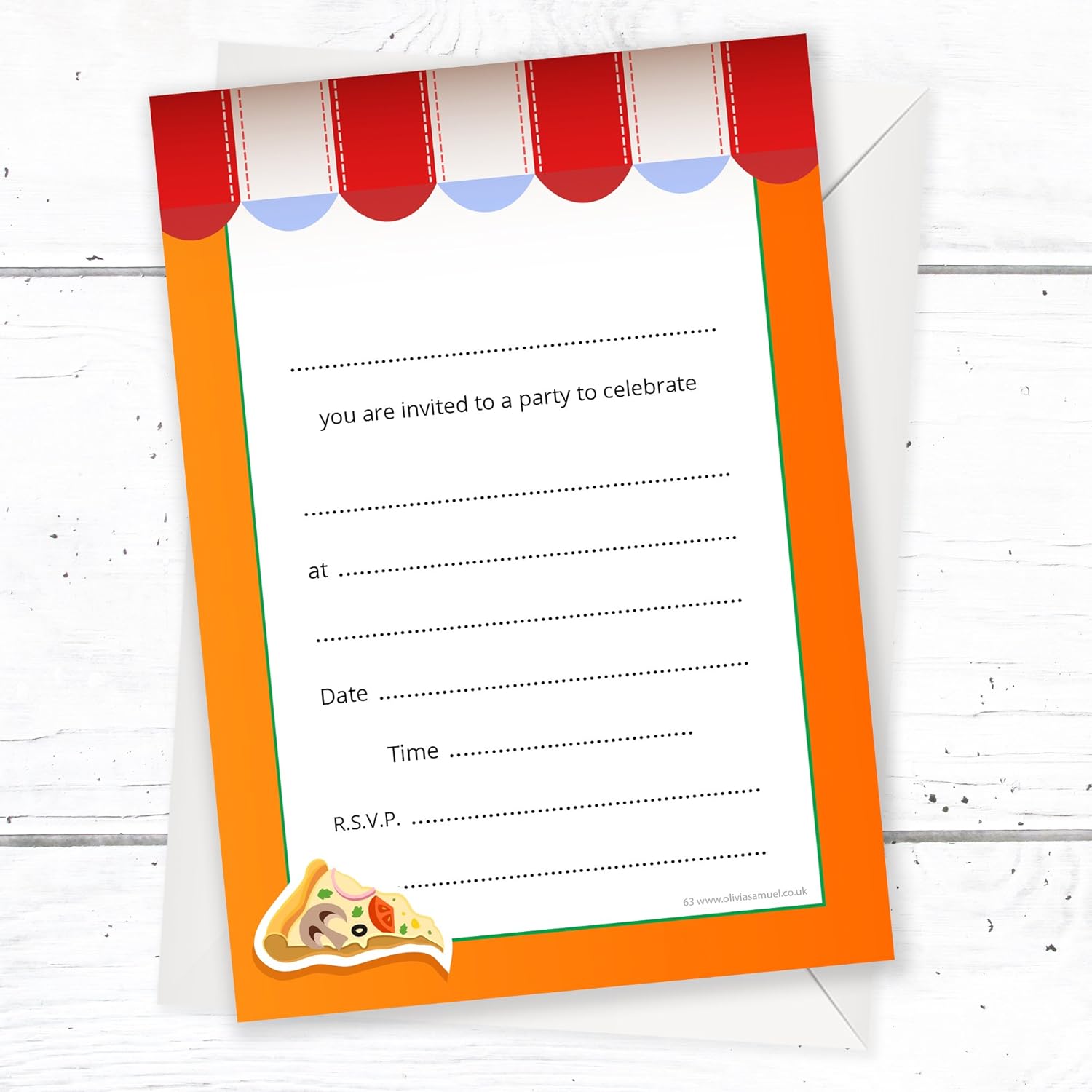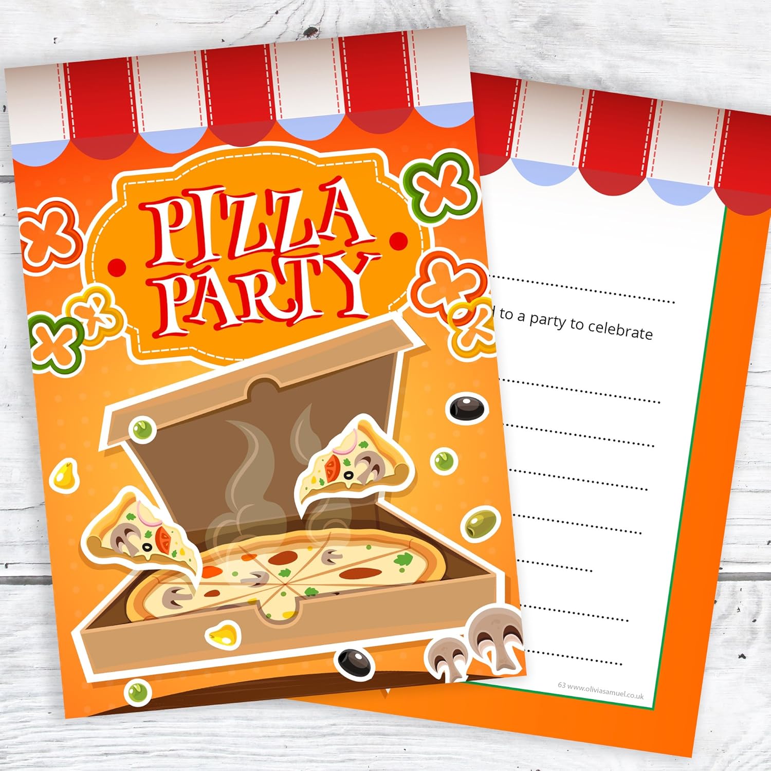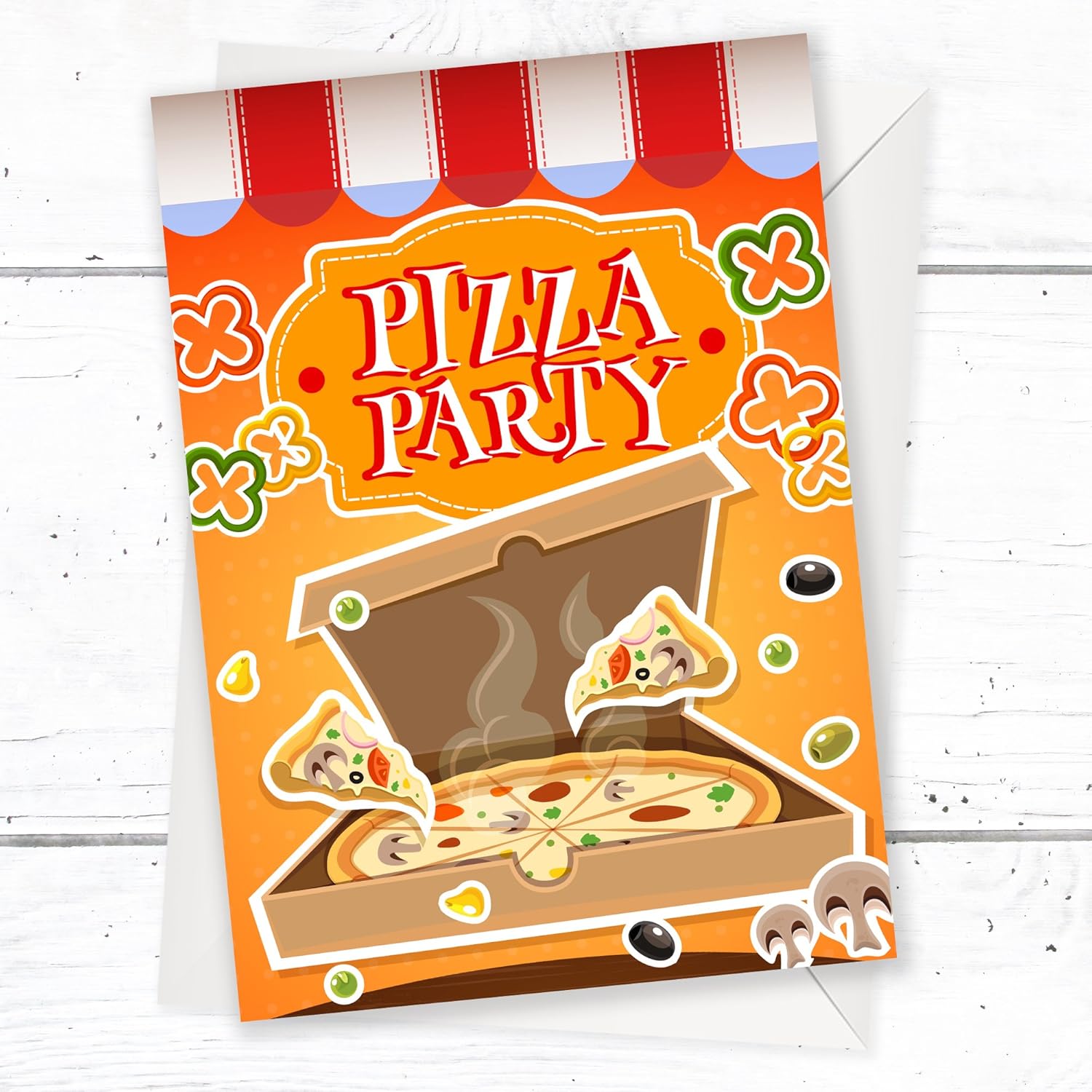 Confezione da 20 inviti per feste di compleanno con pizza, design stravagante, stampati professionalmente su entrambi i lati Cartoncino extra spesso: stampato su cartoncino a triplo rivestimento di alta qualità da 300 g/m². La parte anteriore del biglietto ha un'elegante lucentezza. Il retro del biglietto ha una finitura opaca per una facile scrittura. Dimensioni: questi biglietti d'invito misurano in formato A6 (105 x 148 mm) Buste incluse: questi inviti sono dotati di 20 buste bianche di qualità da 100 g/m² Ecologico e prodotto nel Regno Unito. La nostra fabbrica funziona con energia rinnovabile al 100%. Il nostro cartoncino proviene da fonti sostenibili e le carte sono completamente riciclabili.