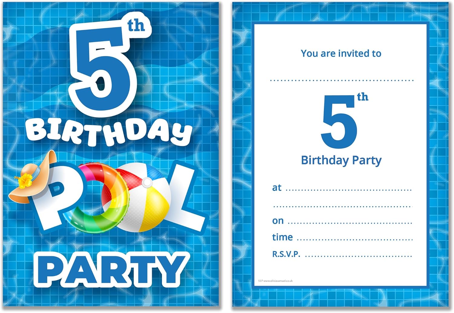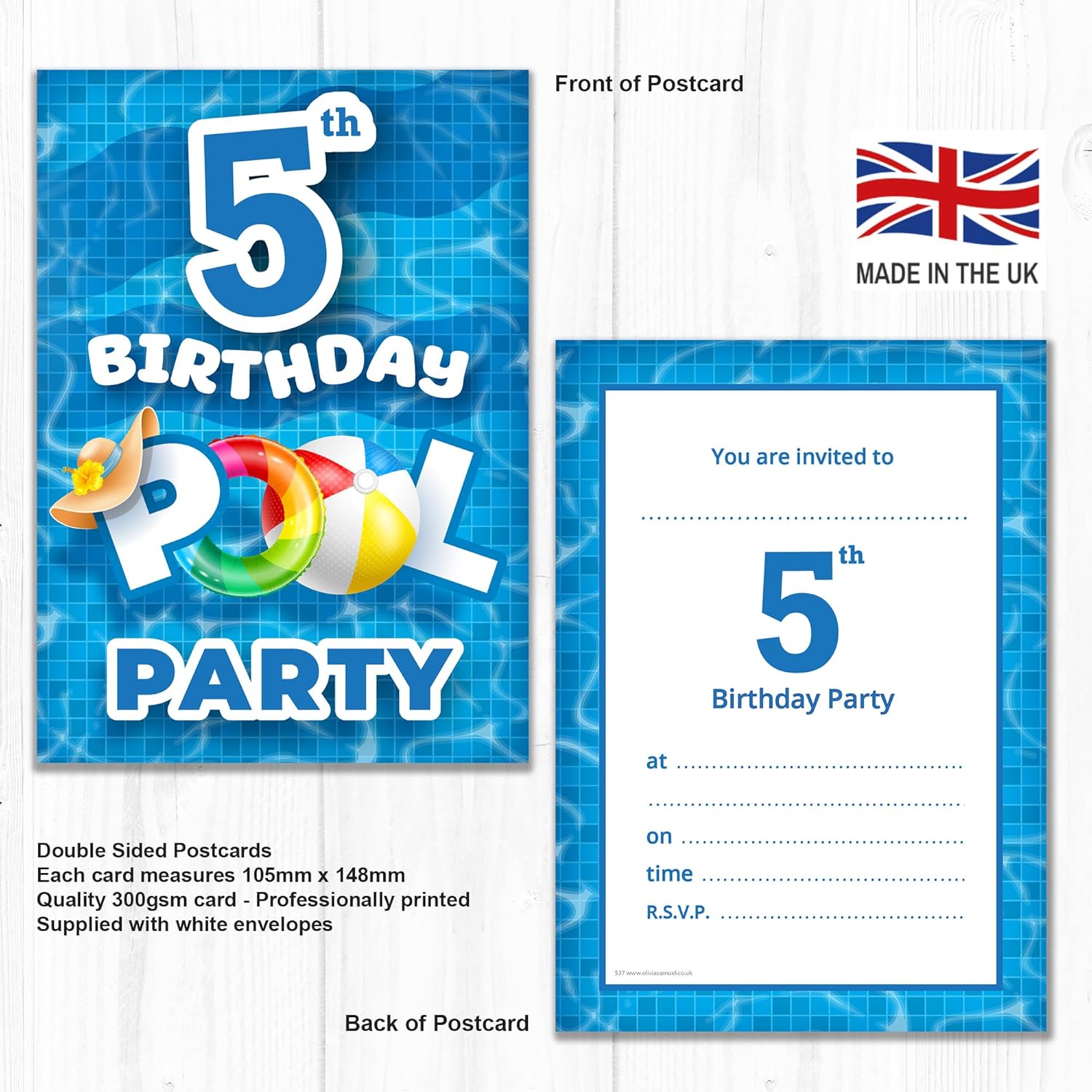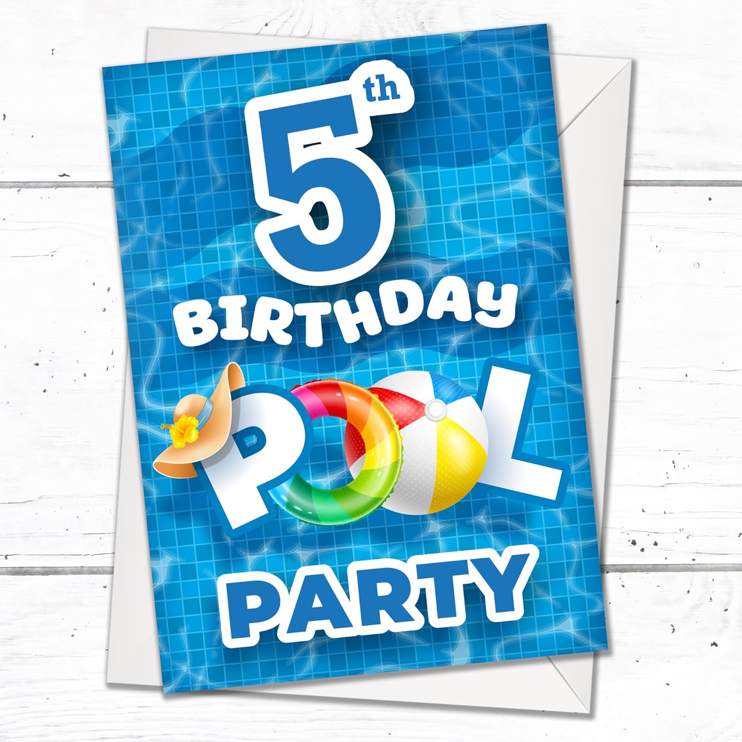 Inviti per feste in piscina, età 5 anni, confezione da 20 inviti di compleanno per 5° compleanno, festa in piscina, formato A6 (105 mm x 148 mm), stampati professionalmente su entrambi i lati, forniti con buste bianche Cartoncino extra spesso ⭐ cartoncino triplo rivestito da 300 g/m² con retro opaco per una facile scrittura Dimensioni: questi biglietti d'invito misurano 105 x 148 mm (formato A6) e sono dotati di buste C6 con chiusura ermetica Prodotto nel Regno Unito ⭐ Stampato nella nostra fabbrica Hampshire Ecologico: la nostra fabbrica funziona con energia rinnovabile al 100%. Il nostro cartoncino proviene da fonti sostenibili. Sia il biglietto che la busta sono completamente riciclabili.