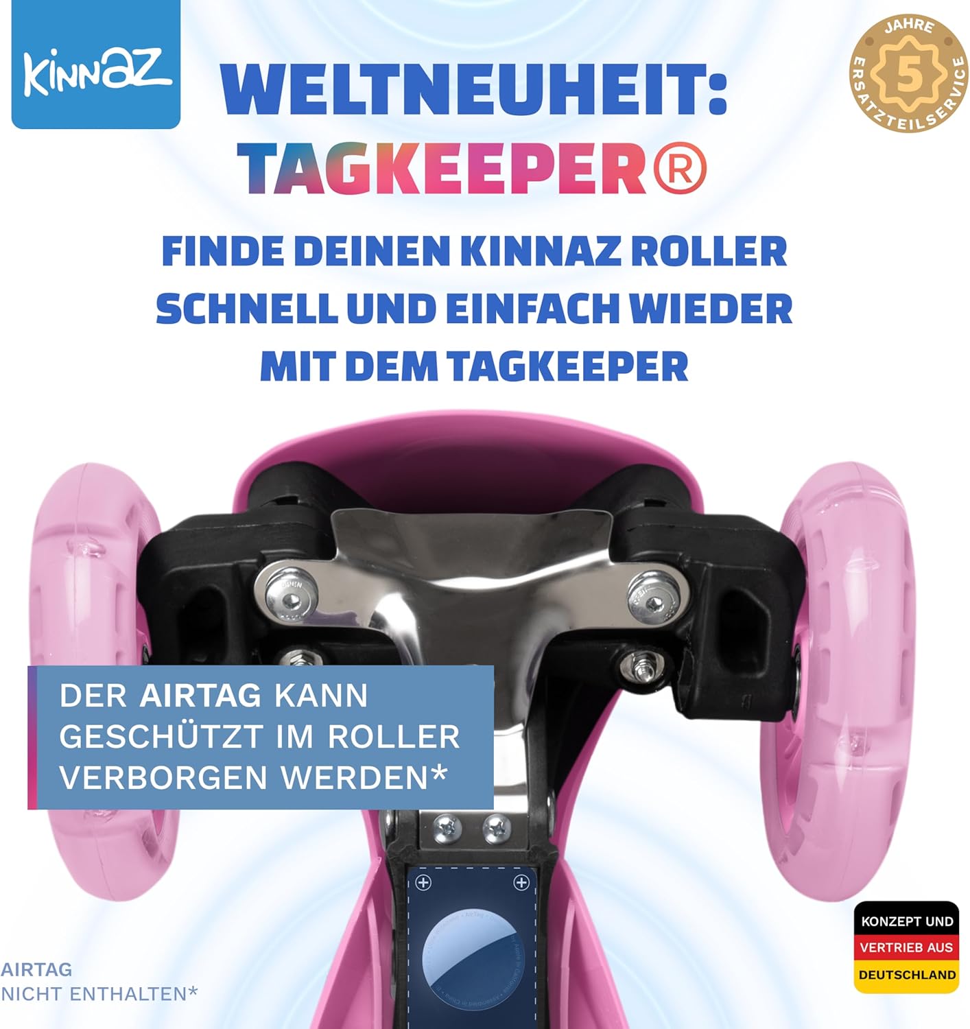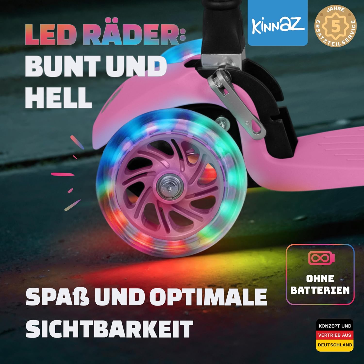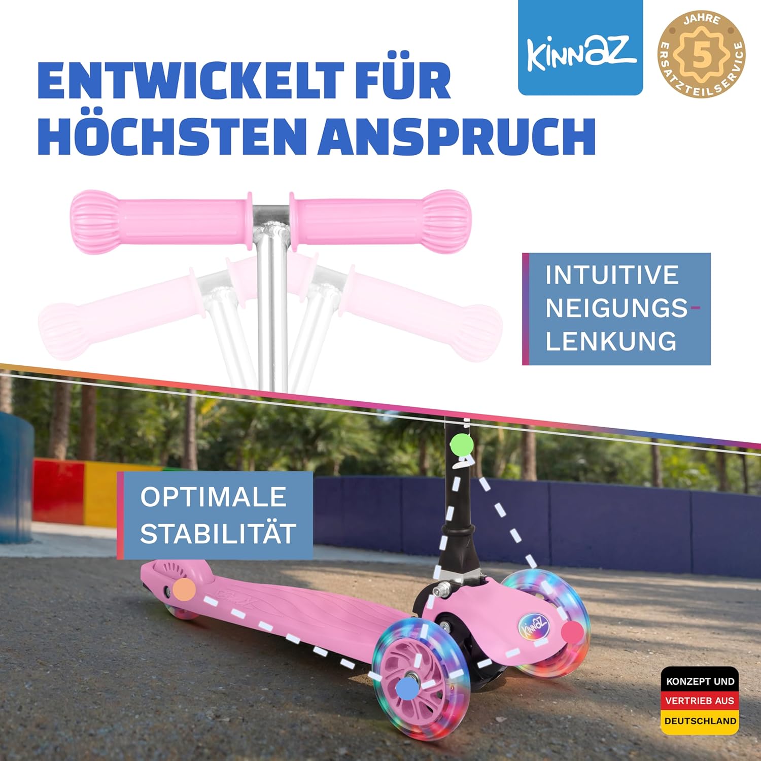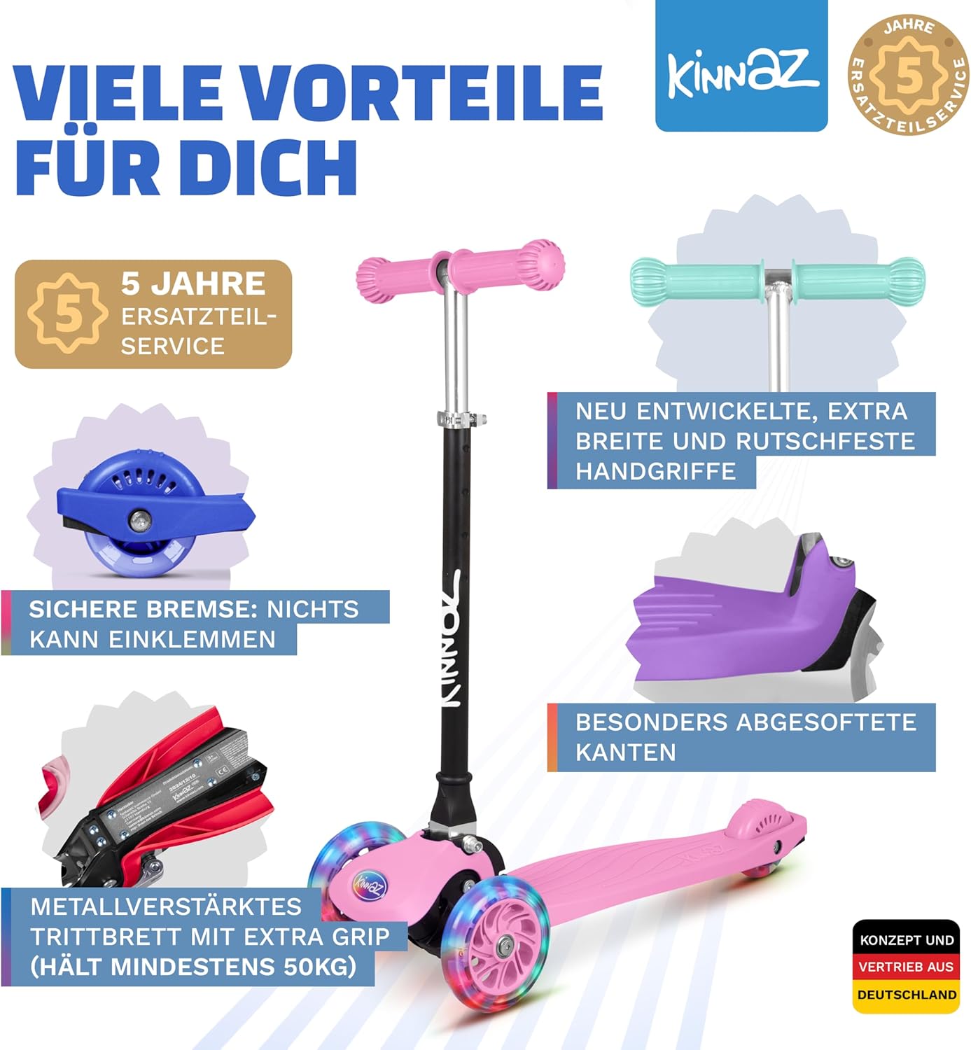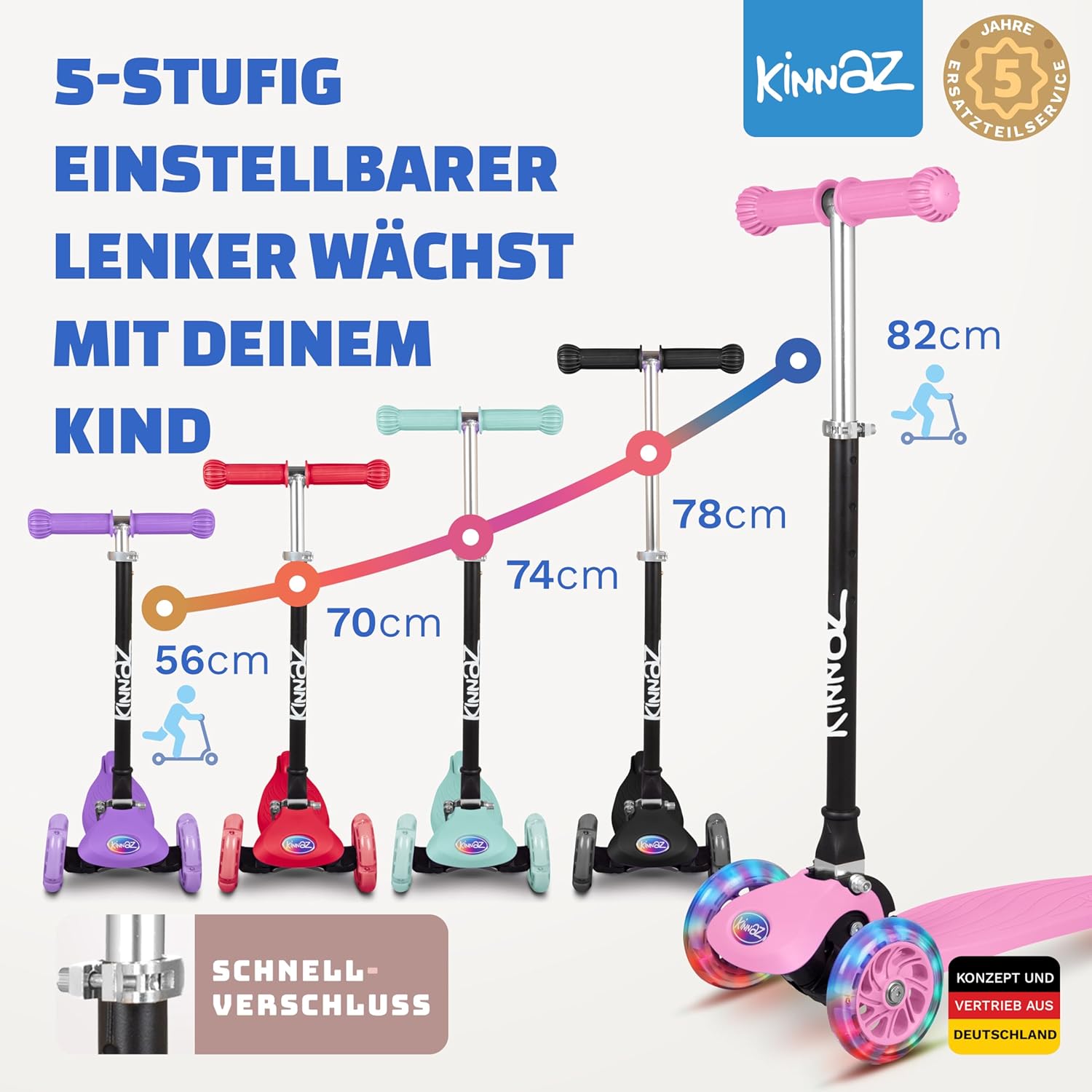 Regolabile in altezza e pieghevole: il manubrio è regolabile in 5 modi e può essere piegato in modo sicuro: lo scooter è quindi adatto come monopattino per bambini a partire da 2 anni, monopattino per bambini a partire da 3 anni, monopattino per bambini a partire da 4 anni e monopattino per bambini a partire da 5 anni! Adatto da 80-120 cm. Unico: solo da Kinnaz riceverete una fornitura sicura di pezzi di ricambio per 5 anni. Servizio invece di una discarica! Grandi ruote LED senza batterie. Maniglie di sicurezza innovative. Freno posteriore protetto dalla presa. Il primo Tagkeeper al mondo consente il rilevamento della posizione tramite AirTag (non incluso). Sicurezza, tradizione, innovazione: la nostra azienda familiare di Amburgo ha venduto oltre 100.000 scooter. L'ONE offre rinforzi in metallo, capacità di carico di 50 kg, bordi morbidi, freno sicuro e ruote scorrevoli. Misura adatta: il kinnaz ONE è ideale fino ad un'altezza di ca. 120cm. Successivamente consigliamo il Kinnaz DUE. Maggiori informazioni nel video dei consigli d'acquisto. Nota: uno scooter non può andare dai 3 ai 12 anni!