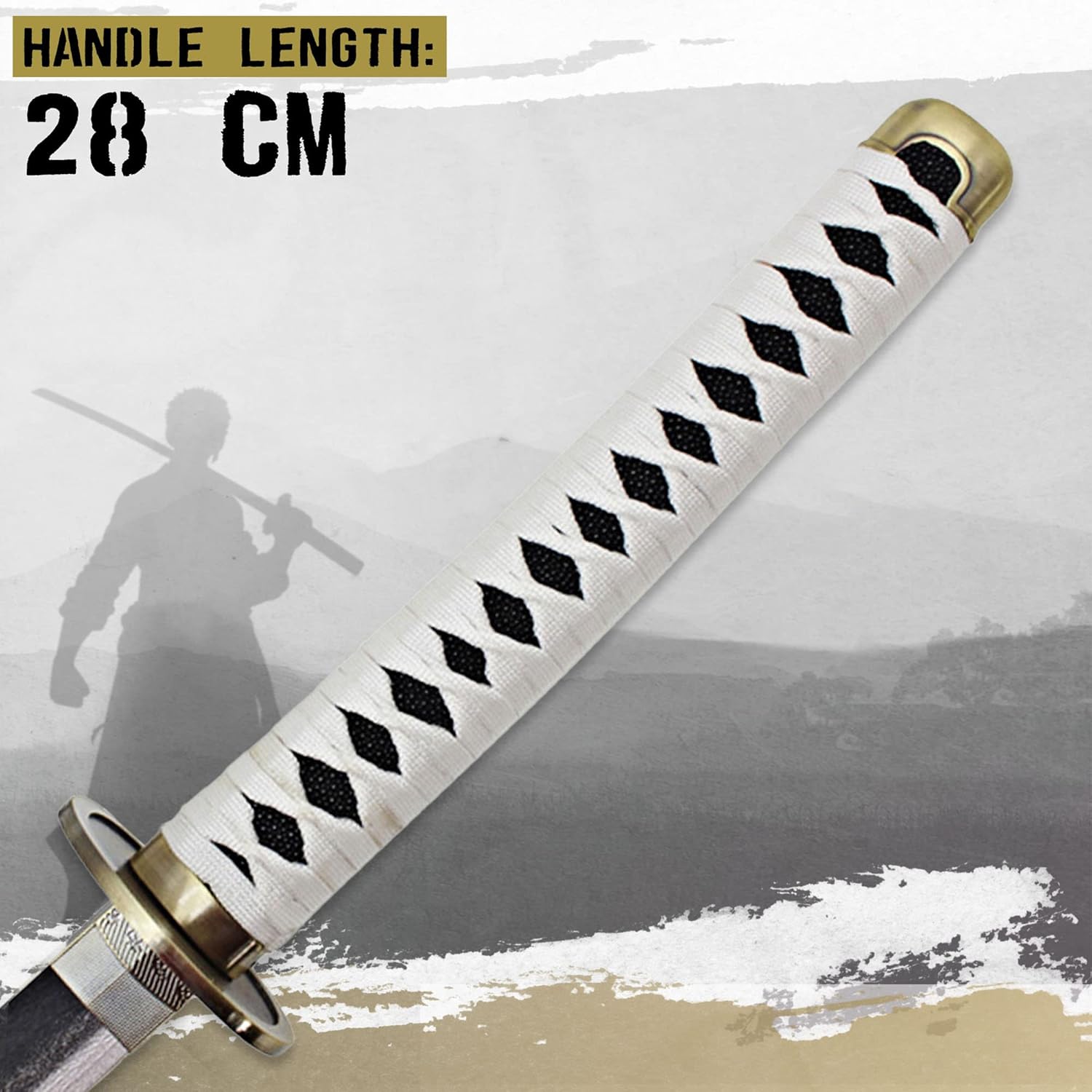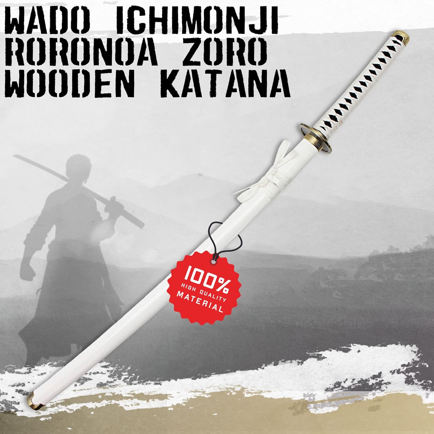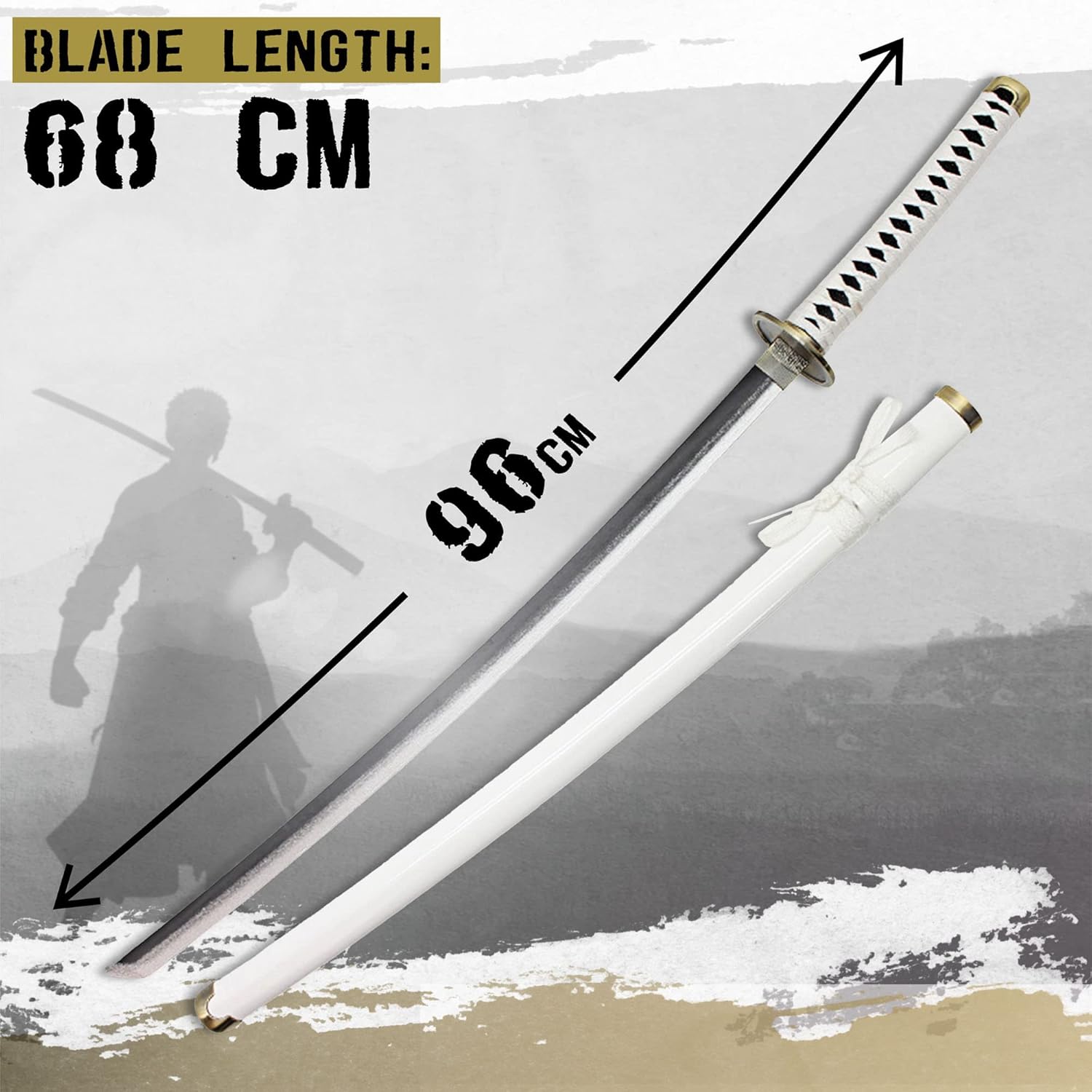 BIANCO PURO: Wado-Ichi-Monji Katana è una delle spade principali di Zoro. La lama di questo Wado Ichimonji ha una forma curva tradizionale che si trova su molte spade giapponesi. La spada presenta una tsuba circolare e un manico avvolto. Il fodero incluso è verniciato bianco lucido. Il suo attraente colore bianco dà alla spada il nome "BIANCO PURO". Una spada da samurai ideale per tutti i fan di One Piece. REPLICA PERFETTA: questa katana di bambù è una replica perfetta della katana dell'anime. L'aspetto, la lama e il manico sono tutti modellati sulla spada originale. È più leggero ed economico di una spada di metallo o di una katana. MATERIALE: La lama è in bambù, che è più leggera di una spada d'acciaio e ha una resistenza maggiore di una lama di legno. Il fodero e il paramano sono realizzati in plastica dura. La corda avvolta attorno al manico è in cotone, che assorbe efficacemente il sudore ed è antiscivolo. ACCESSORI PER COSTUMI DI ALTA QUALITÀ: il nostro prodotto è realizzato in bambù di alta qualità, durevole e robusto. Il look autentico completerà perfettamente il tuo cosplay di Zoro di One Piece. La lama non è affilata ed è molto leggera, sicura da usare. REGALO PERFETTO: questa spada One Piece è realizzata con attenzione ai dettagli. È un ottimo regalo per gli appassionati di anime e manga, collezionisti, cosplayer e partecipanti a feste in costume. Puoi usarlo per varie occasioni come Comic-Con, feste in costume, eventi cosplay, Halloween, ecc.