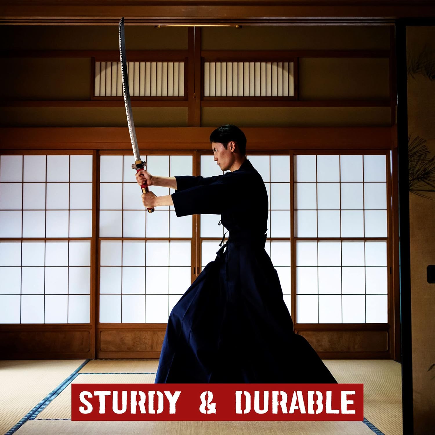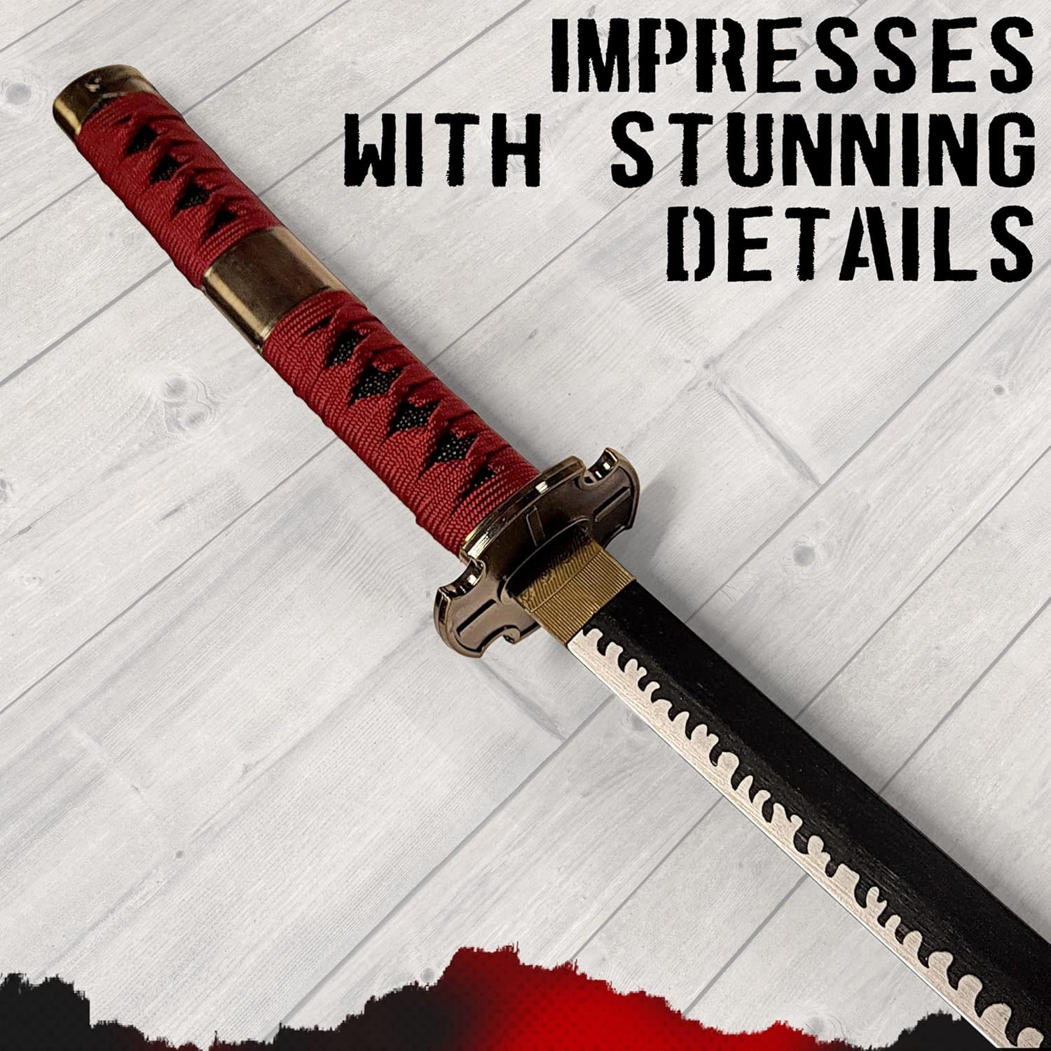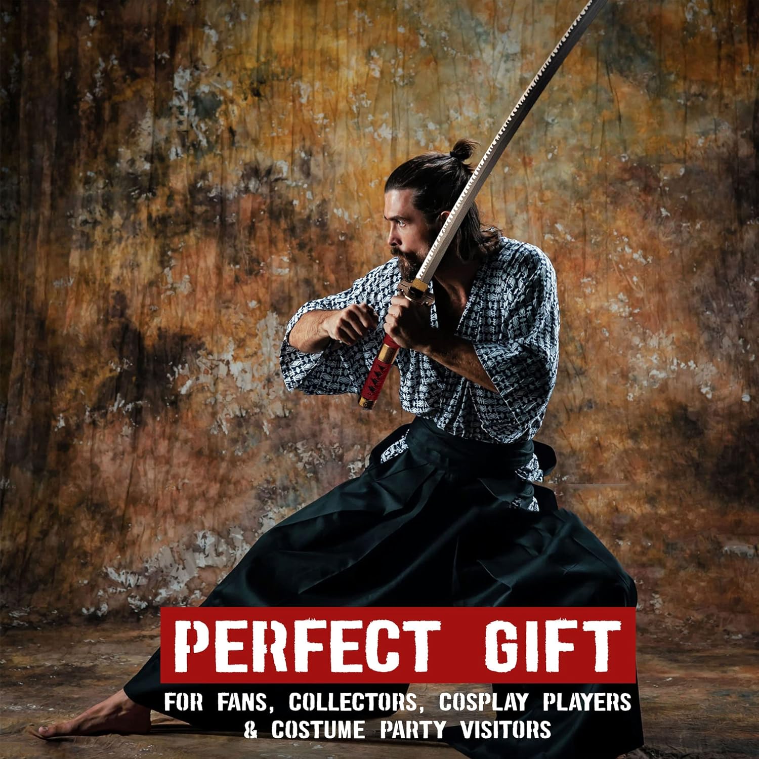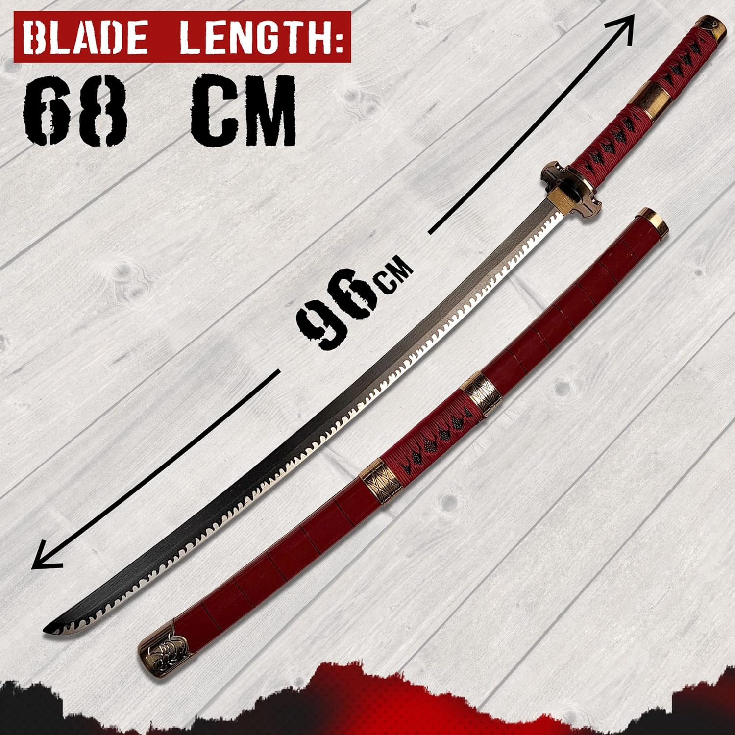 SPADA MALEDETTA: la nostra Sandai Kitetsu è una spada katana curva. La lama di guardia (Tsuba) è dorata e ha la forma di una croce a forma di zampa arrotondata. C'è una parentesi dorata nel mezzo. La fornitura comprende un fodero in legno duro laccato nero. Questa è la spada da samurai ideale per i fan di One Piece. REPLICA PERFETTA: questa katana di bambù è una replica perfetta della katana dell'anime. L'aspetto, la lama e il manico sono tutti modellati sulla spada originale. È più leggero ed economico di una spada di metallo o di una katana. MATERIALE: La lama è in bambù, che è più leggera di una spada d'acciaio e ha una resistenza maggiore di una lama di legno. Il fodero e il paramano sono realizzati in plastica dura. La corda avvolta attorno al manico è in cotone, che assorbe efficacemente il sudore ed è antiscivolo. ACCESSORI PER COSTUMI DI ALTA QUALITÀ: il nostro prodotto è realizzato in bambù di alta qualità, durevole e robusto. Il look autentico completerà perfettamente il tuo cosplay di Zoro di One Piece. La lama non è affilata ed è molto leggera, sicura da usare. REGALO PERFETTO: questa spada One Piece è realizzata con attenzione ai dettagli. È un ottimo regalo per gli appassionati di anime e manga, collezionisti, cosplayer e partecipanti a feste in costume. Puoi usarlo per varie occasioni come Comic-Con, feste in costume, eventi cosplay, Halloween, ecc.