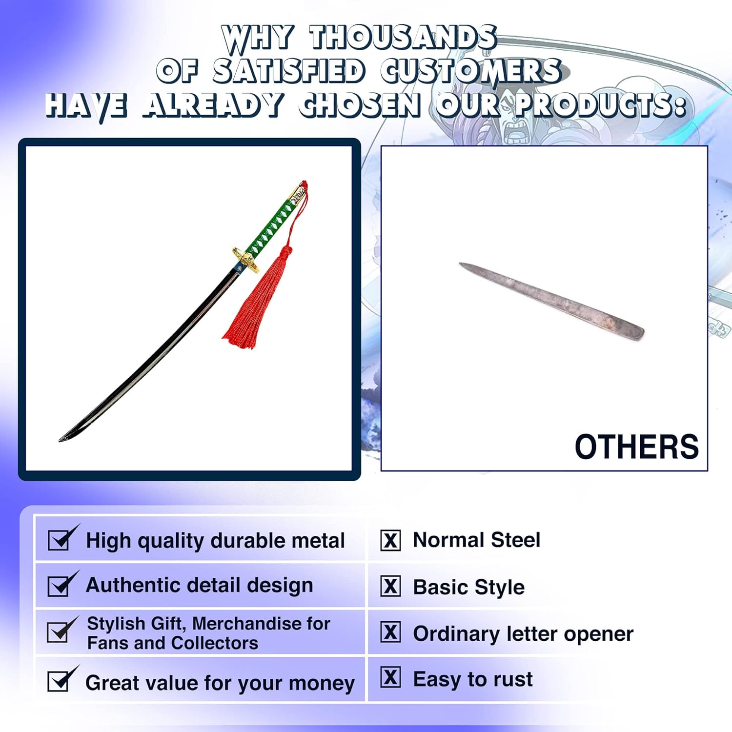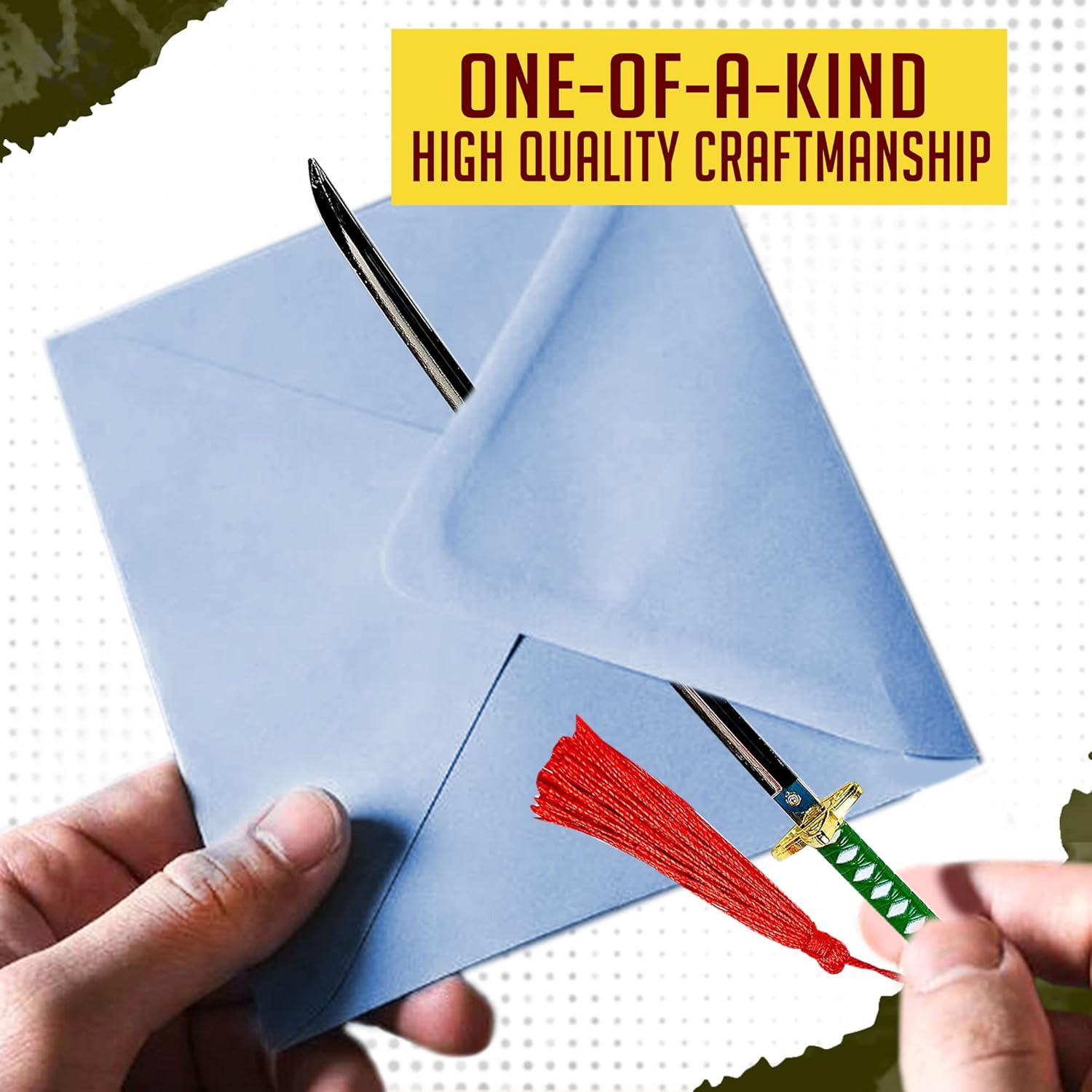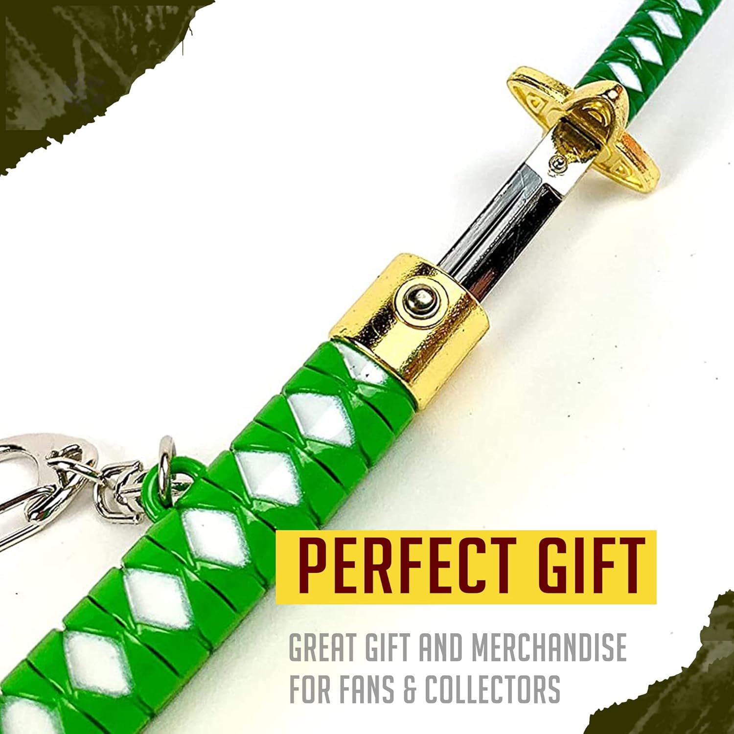 SHIGURE: La nostra katana Shigure ha un manico verde e un paramano dorato a forma di quattro petali. Il fodero è realizzato ad arte, con la prima metà verde come il manico, la seconda metà bianca e liscia. Sulla parte bianca del fodero sono presenti decorazioni circolari. Questa è la spada da samurai ideale per i fan di One Piece. MATERIALE DI ALTA QUALITÀ: questa katana anime è realizzata in materiale di alta qualità, resistente e robusto. Questo lo rende adatto come spada tagliacarte o apripacchi per tutti i tipi di carta. Può anche essere usata come spada in miniatura per il gioco. Il materiale durevole consente anni di utilizzo intenso. DIMENSIONE IDEALE: questa spada monopezzo è lunga 23,4 centimetri e pesa 0,14 chilogrammi. Si adatta facilmente allo zaino. Puoi anche tenerlo facilmente in un cassetto per uso ufficio. È anche un ottimo pezzo da collezione e decorativo poiché puoi esporlo ovunque. UNICA E FUNZIONALE: la nostra spada giapponese è un bel oggetto decorativo per la tua casa e un ottimo prodotto funzionale per il tuo ufficio. È stato realizzato con attenzione ai dettagli per creare una bellissima spada. Viene direttamente da One Piece per accogliere buste e pacchi. Con il portachiavi puoi attaccare la spada katana al portafoglio, alla cintura, alla scrivania, al muro o ovunque. OTTIMO REGALO: i fan dei samurai e dei ninja, così come gli appassionati di anime e manga, adoreranno il nostro tagliacarte. Può essere utilizzato come elemento decorativo per qualsiasi stanza, come l'ufficio, il soggiorno o la sala giochi, ma anche come funzionale accessorio da ufficio per aprire le lettere. È il regalo perfetto per un compleanno, Natale, Capodanno, ecc.