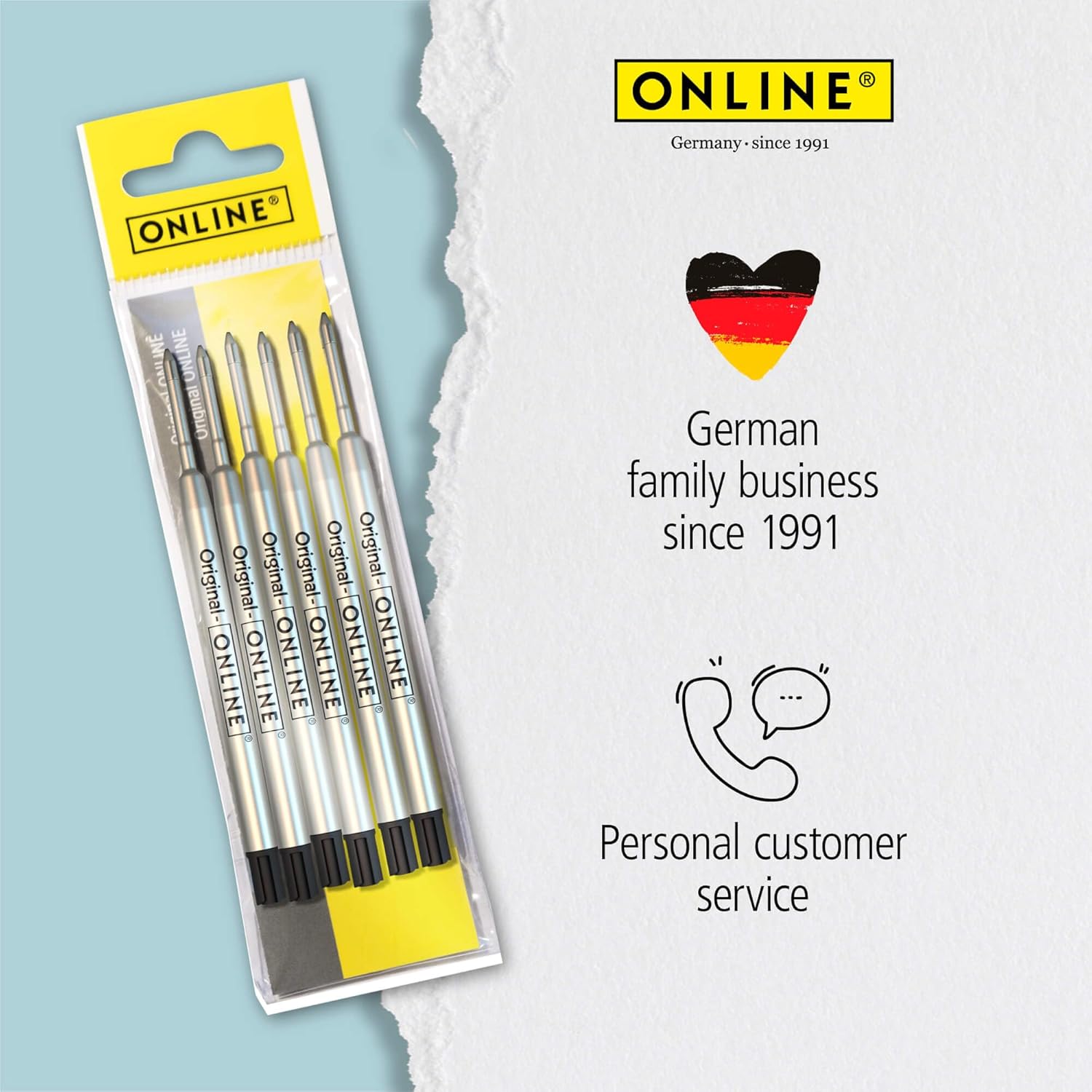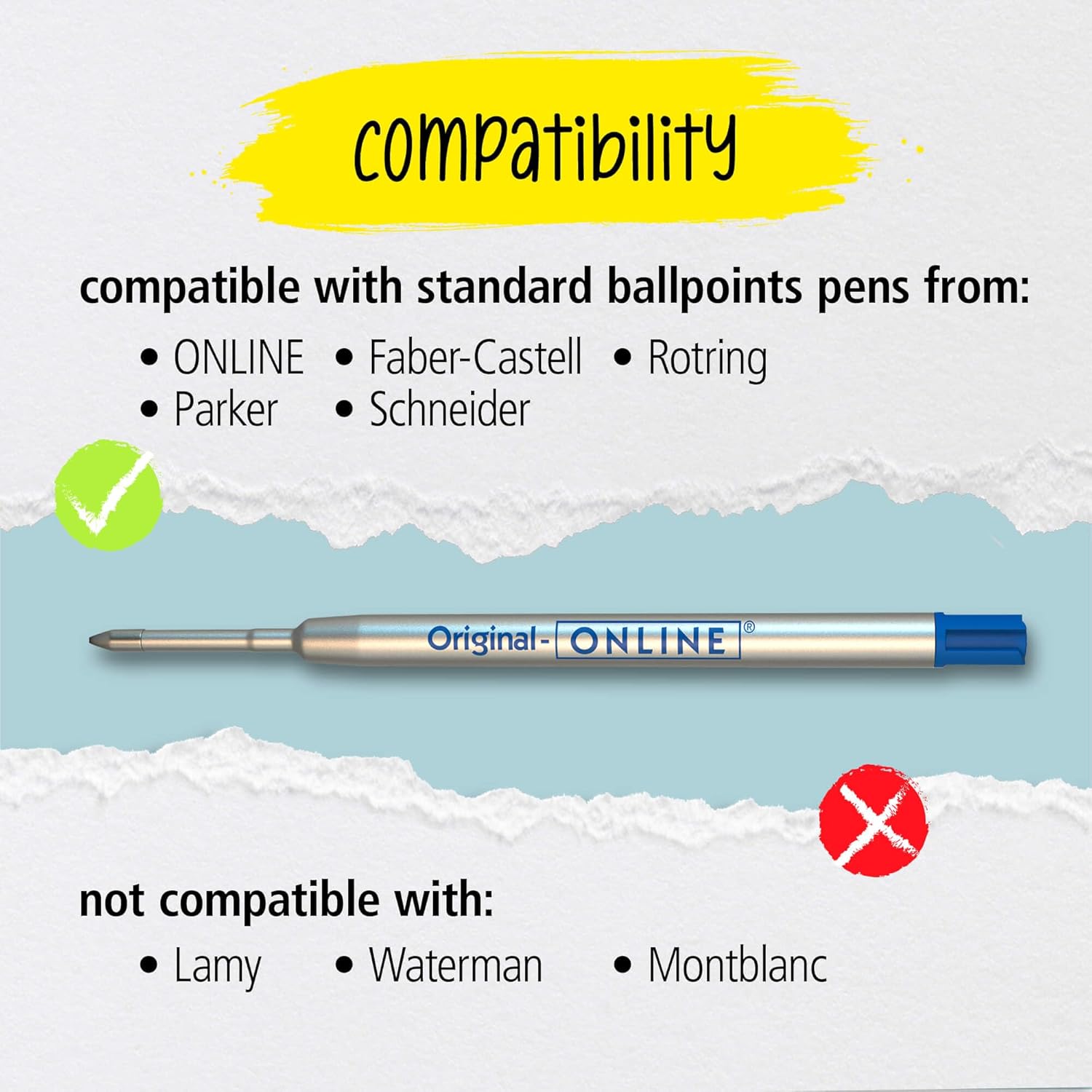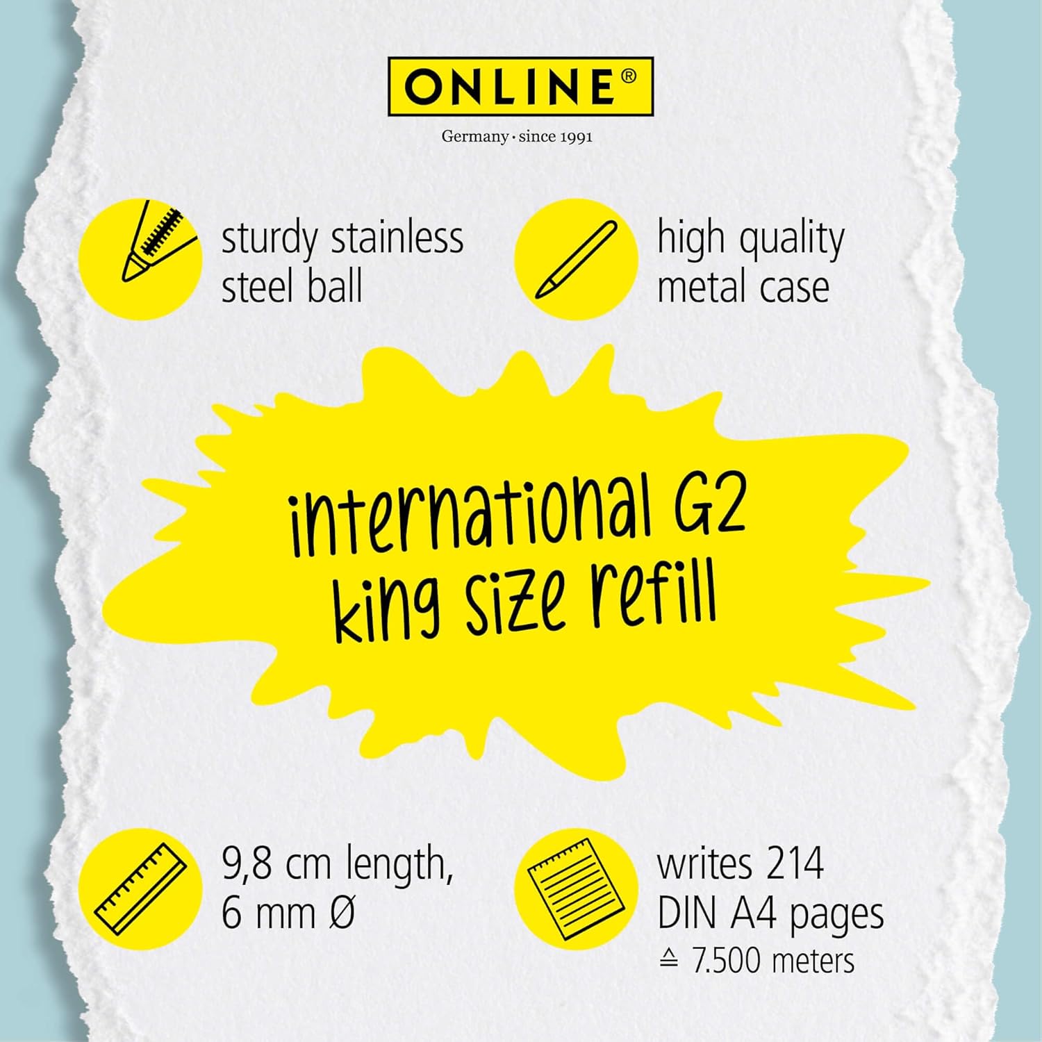 PER LA VOSTRA PENNA PREFERITA: Continuate a utilizzare le vostre biro preferite con le pratiche ricariche di Online. Le ricariche standard internazionali a grande capacità si adattano a tutti i modelli di biro a grande capacità più comuni. LUNGA SCRITTURA: ogni singola ricarica ha una lunghezza di scrittura di circa 7.500 metri. Ciò corrisponde a 215 pagine DIN A4. CONFEZIONE VANTAGGIO: il set da 6 include 6 ricariche nel colore di scrittura nero. FORMATO STANDARD: ogni ricarica ha un involucro metallico di alta qualità e scrive a prova di documento, tropicalizzato e resistente all'acqua in linea di larghezza M con sfera in acciaio inossidabile, certificato ISO 12757-2 G2. QUALITÀ DEL MARCHIO ONLINE: Online è un'azienda tedesca dal 1991, specializzata in strumenti di scrittura, set per calligrafia, astucci e molto altro.