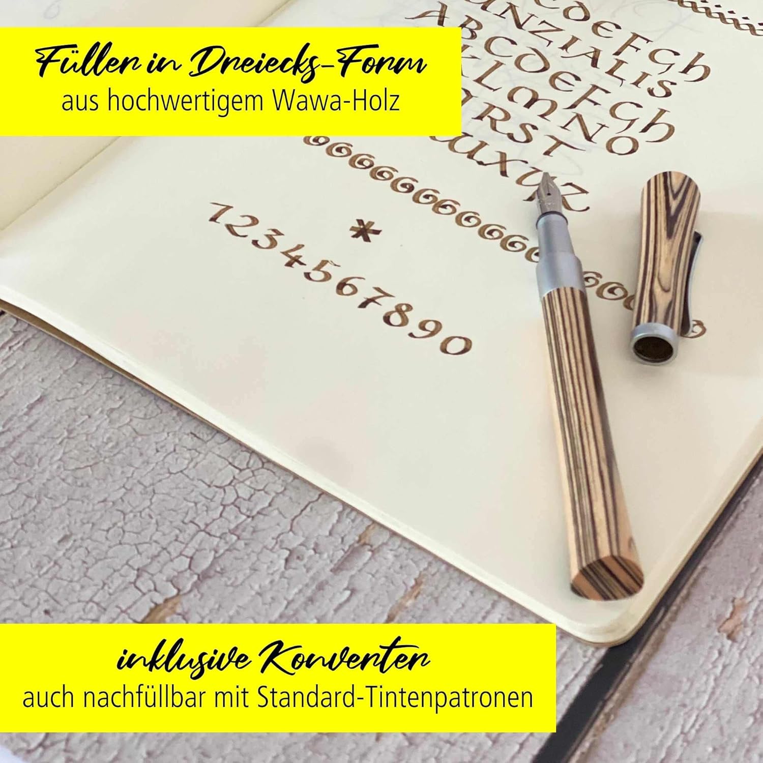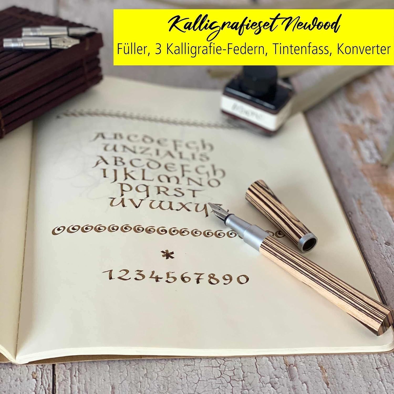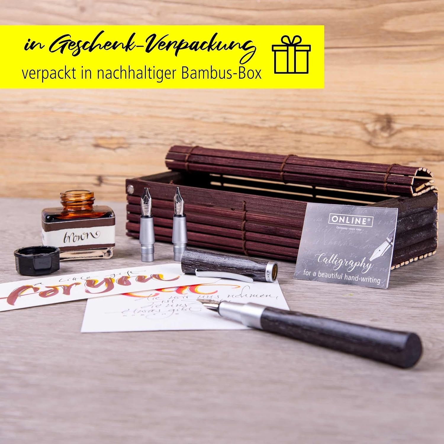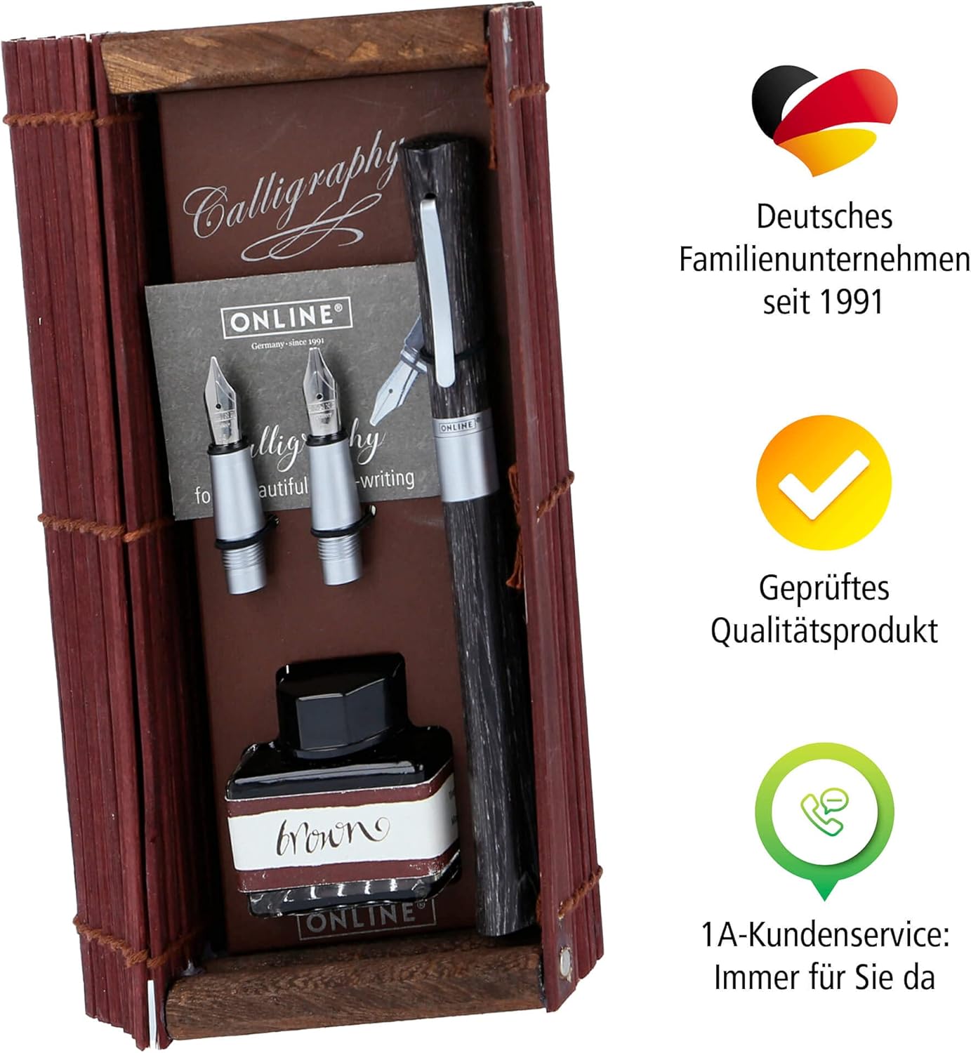 PER GLI ESTETI: La calligrafia è di moda. Con il set per calligrafia di Online puoi dare alla tua calligrafia ancora più carattere. BELLISSIMO SET SCRITTURA: la penna stilografica calligrafica di design colpisce per la sensazione naturale del legno Wawa a forma triangolare. Il set comprende: penna stilografica, due manici aggiuntivi, pennini con tre larghezze di tratto (0,8, 1,4 e 1,8 mm), una boccetta d'inchiostro con inchiostro marrone e un convertitore per cartucce standard. MADE IN GERMANY: Online è un'azienda tedesca con qualità del prodotto testata. I pennini per calligrafia sono realizzati a mano, sono di qualità particolarmente elevata e possono essere facilmente sostituiti grazie al sistema di cambio facile. PRINCIPIANTI E PROFESSIONISTI: con un po' di pratica e i principianti della calligrafia possono ottenere bellissimi risultati sulla pagina con la penna stilografica per calligrafia. La penna stilografica attira l'attenzione anche per i professionisti. IDEA REGALO: il set per calligrafia viene fornito in un'elegante confezione regalo in legno di bambù. Una meravigliosa sorpresa per gli appassionati di scrittura dei personaggi!