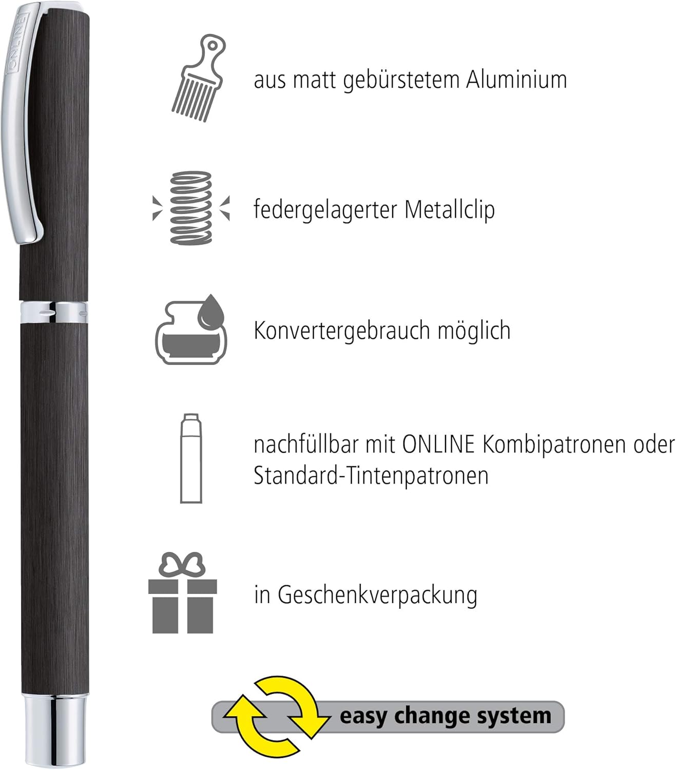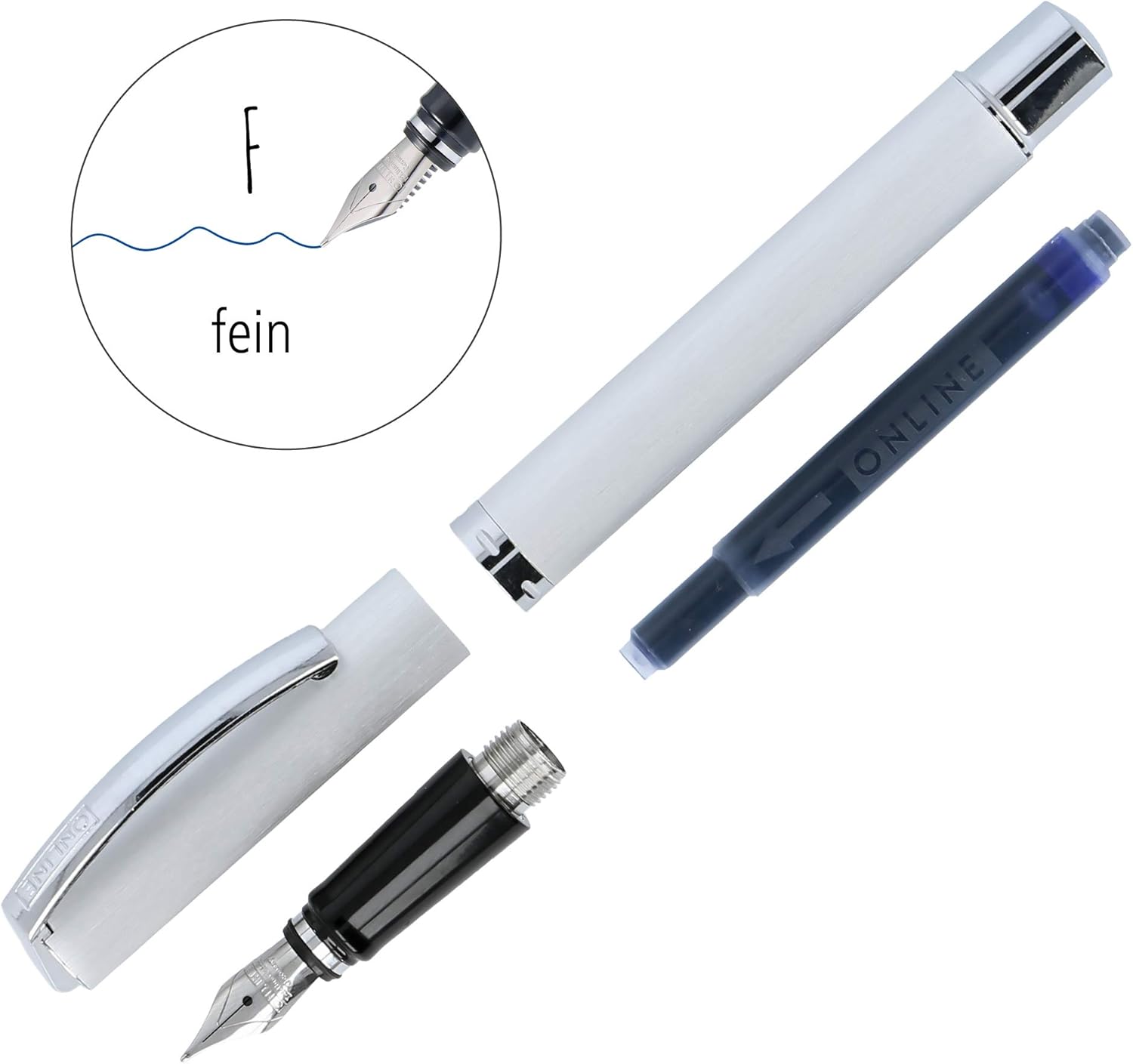 ELEGANZA SEMPLICE: la penna stilografica dal design ONLINE colpisce per il suo aspetto semplice e di alta qualità, una robusta superficie in alluminio e una clip in metallo caricata a molla. Insieme alla confezione regalo è un regalo ideale per gli amanti delle forme chiare e della tecnologia precisa – e attirerà sicuramente l'attenzione all'università o in ufficio. MOLLA CAMBIABILE: L'elegante molla in iridio di forza F (fine) può essere facilmente sostituita utilizzando il pratico “Easy Change System”. A seconda delle vostre esigenze e preferenze, la penna stilografica può essere utilizzata per diverse larghezze di tratto. IL COMFORT È NEL DETTAGLIO: Dotata di una comoda zona di presa in acrilico, la penna stilografica garantisce un piacere di scrittura lungo e rilassato, senza mani dolorose e anguste. CARTUCCE E CONVERTITORI: I convertitori e tutte le comuni cartucce d'inchiostro standard sono adatti per la penna stilografica per adulti. Per una scrittura extra lunga, consigliamo le cartucce d'inchiostro combinate ONLINE in formato grande capacità, perché niente è più fastidioso che rimanere all'asciutto durante il picco creativo. OFFLINE CON ONLINE - IL MARCHIO ONLINE DI QUALITÀ: Noi di ONLINE siamo un'azienda familiare tedesca che dal 1991 produce con entusiasmo e passione articoli di cancelleria di alta qualità, innovativi, funzionali e dal design accurato e porta gli amanti della scrittura nel mondo della creatività.