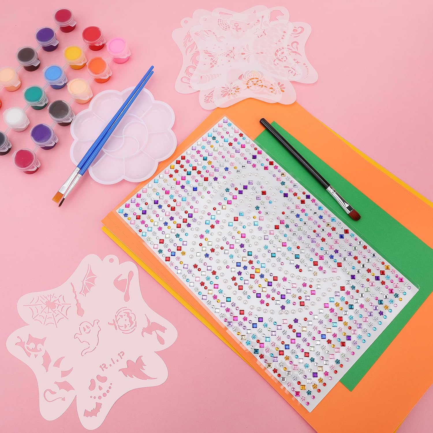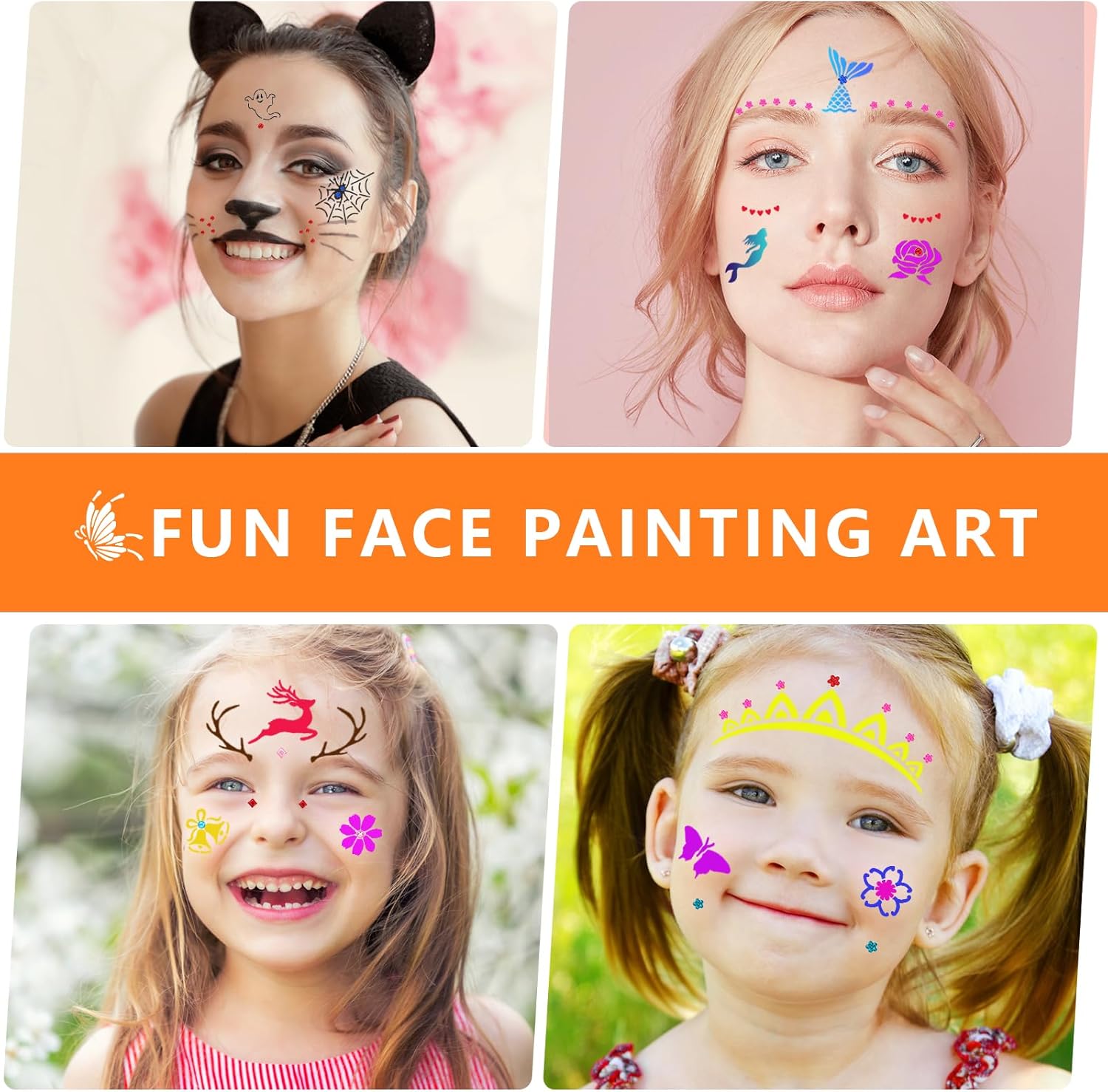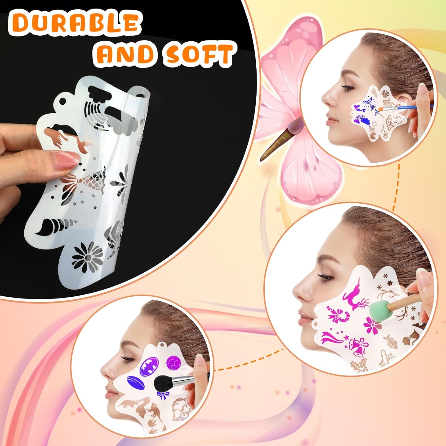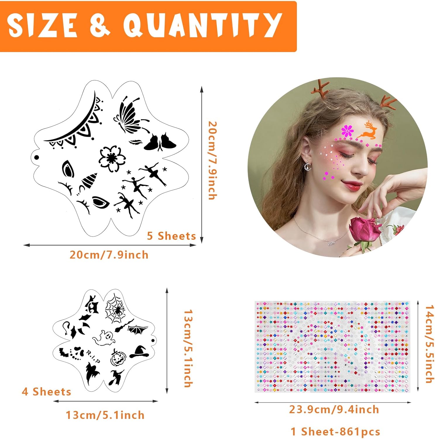 🎨Stencil per dipingere il viso: Il set comprende 9 stencil per la pittura del viso con vari motivi divertenti e creativi: 5 fogli 20x20cm e 4 fogli 13x13cm, adatti a diverse fasce d'età. Aggiungete motivi divertenti su volti e altre parti del corpo durante festival, feste, ecc. 💎Adesivi con gemme colorate: La confezione include anche 861 pezzi di adesivi gioiello colorati e scintillanti in 4 forme diverse per aggiungere fascino al viso e alla body art. Perfetti per aggiungere fascino al viso e al corpo, all'artigianato fai da te e alla vita quotidiana. ✨Riutilizzabili e durevoli: Questi stencil per body art sono realizzati in materiale PET di alta qualità, affidabile e robusto, non facile da rompere. È possibile utilizzare facilmente questi stencil per dipingere sul viso o sul corpo e ottenere risultati attraenti. 🌟Facile da usare e da pulire: Non sono richieste competenze particolari! È sufficiente tenere lo stencil ben saldo sulla pelle e applicare la pittura per il viso con una spugna o un pennello da trucco. La pulizia successiva è altrettanto facile con acqua, salviette o sapone. 🌈Pittura del viso creativa: Con la combinazione di stencil per la pittura del viso e adesivi gioiello, scatenate la vostra immaginazione per creare disegni unici in pochissimo tempo. Perfetto per feste per bambini, Halloween, Natale o altre occasioni artistiche.