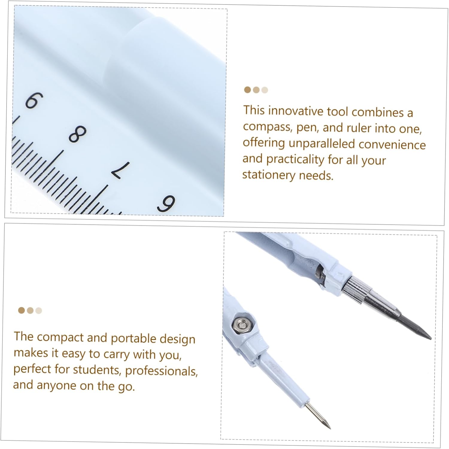 Bussola da disegno: questo strumento innovativo perfettamente con una bussola, una penna e un righello, fornendo funzionalità eccezionali per un'ampia di attività, bussola da carpenteria Bussola: realizzata in plastica e materiali metallici, questo strumento è costruito per durare, garantendo un uso a lungo termine e prestazioni affidabili, bussole in pelle Geometria delle scuole superiori: caratterizzato da un design elegante e raffinato, questo strumento aggiunge un tocco di e raffinatezza alla tua collezione di articoli di cancelleria ed estensori per matite Kit di geometria matematica: realizzato in plastica e materiali metallici, questo set è costruito per durare, fornendoti strumento affidabile per gli anni a venire, bussola da disegno per l'arte Kit di materiale scolastico: questo strumento innovativo combina le funzionalità di bussola, penna e righello, rendendolo un'aggiunta essenziale tuo kit di strumenti di disegno e misurazione, bussola tascabile