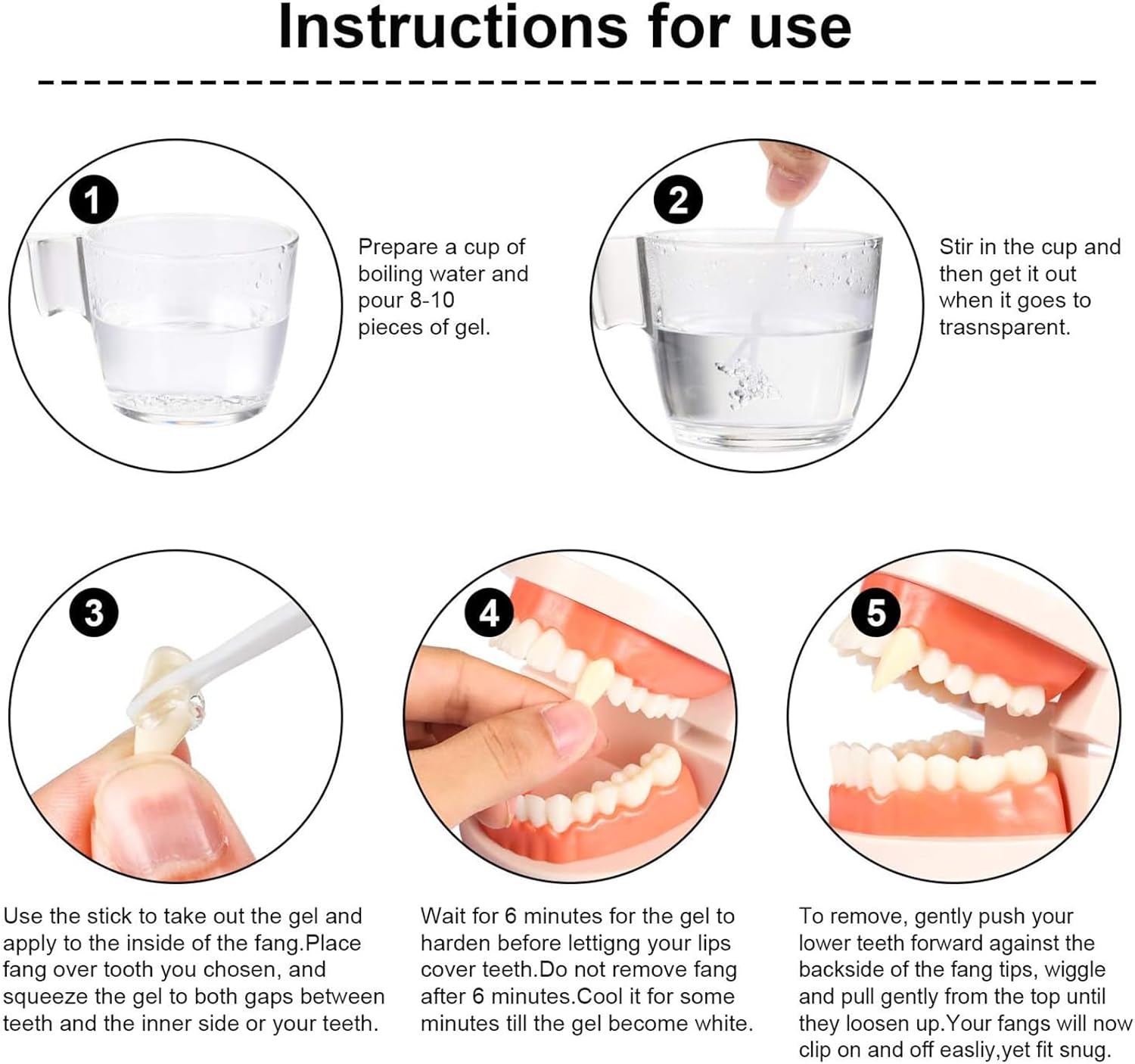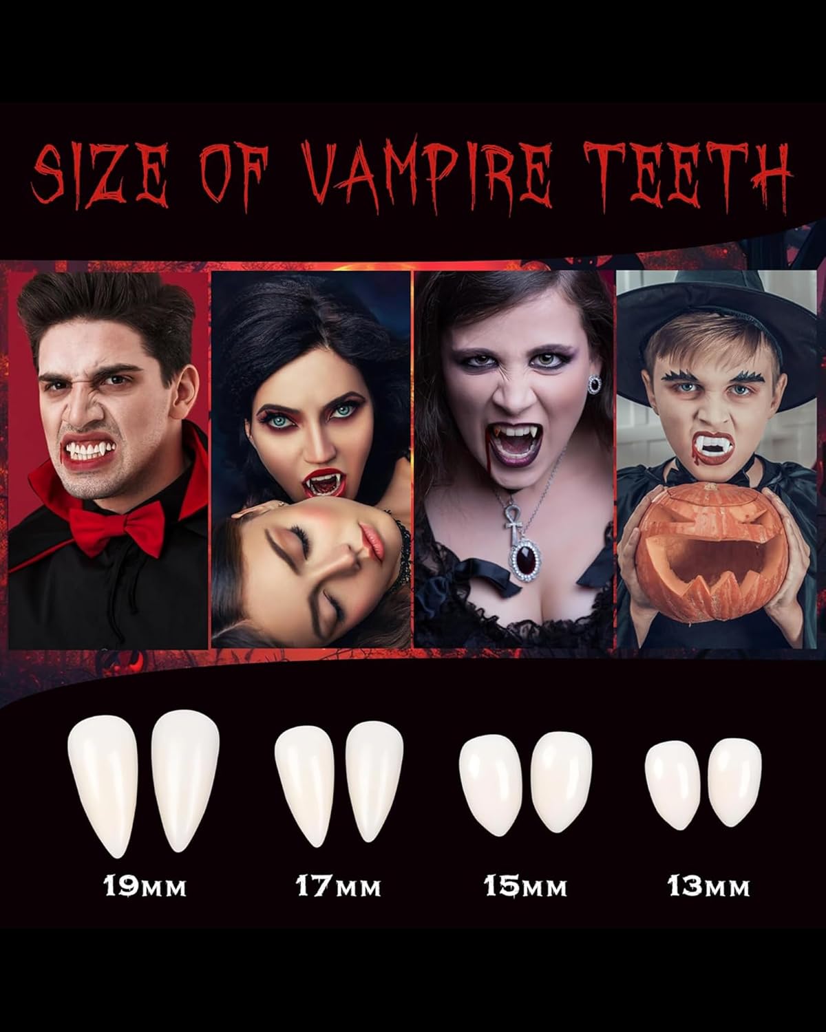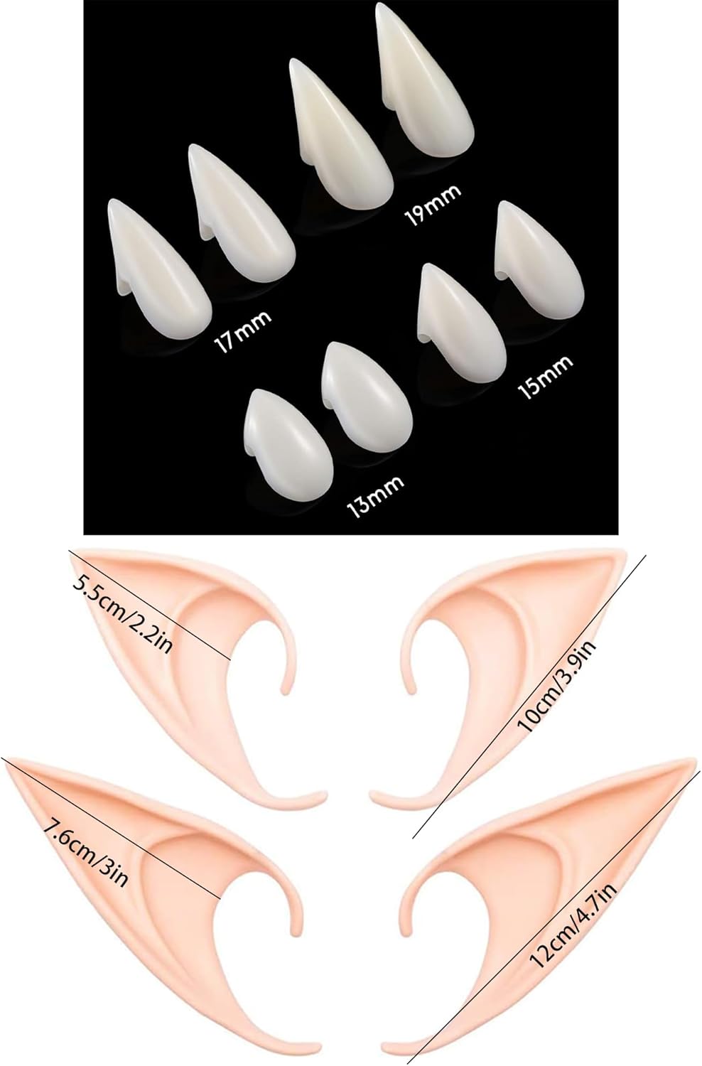 Diverse opzioni di dimensioni: 4 paia di denti da vampiro di diverse dimensioni (13 mm, 15 mm, 17 mm, 19 mm), 1 tubetto di colla dentale, 2 paia di orecchie da elfo in lattice, adatte per adulti e bambini. Materiale: morbido e confortevole, le orecchie possono essere piegate e schiacciate senza deformarsi e sono riutilizzabili. Se le orecchie sono deformate, basta metterle in acqua calda per ripristinare la loro forma originale. Istruzioni per l'uso per le orecchie da elfo: basta fissarle direttamente alle orecchie. Se si siedono un po 'sciolti, utilizzare del nastro biadesivo o applicare la colla per ciglia alla base delle orecchie per una presa più salda. Istruzioni per l'uso per i denti da vampiro: riscaldare le perline dentali con acqua calda fino a quando non diventano bianche a trasparenti e poi lasciare che l'acqua si scarichi. Premere la colla sui denti. Le perle si raffreddano rapidamente e si induriscono, in modo da poterle applicare facilmente e rapidamente Occasioni adatte: ideale per Halloween, Natale, cosplay, feste in maschera, carnevale, spettacoli teatrali, feste e vari altri eventi, per rendere più divertente te e i tuoi amici.
