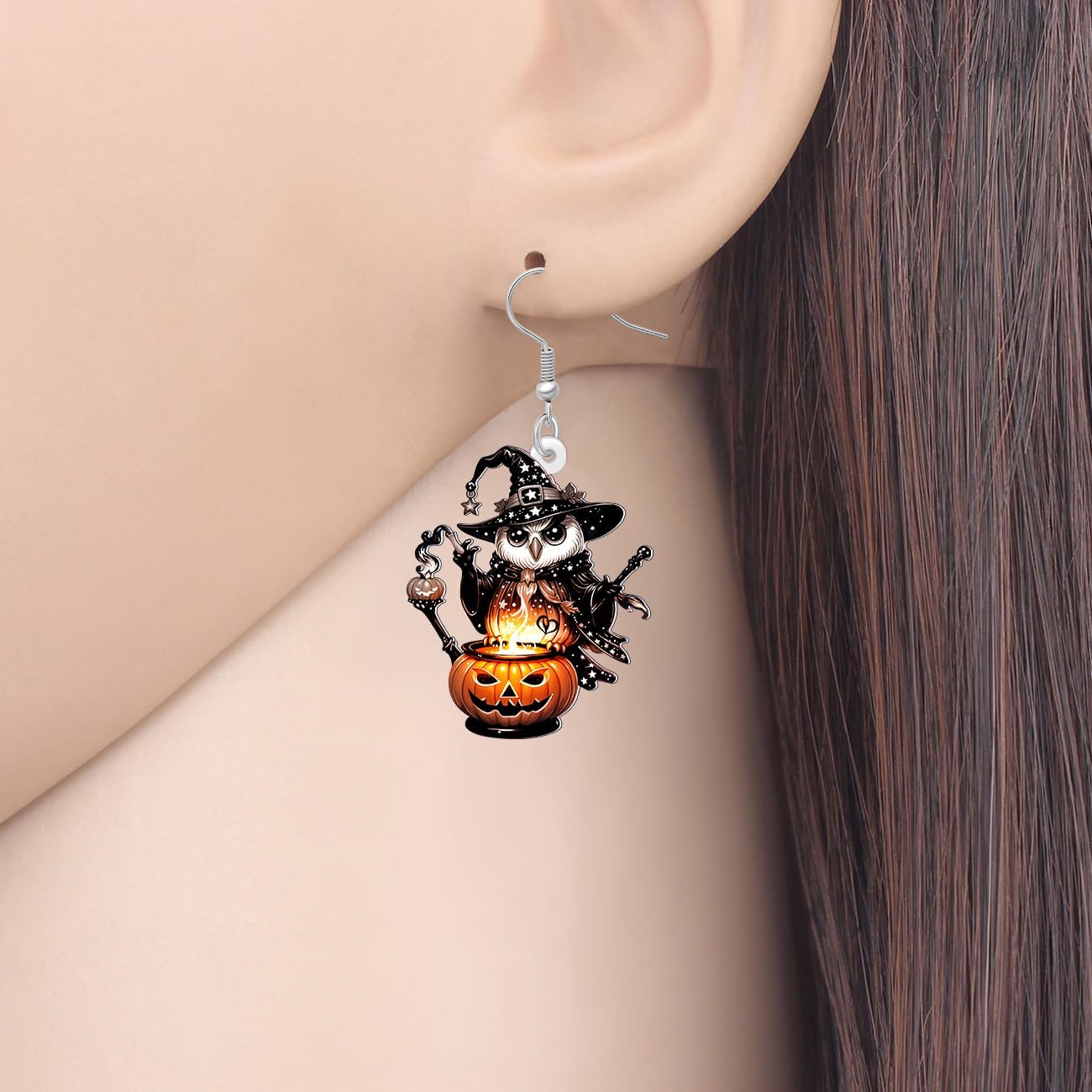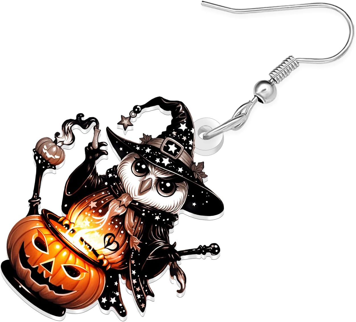Aggiungi un tocco di stravagante magia di Halloween al tuo outfit con questi incantevoli orecchini a forma di gufo. Ogni orecchino presenta un adorabile gufo mago appollaiato in cima a una lanterna incandescente, completo di un cappello da strega tempestato di stelle e bacchetta magica. Il design acrilico dettagliato mette in mostra colori vivaci che passano da neri profondi a blu mistici e calde tonalità arancioni, creando un effetto affascinante. Questi orecchini pendenti LONYOO sono forniti come una coppia abbinata, con ogni gufo che mostra dettagli affascinanti come occhi larghi, abiti decorativi e piccole stelle sparse in tutto il design. Perfetti per feste di Halloween, eventi in costume o per aggiungere un accento eccentrico al tuo stile quotidiano, questi orecchini leggeri sono deliziosi accessori per gli appassionati di gufo e gli amanti di Halloween. Le chiusure ad amo da pesca color argento garantiscono una vestibilità sicura e confortevole. Questi orecchini unici combinano elementi carini e spettrali per creare gioielli che iniziano la conversazione che attireranno sicuramente complimenti in qualsiasi riunione autunnale.