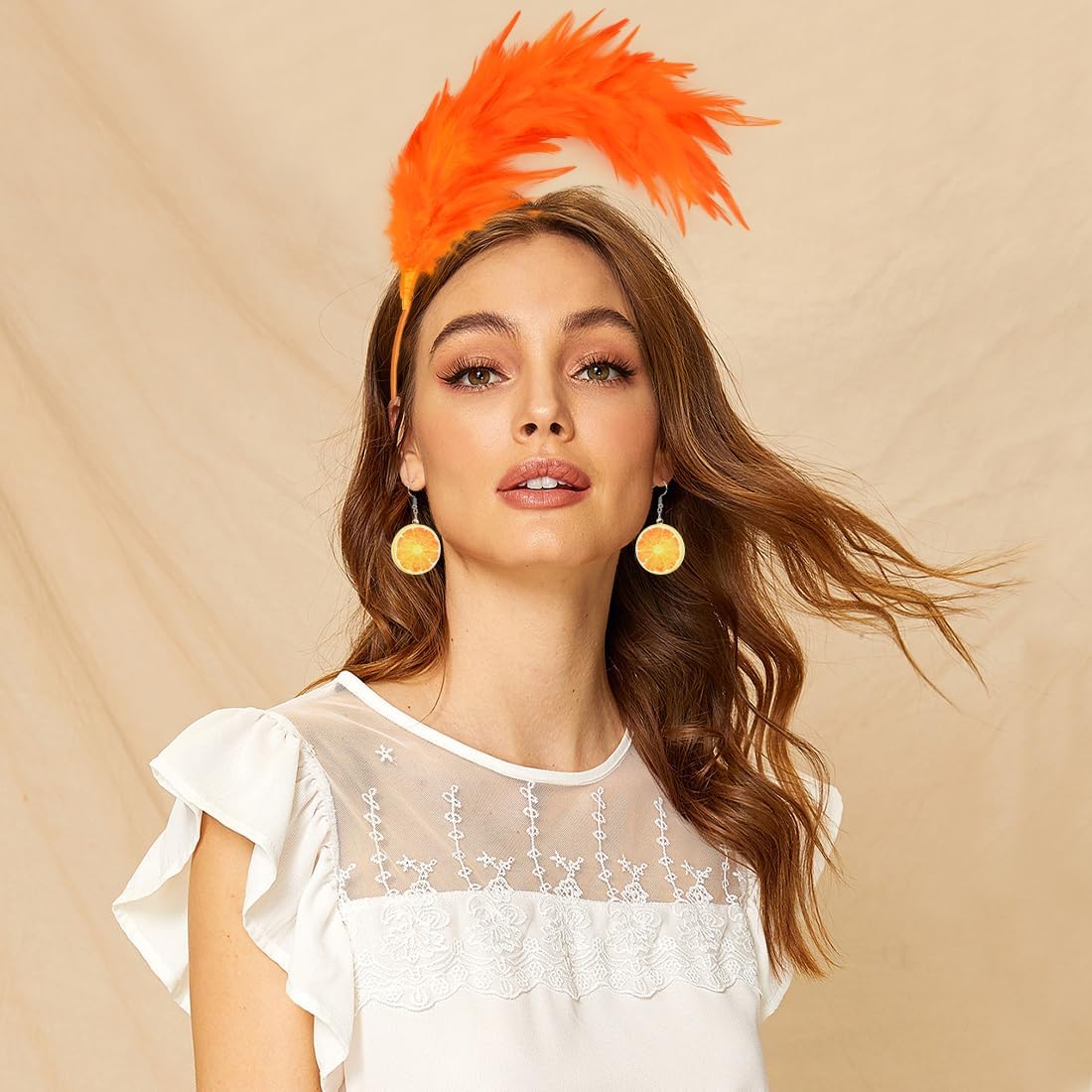 Orecchini Arancioni da Donna,Tiara Arancione, Fascia per Capelli con Piume e 1 paio di Orecchini con Frutta Arancione, Adatti per Carnevali, Mascherate e Spettacoli Teatrali