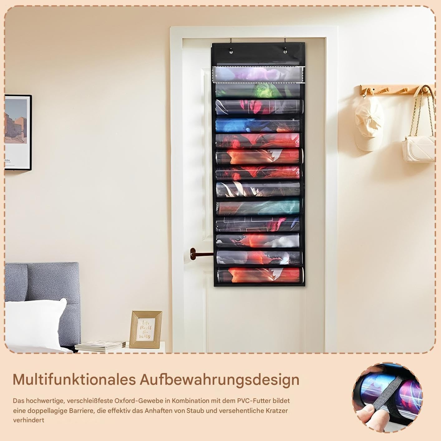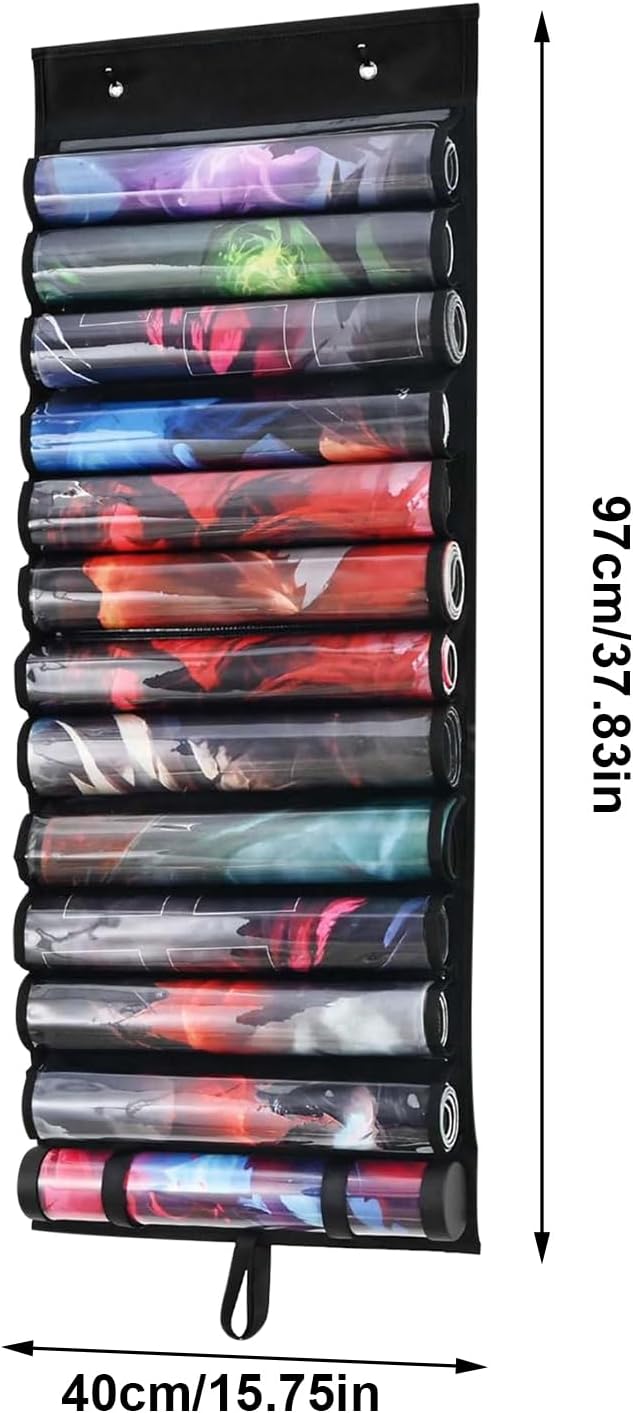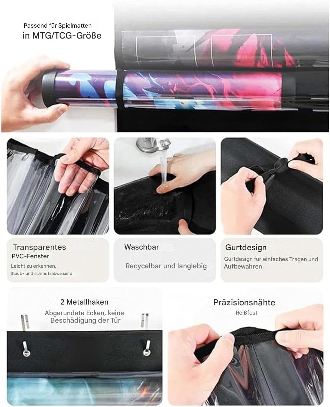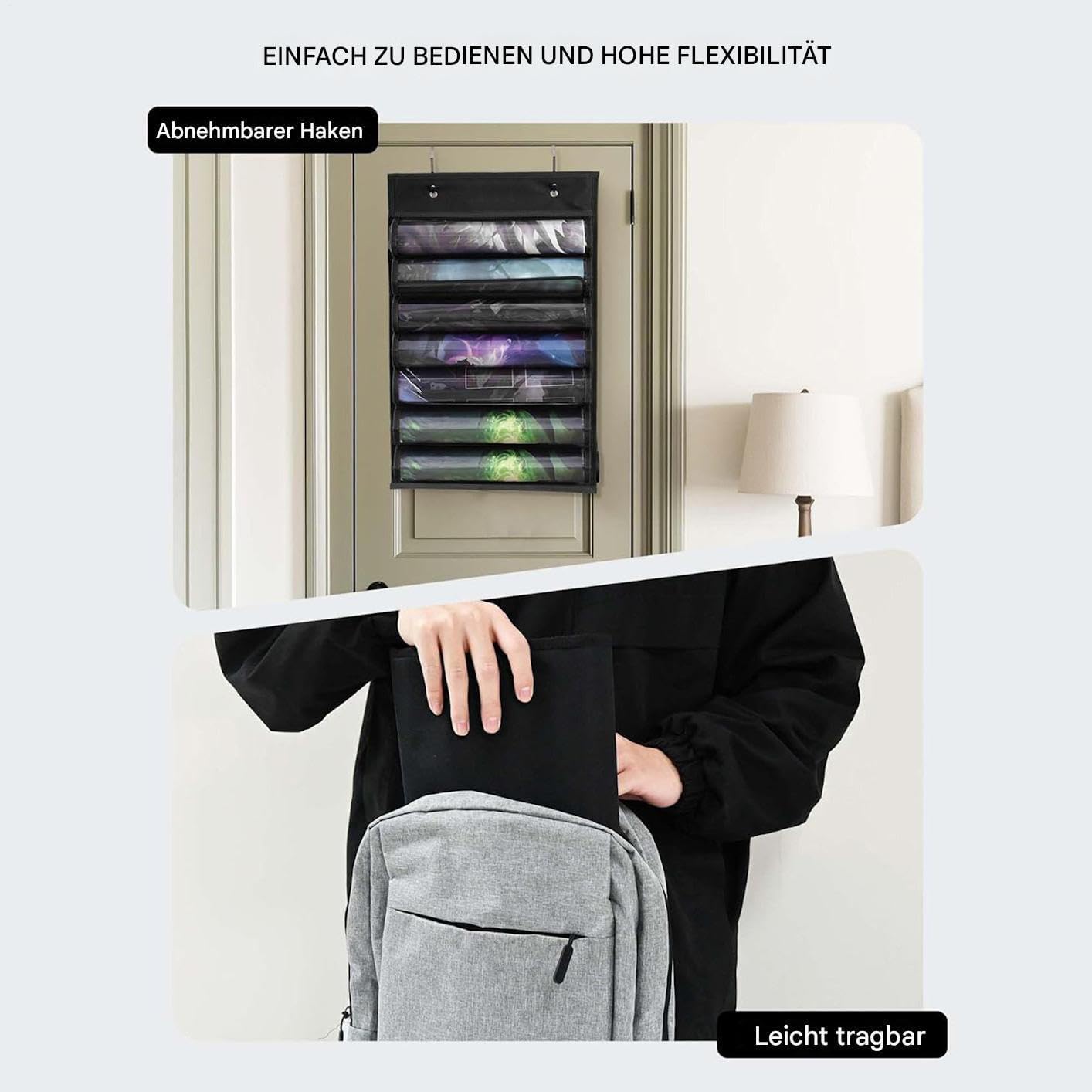 Durevolezza: materiali resistenti all'umidità come il tessuto Oxford e il rivestimento in PVC proteggono efficacemente da polvere, graffi e sporco. Mantiene la pulizia dei tappetini in modo affidabile e sostenibile. Guadagno spazio: verticale o a parete con doppio gancio per appendere ottimizza la superficie della scrivania e offre un'organizzazione visivamente accattivante per la tua area di gioco Conservazione sicura: con una base larga e rinforzata, questo supporto per tappetini da gioco organizza gli accessori da gioco in modo ordinato e previene il ribaltamento e la deformazione a lungo termine per una stabilità duratura. Ampio spazio di archiviazione: il supporto tubolare con tredici divisori può contenere in modo sicuro dodici tappetini regolari e un tappetino speciale, ideale per classificare diverse collezioni di accessori da gioco Posizionamento sicuro: i nastri adesivi regolabili eliminano i movimenti in stoccaggio, creano una chiara suddivisione dello spazio per un facile accesso agli accessori di gioco con supporto stabile