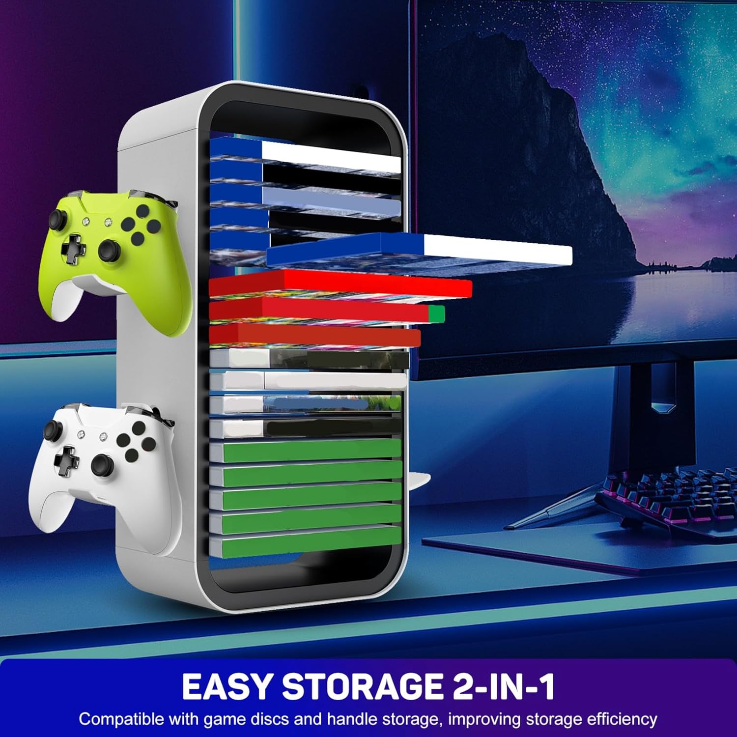 Organizer generale per dischi di gioco con 18 slot e 4 pin del controller per serie di console per configurazioni di gioco organizzate. La resistente torre di archiviazione in ABS presenta interfacce tagliate con precisione e assemblaggio senza attrezzi in meno di 2 minuti, offre 18 slot per dischi con scomparti per accessori per cuffie/controller. Ideale per i giocatori con più console che necessitano di consolidare raccolte di giochi e periferiche di gioco in uno spazio limitato. Mantieni il centro di intrattenimento o il gioco in soggiorno organizzato: conserva 18 dischi verticalmente mentre inserisci controller/cuffie a portata di mano. Realizzato in ABS antigraffio e giunti rinforzati. Questo piccolo organizer da 14" fornisce protezione a lungo termine per preziose librerie di giochi su piattaforme.