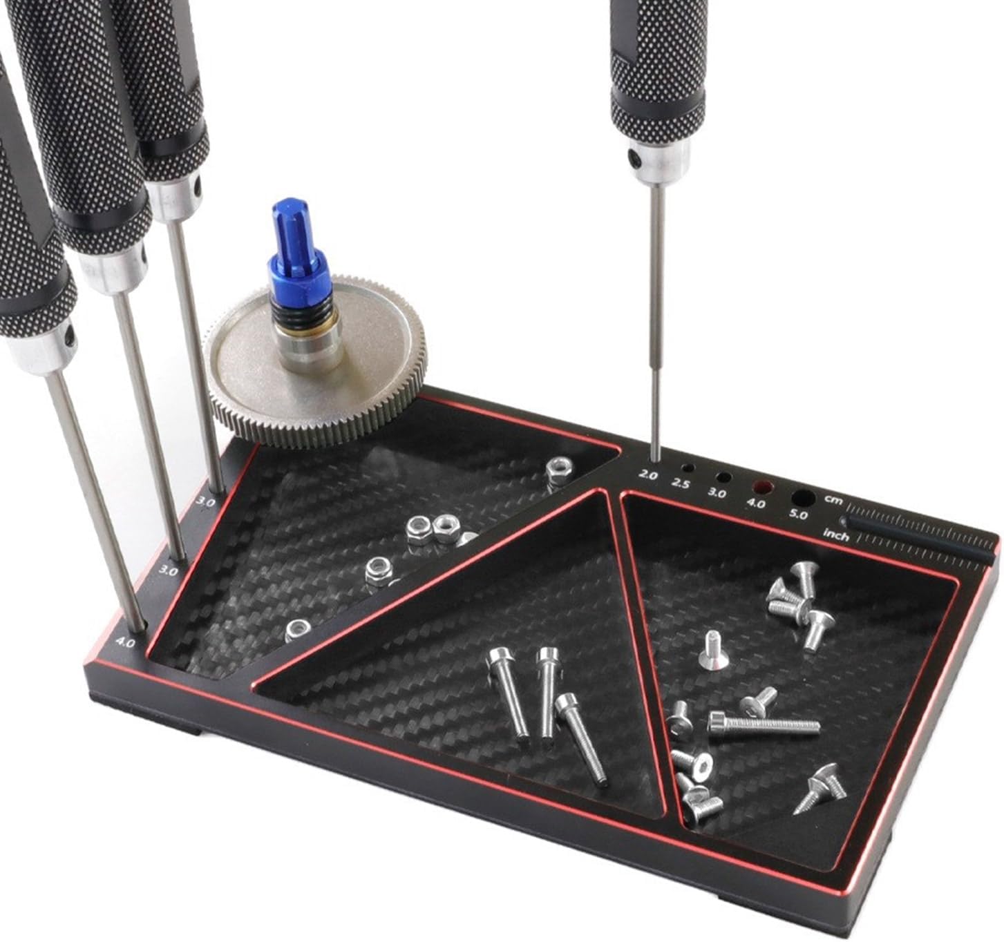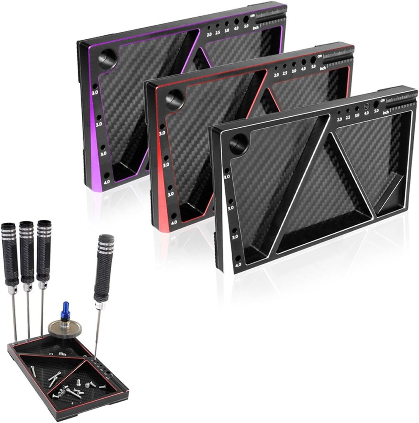 Questo vassoio presenta una struttura in alluminio resistente alla corrosione e tre scomparti Moda e scarso per l'organizzazione di tutte le piccole parti importanti e viti di fornitura Non importa se siete a casa, nei laboratori o in pista, questo vassoio è perfetto per mantenere i vostri piccoli oggetti al sicuro Ideale per meccanici, tecnici di riparazione e auto a distanza che lavorano spesso con piccoli componenti Migliora la tua esperienza di hobby con il guscio in alluminio
