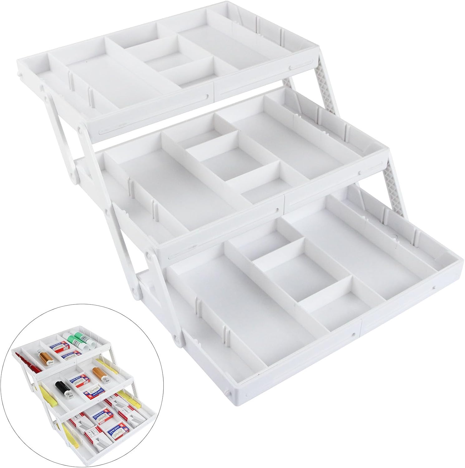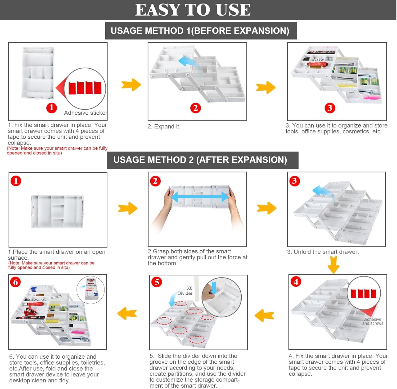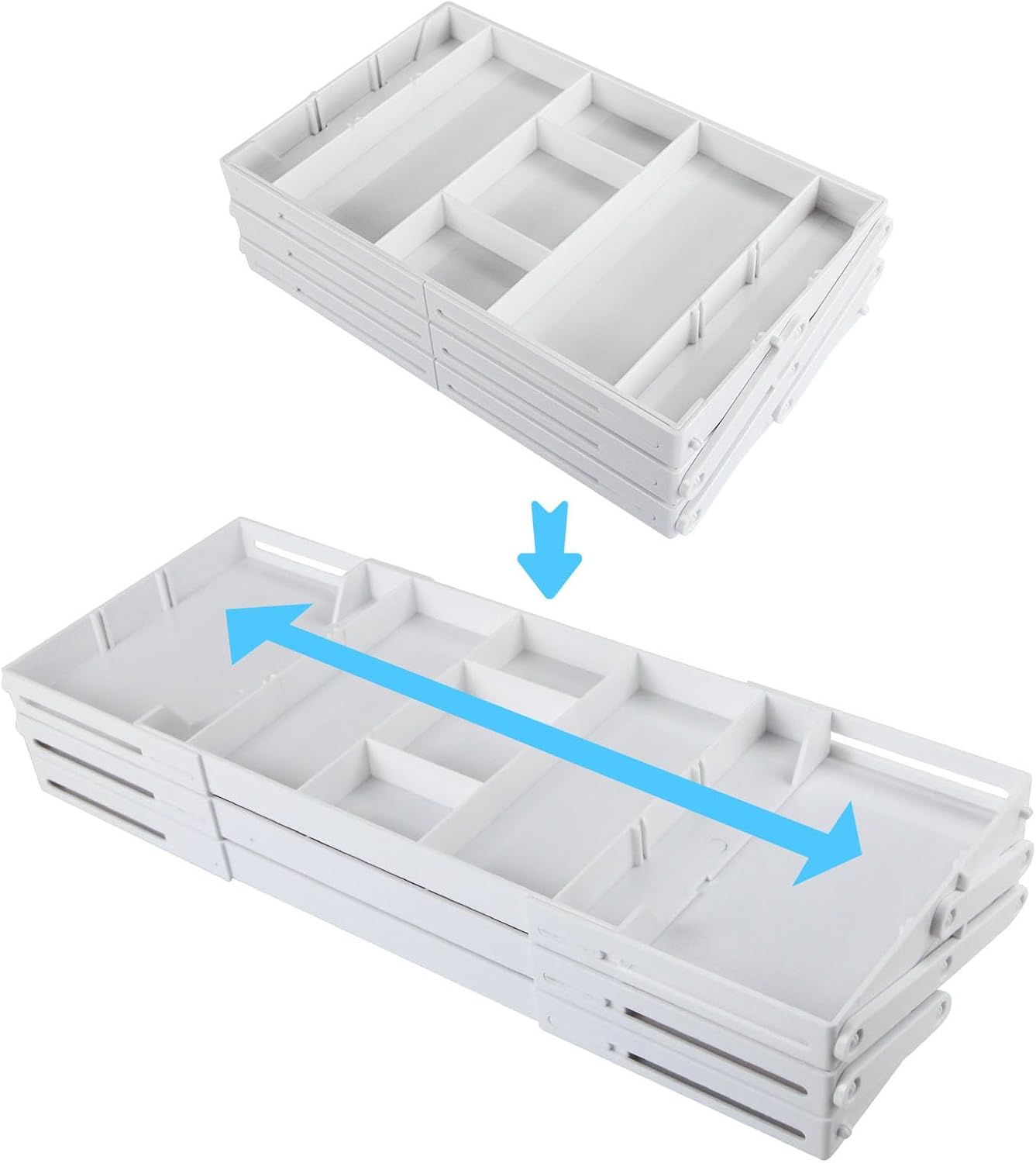 Ampiamente usato per cucina, bagno, camera da letto, soggiorno, ufficio. Organizzatori di cassetti pieghevoli multifunzionali per cassetti della scrivania, cassetti della cucina, bancone lavabo, scaffale. Di' addio al disordine con questo vassoio portaoggetti multifunzionale progettato per semplificare il tuo spazio e facilitare l'organizzazione. Gli organizzatori per cassetti espandibili risparmiano spazio e offrono ampio spazio, rendendo i tuoi oggetti ben organizzati in modo facile e senza sforzo. Scomparti multipli, classificano e organizzano facilmente vari oggetti, come strumenti per il trucco, stoviglie, cosmetici, gioielli, collane, bracciali, orecchini, accessori per capelli, materiale scolastico, posate da cucina, forniture per ufficio.