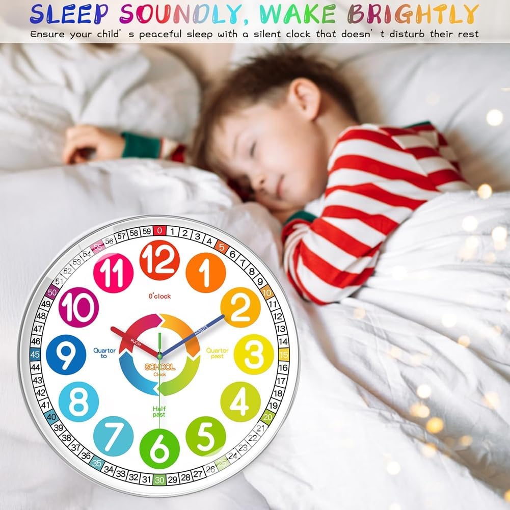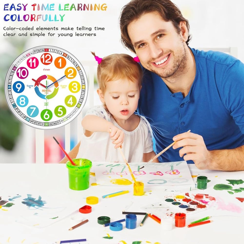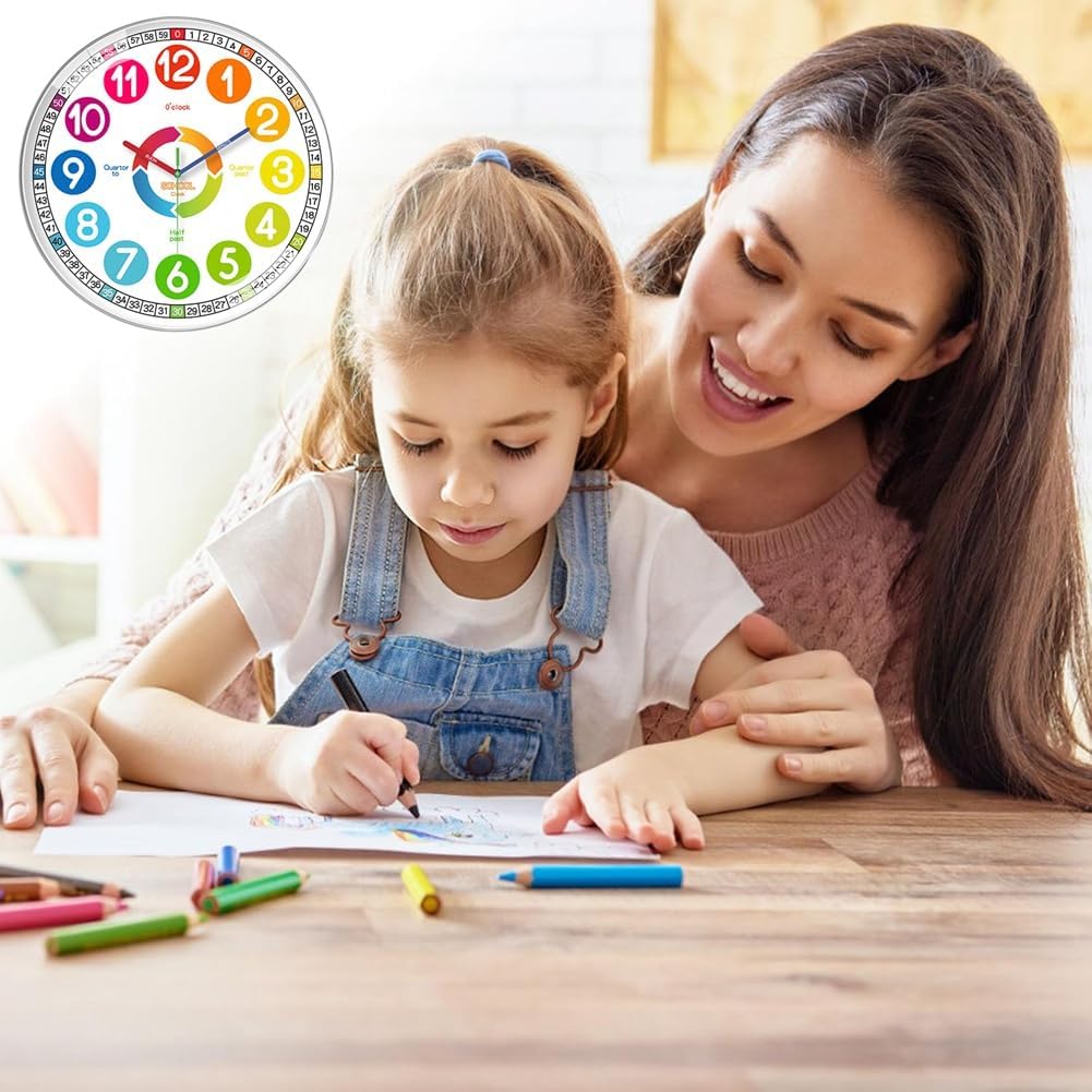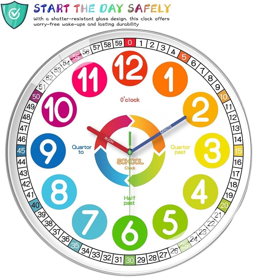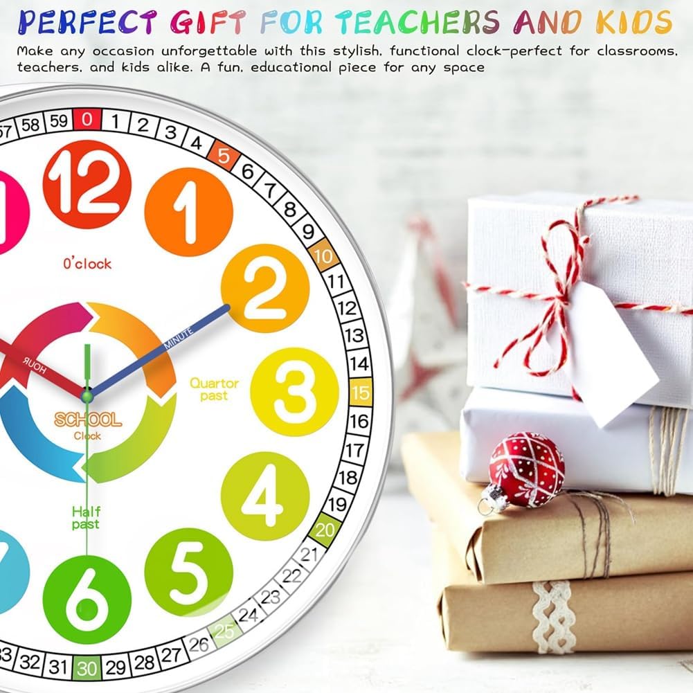 Comodità 'alimentazione a batteria: funziona con una singola batteria AA (non inclusa). Si consiglia di utilizzare una batteria al per ottenere le migliori prestazioni e la massima precisione da questo orologio da parete. Numeri colorati per un facile apprendimento: questo orologio da parete presenta numeri e lancette luminose e colorate, che facilitano l'apprendimento 'ora da parte dei bambini, illuminando al contempo qualsiasi stanza con il suo design divertente. Silenzioso e : nessun ticchettio, solo puro silenzio! Questo orologio da parete utilizza un movimento fluido e di alta qualità per una misurazione del tempo silenziosa e affidabile per tutto il giorno. Arredamento ideale per la casa e l'aula: che si tratti della camera da letto di un bambino, della sala giochi o 'aula, questo orologio da parete è un pezzo e funzionale che si adatta perfettamente a qualsiasi arredamento Un regalo perfetto per l'apprendimento: perfetto per ogni occasione! Questo orologio da parete è un regalo eccellente per bambini, insegnanti o genitori, combinando funzionalità e divertimento in un unico oggetto.