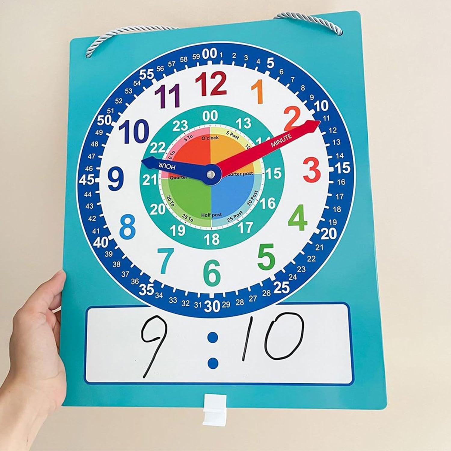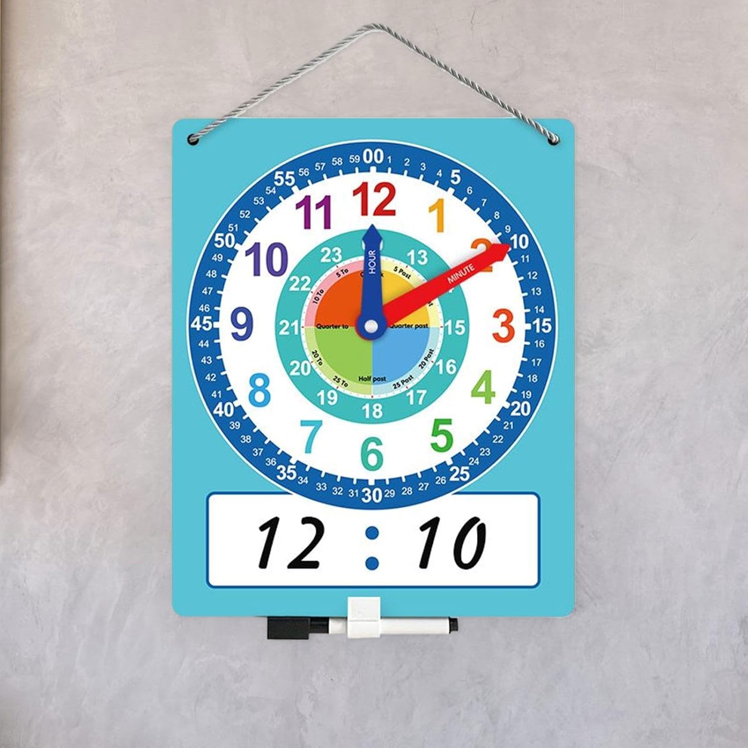 【Migliora il cronometraggio】 Il design dell'orologio interattivo con ore, minuti, secondi e orari etichettati facilita la capacità dei bambini di comprendere il tempo in modo accurato e completo Materiale in cartone robusto: realizzato in cartone robusto, questo orologio didattico è progettato specificamente per resistere all'uso regolare in classe, rendendolo perfetto per insegnare le prime abilità cognitive. Perfetto per una facile visualizzazione da più angolazioni, aiuta a leggere l'ora in modo efficiente. Ampia applicazione: uno strumento per padroneggiare i concetti del tempo, consente ai giovani studenti di acquisire competenze legate al tempo e promuove una solida base per la comprensione del tempo. Incoraggia la concettualizzazione del tempo: presenta una varietà di quadranti di orologio e rappresentazioni del tempo, integrate da una guida visiva per una migliore comprensione e apprendimento.