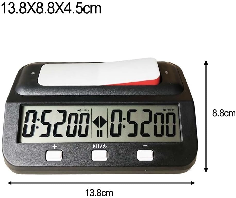 Funzionale: il timer per scacchi presenta un guscio in plastica che garantisce durata e funzionalità, fornendo un uso duraturo. Design facile da usare: dotato di pulsanti flessibili di grandi dimensioni, il timer degli scacchi offre una migliore sensazione di pressione e un funzionamento più facile. Funzioni: ideale per vari giochi di scacchi, tra cui scacchi cinesi, scacchi e via. Il timer supporta il tempo positivo, il conto alla rovescia, la funzione di ricompensa, la funzione di ritardo, la funzione di allarme, la funzione di memoria, la luce di prompt 【Temporizzazione precisa】Il timer consente un tempo positivo massimo di 9 ore, 59 minuti e 59 secondi, mentre il conto alla rovescia può durare fino alla stessa durata. Il tempo di ricompensa e il tempo di ritardo per ogni passaggio possono arrivare fino a 59 secondi. Caratteristiche pratiche: il timer emette un suono di allarme "bip beep" di 3 secondi quando la festa perde, e ha anche un promemoria della capacità della batteria e una funzione contapassi, utile per le normali competizioni a scacchi.
