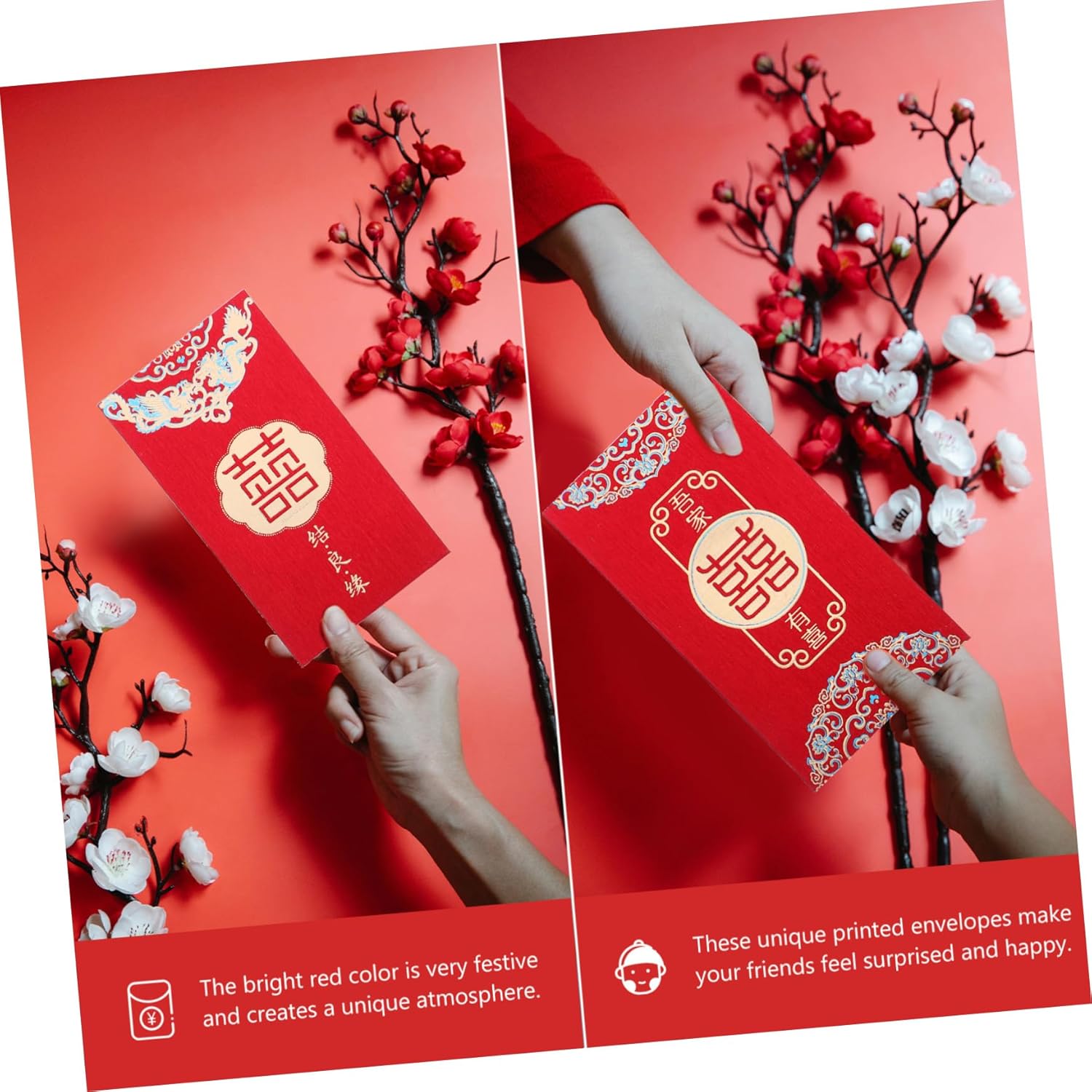 Porta soldi: la busta rossa cinese è realizzata in materiale cartaceo, l'apertura è aperta per mettere i soldi, può essere inserita sigillata, non serve colla, semplice e comoda, riutilizzabile, facile da usare, tasca decorativa per soldi Buste rosse per soldi: ottime buste per il capodanno lunare cinese, festival o feste di matrimonio, buste rosse Buste rosse portafortuna: realizzate con materiale cartaceo con design cinese, classico ed elegante, pacchetto rosso con cognome Busta rossa in stile cinese: una bellissima busta rossa per contanti, usala per rendere il tuo rituale di nozze pieno di fascino retrò, busta rossa cinese Buste rosse cinesi: sono ingegnose perché possono contenere facilmente denaro, collane, bracciali, orologi e molto altro, da sposa