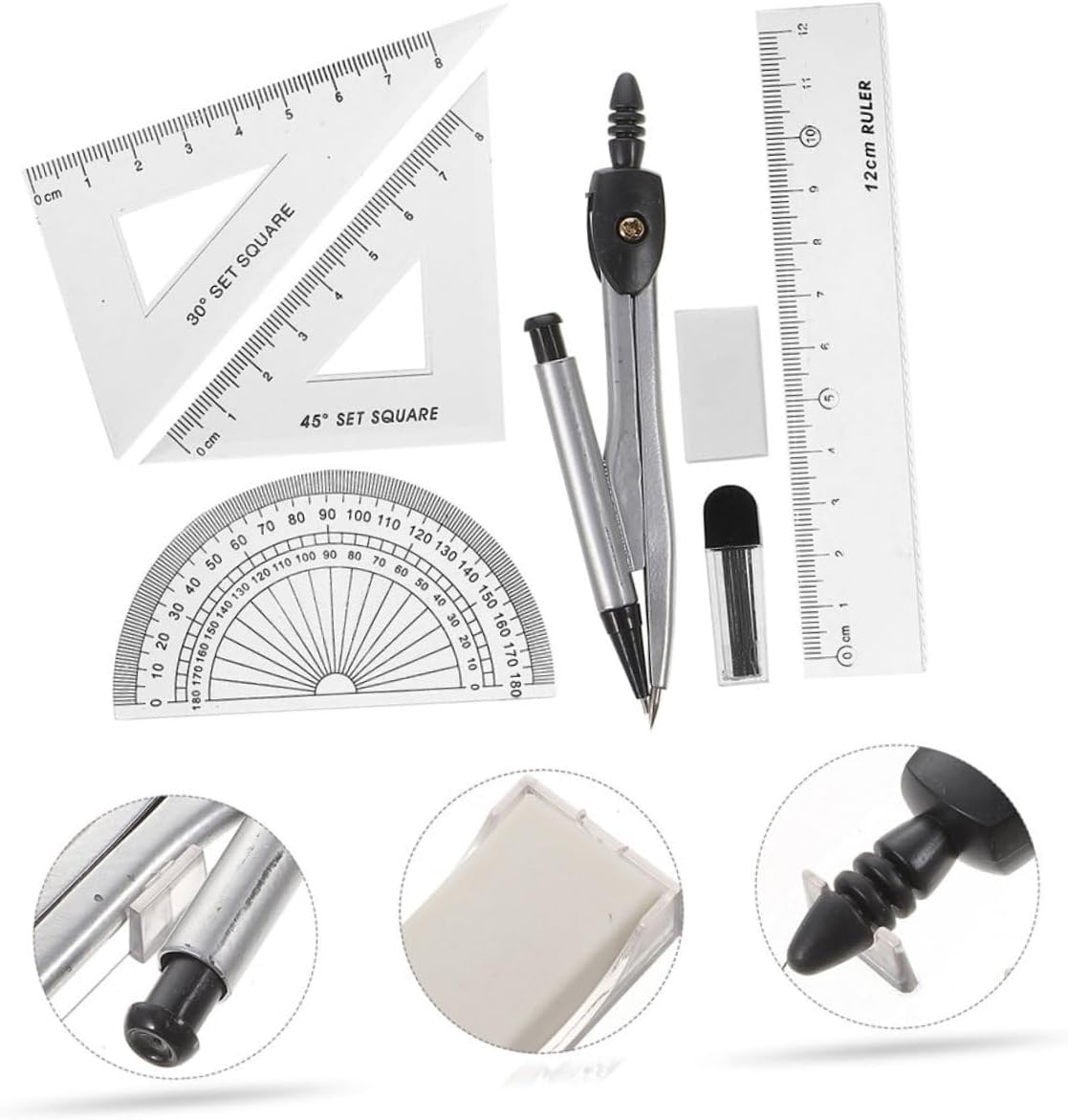 Set completo per disegno e misurazione: questo set include un compasso, un goniometro e vari righelli, fornendo tutti gli strumenti essenziali per un disegno e una misurazione accurati, compasso per la matematica, compasso per la geometria Set completo di compasso: questo set include più righelli e un goniometro, fornendo una soluzione completa per tutte le tue esigenze di disegno e misurazione, compasso e goniometro, kit di geometria Gomma pratica: dotato di una gomma pratica, questo set consente correzioni, assicurando che il tuo lavoro sia sempre pulito e preciso, geometria del compasso, disegno con il compasso Uso versatile: adatto per insegnanti, studenti, architetti e ingegneri, questo set è adatto a una di applicazioni, progetti scolastici alle attività di disegno professionale, goniometro per la scuola, compasso da disegno Ampia di usi: adatto a una varietà di applicazioni, tra cui attività d'ufficio, progetti scolastici e uso domestico, questo set soddisfa tutte le tue esigenze di disegno e misurazione, bussola per disegno, goniometro e bussola