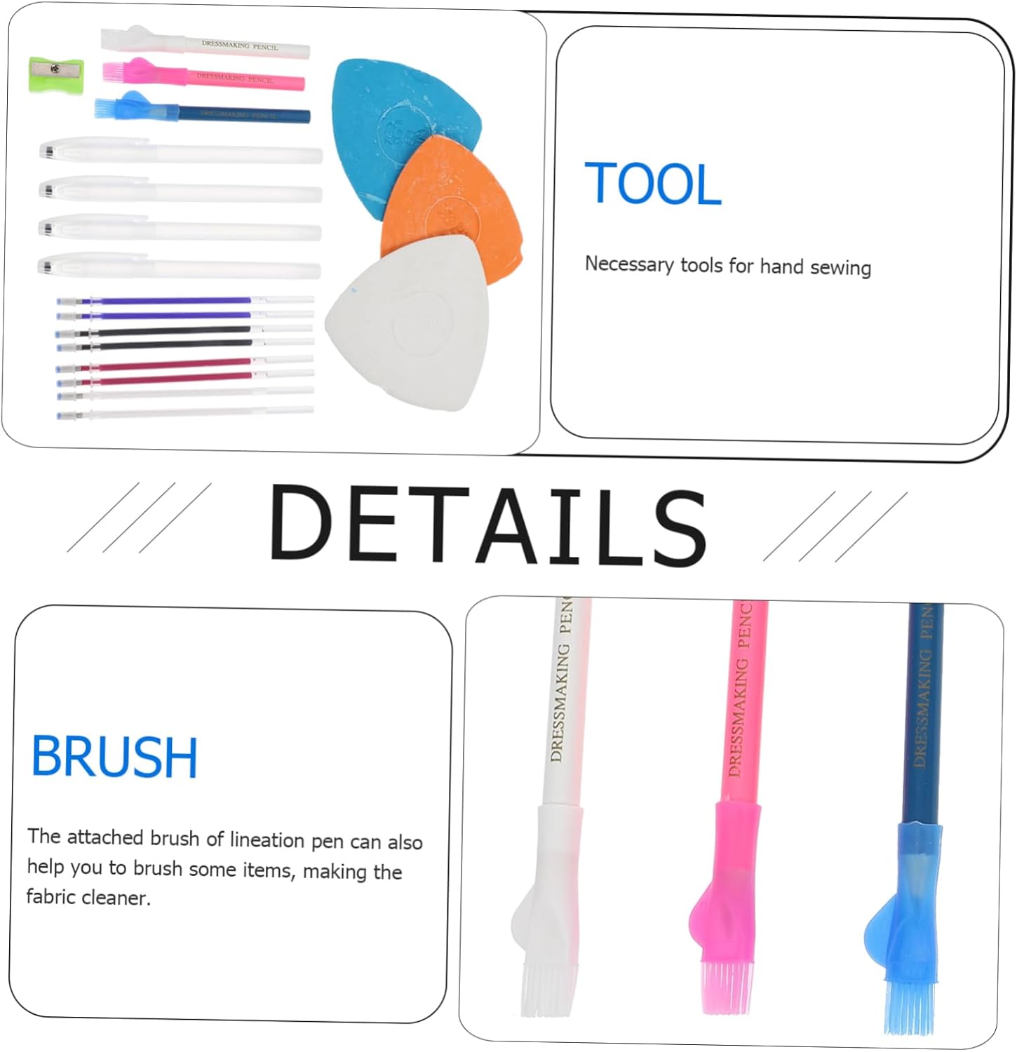 Gessetti da cucito per abbigliamento: soddisfano le tue esigenze quotidiane di marcatura del cucito e possono anche essere condivisi con amici, forniture per cucito Marcatore per tessuto con gesso da cucire: tre penne diverse possono rappresentare usi diversi, più pratico, gesso da cucire Pennarelli per ricamo da cucire: il pennello in dotazione alla penna per la lineatura può anche aiutarti a spazzolare alcuni oggetti, rendendo il tessuto più pulito, gesso per marcatura del tessuto Gesso da sarto e matita: non danneggia i tessuti o i vestiti, puoi usarli in tutta sicurezza Pennarello per cucire a gesso: puoi usare i tre angoli taglienti per disegnare con una buona precisione, matita per cucire