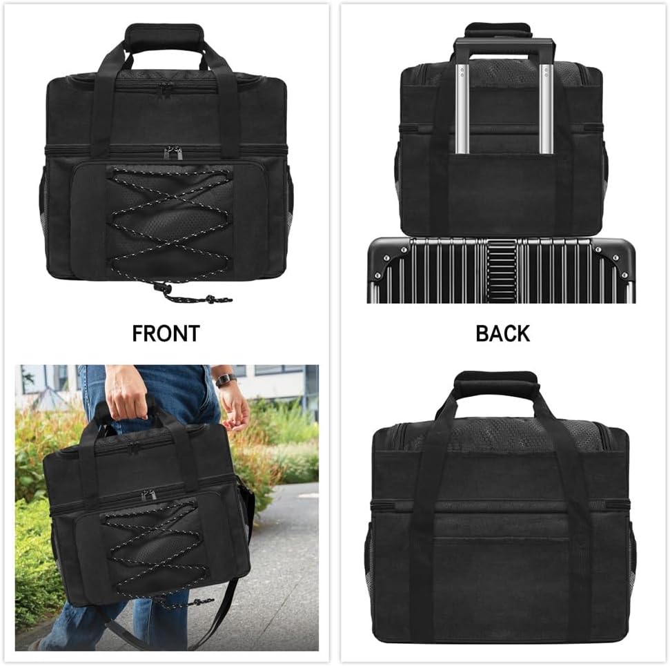 Le tasche su entrambi i lati possono contenere facilmente bottiglie d'acqua, asciugamani, portafogli, chiavi, telefoni cellulari, ecc. Sono presenti spallacci imbottiti regolabili e maniglie imbottite per un'esperienza di trasporto confortevole. Questa borsa da bowling è realizzata in materiale durevole e resistente che garantisce che possa sopportare il peso, ha una tasca per le scarpe parte superiore, lo scomparto principale è dotato di un supporto per palline in legno e divisori imbottiti per proteggere le palline da eventuali danni e prevenire che non rotoli durante il trasporto. 4 piedini protettivi nella parte inferiore garantiscono stabilità e riducono l'usura. Ottimo per principianti e giocatori di bowling avanzati.