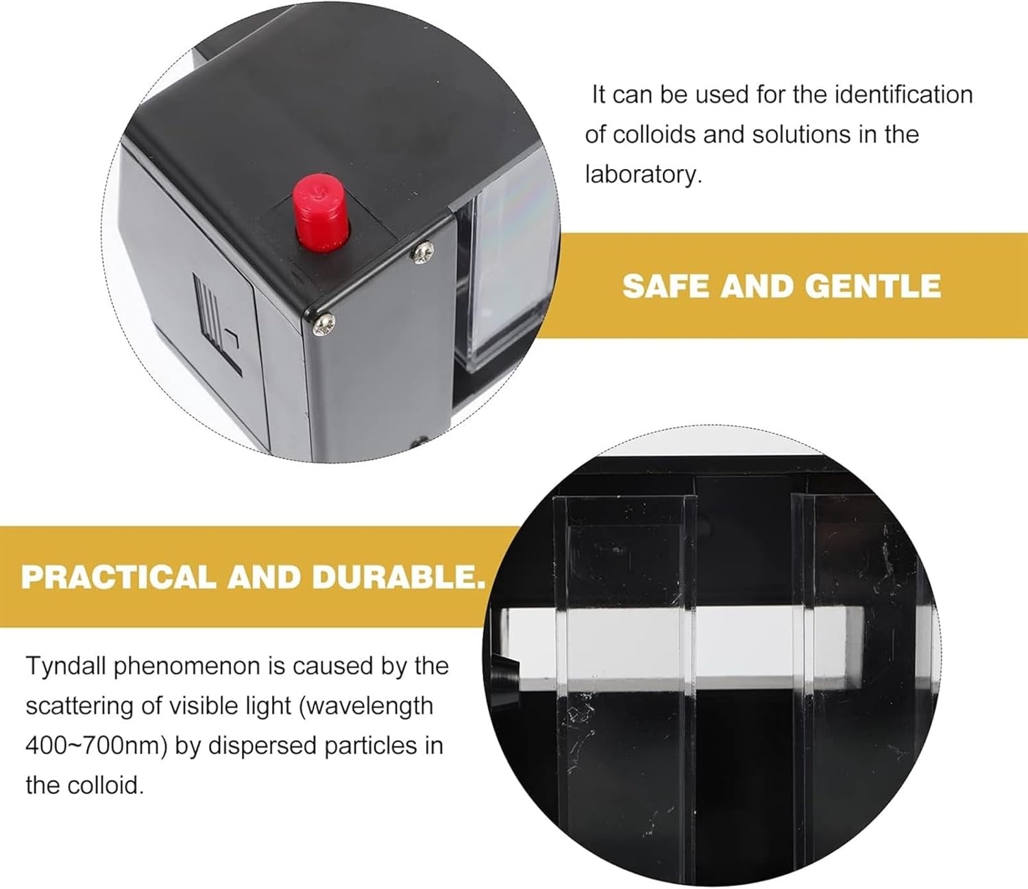 Facile da usare, dimostra meglio l'effetto Tyndall, molto utile. Il fenomeno di Tyndall è causato dalla dispersione di particelle di luce visibile (lunghezza d'onda 400~700nm) disperse nel colloide. presenta un fenomeno di diffusione della luce, per cui il fenomeno di Tyndall è spesso considerato un sistema colloidale. Può essere ampiamente utilizzato nell'insegnamento in classe, a scuola, a casa, in laboratorio, ecc. Può essere utilizzato per l'identificazione di colloidi e soluzioni in laboratorio.
