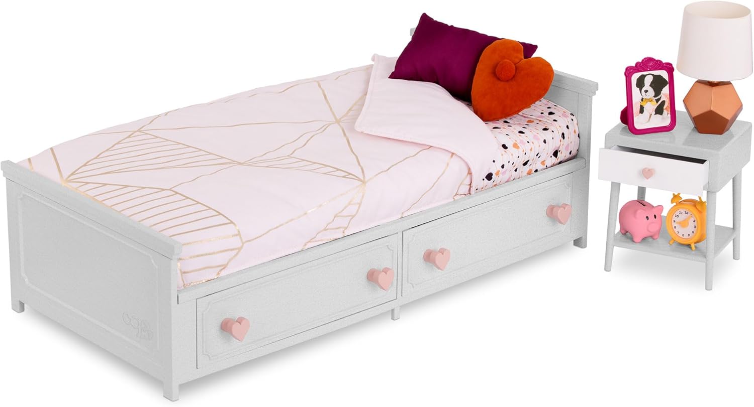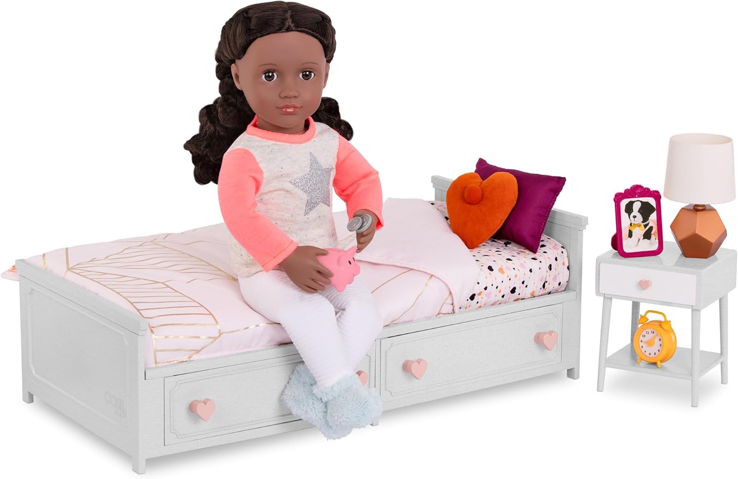 18-inch Doll Bedding Set: decorate your doll's room in fun and playful style with the Our Generation Goodnight Glow bedding set! Fun Features: adjustable clock, nightstand drawer opens to store accessories, and the 6 coins can be put in or taken out of the piggy bank! Includes: bed sheet, comforter, 2 pillows, nightstand, pretend lamp, piggy bank, 6 play coins, picture frame, and alarm clock. Mix & Match: compatible with most 18-inch dolls and accessories. Recommended Age: suggested for kids ages 3+ (small parts).