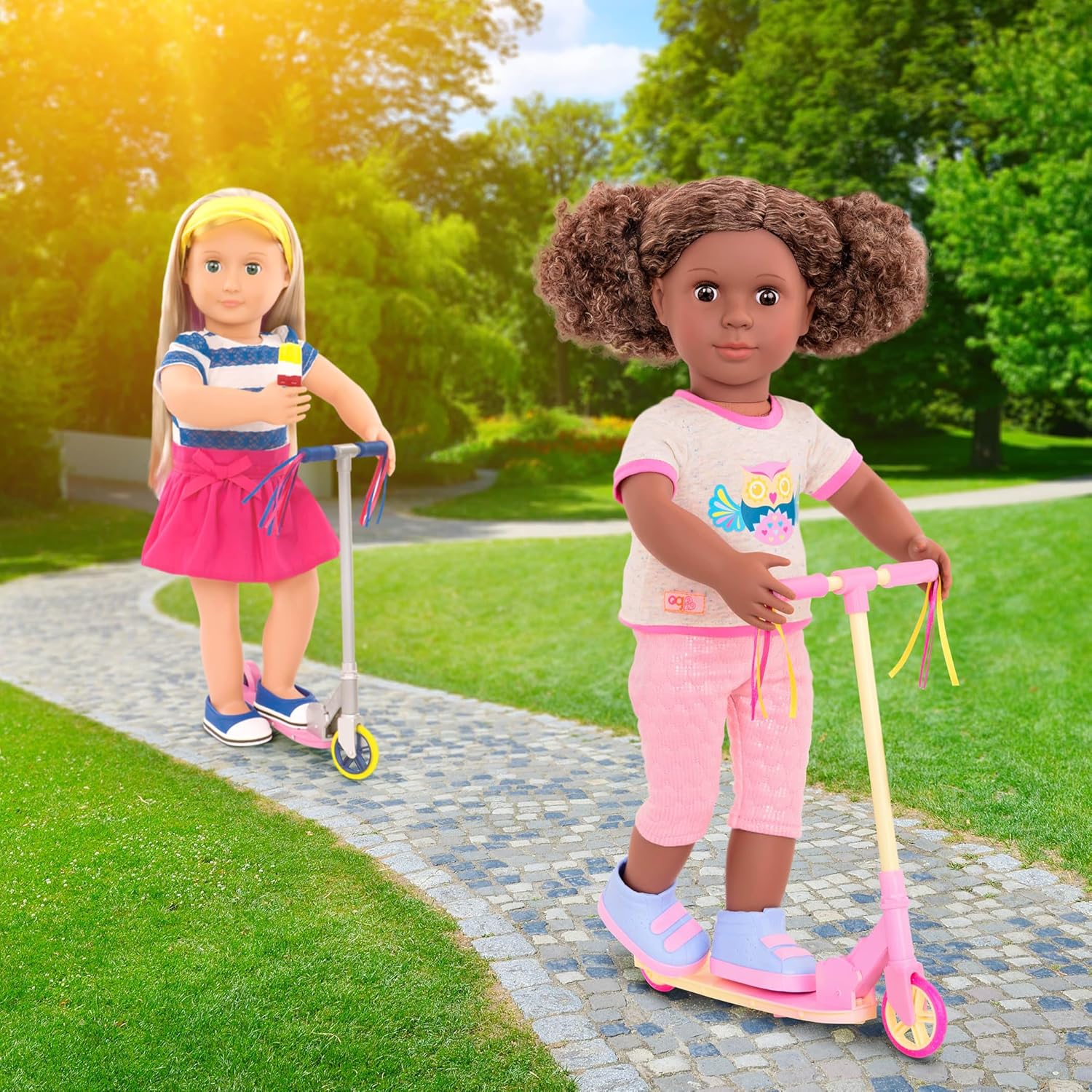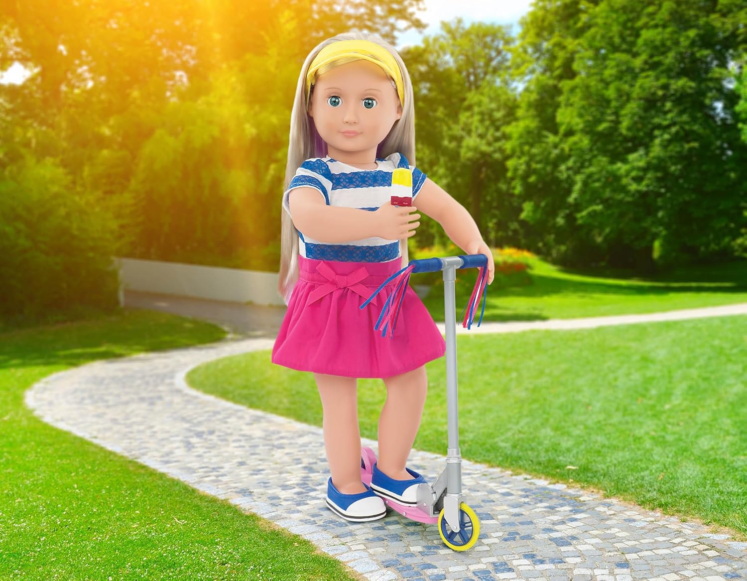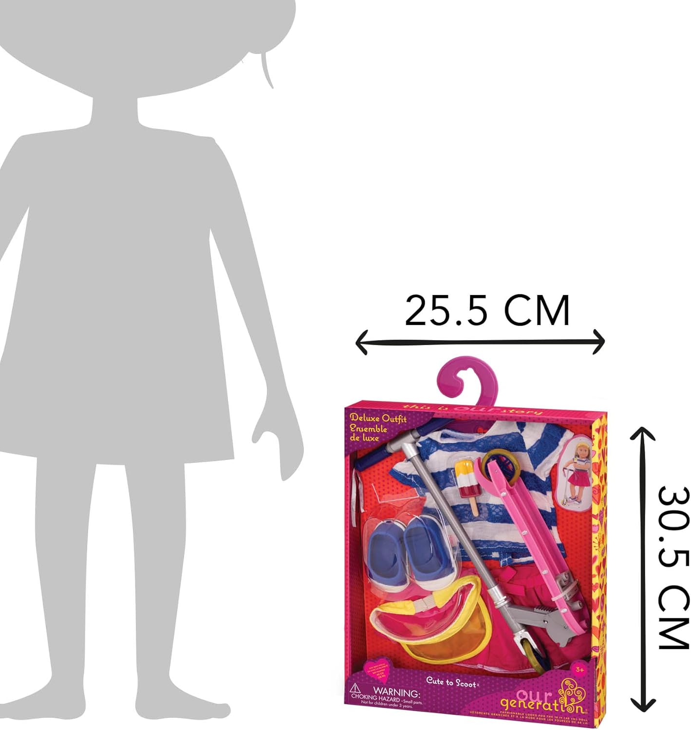 18-inch Doll Scooter Outfit: roll, glide, and breeze into adventure with the Our Generation Cute to Scoot outfit for 18-inch dolls! Includes: visor, top and skirt, shoes, scooter, and frozen treat. Mix & Match: outfit features easy-open closures to quickly put on and remove; compatible with most 18-inch dolls, outfits, and accessories. Recommended Age: suggested for kids ages 3+ (small parts). Outfit Only: dolls sold separately.