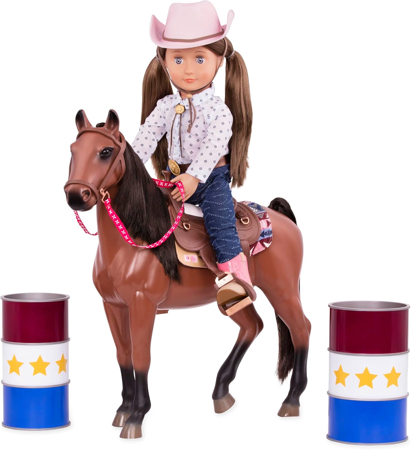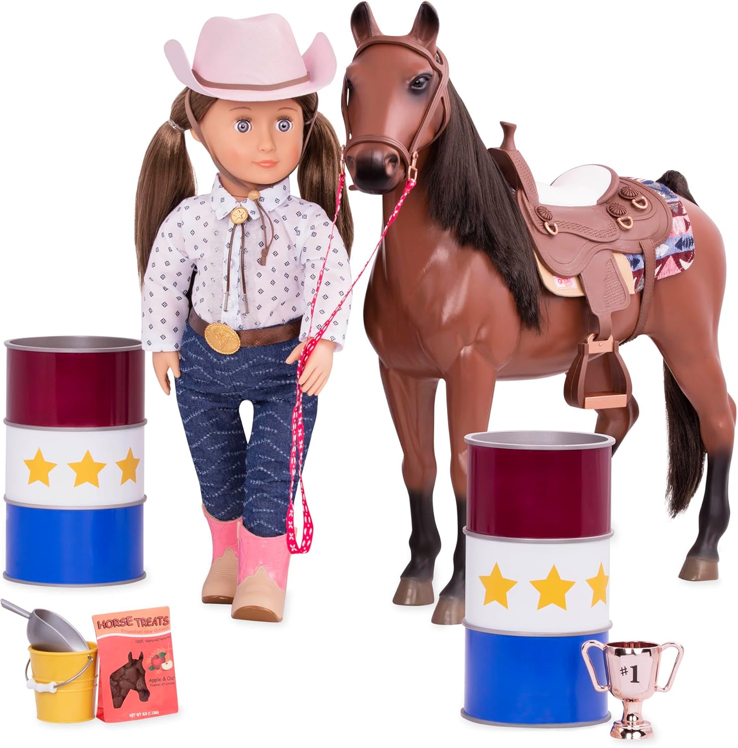 Set da 10 pezzi Equestrian: Get Ready to ride into Fun with the Our Generation Barrel Racing Set for 18 inch dolls! Include: una cowgirl ha, 2 barili, una sella con punte, una bridle con pure, un cavallo vuoto, un trofeo, una borsa di trattamenti per cavalli, un scoop, e un sacchetto di alimentazione. Mix & Match: compatibile con la maggior parte delle bambole da 18 pollici, giocattoli per cavalli e accessori. Raccomandati Age: gli accessori Our Generation doll rendono un ottimo regalo per bambini di età 3+ (piccole parti), per creare le loro storie uniche. Set di accessori Only: Our Generation dolls and horses sold separately.