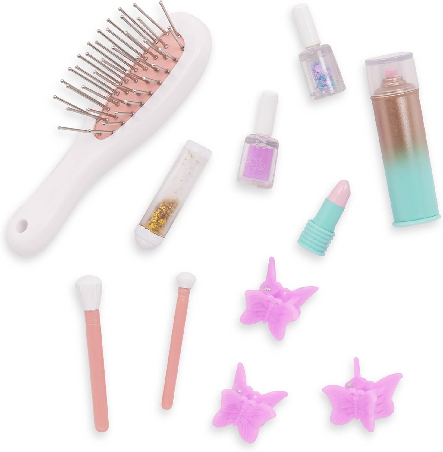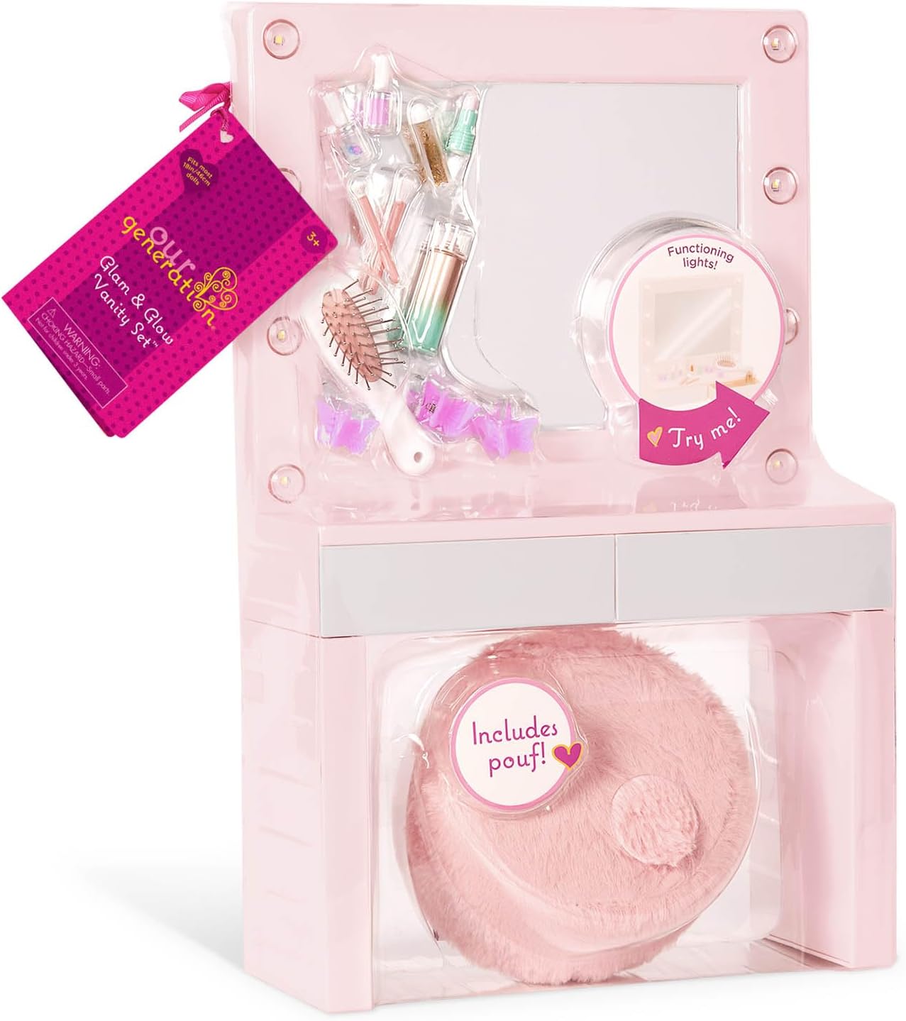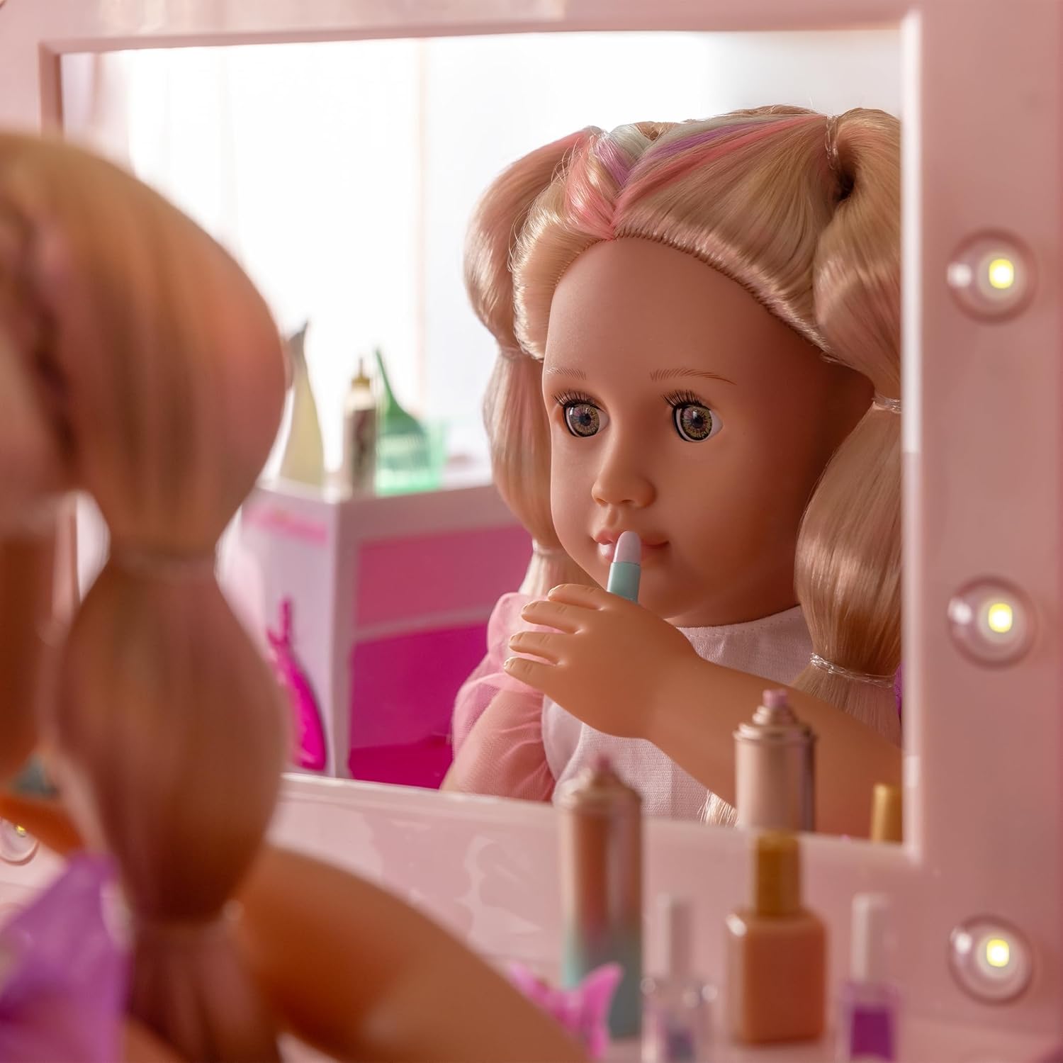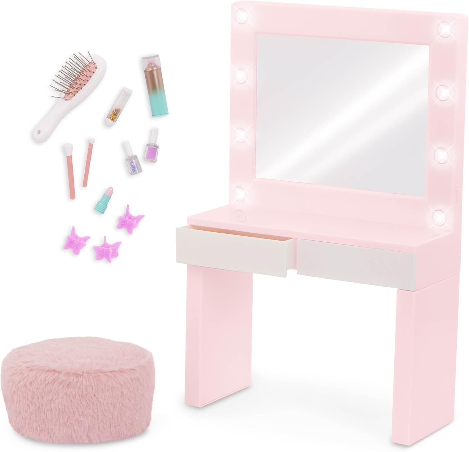 15-pc Vanity Table Set: Light up imagination and fabulous styles with the Our Generation Glam & Glow vanity table for 18-inch dolls! Fabulous Features: The vanity mirror really lights up, so little stylists can create the brightest makeovers! Includes: Pink vanity table with light-up mirror, 2 drawers, furry pouf, 2 nail polish bottles, 3 butterfly claw clips, hairbrush, spray bottle, lip gloss, 2 make-up brushes, and lipstick. Dimensions: Measures approximately 15" (H) x 17" (W) x 4.5" (D). Mix & Match: Compatible with most 18-inch dolls, doll furniture, and accessories.