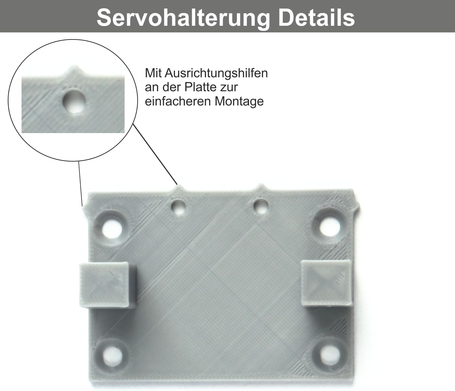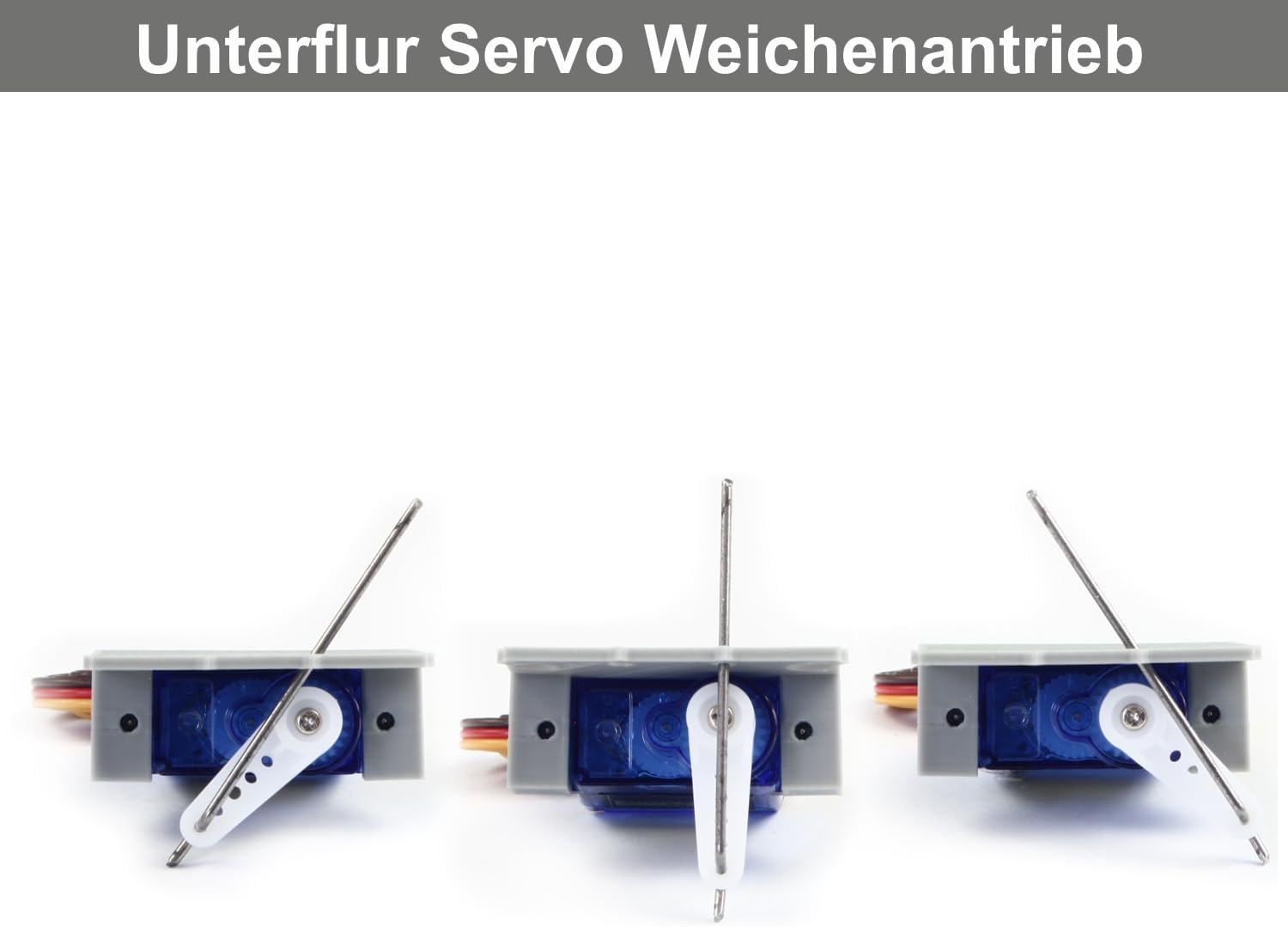 Azionamento universale per interruttori sotto pavimento per binario 0, H0, TT, N e Z - ideale per spazi di installazione limitati Potente servo da 9 g con ca. Cavo da 25 cm per un posizionamento flessibile sotto il sistema Robusto supporto PLA per fissaggio permanente, prodotto su stampanti 3D industriali Compatibile con decoder standard: facile integrazione nel controllo del sistema digitale Include filo in acciaio per molle e materiale di montaggio: montaggio rapido, elevata precisione di commutazione