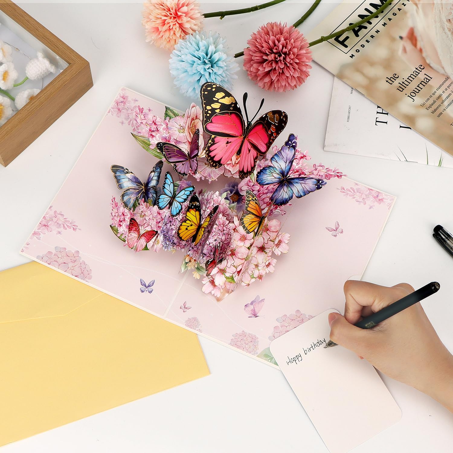 Design pop-up 3D: il nostro biglietto d'auguri pop-up è realizzato con squisita attenzione ai dettagli, ogni farfalla sembra vivida e realistica, creando un'esperienza visiva straordinaria per ogni occasione Materiali di alta qualità: biglietti d'auguri 3D realizzati con materiali di alta qualità, la carta rigida del biglietto è resistente alle pieghe e alla deformazione, mentre i colori ricchi e i bordi dorati delle farfalle le fanno brillare e muoversi Biglietto di benedizione incorporato: i nostri biglietti hanno scomparti interni dove puoi mettere i tuoi biglietti d'auguri di benedizione, così puoi scrivere i tuoi migliori auguri e lasciare un ricordo memorabile per i tuoi cari Busta inclusa: la busta e l'involucro di plastica inclusi aggiungono sicurezza e praticità, garantendo che il tuo biglietto rimanga protetto e pulito. Grande e versatile: con una dimensione di quasi 20 x 15 cm, questo biglietto di auguri pop-up più grande della media è perfetto per tutte le tue esigenze, dalle vacanze ai compleanni fino agli anniversari e ai biglietti di ringraziamento