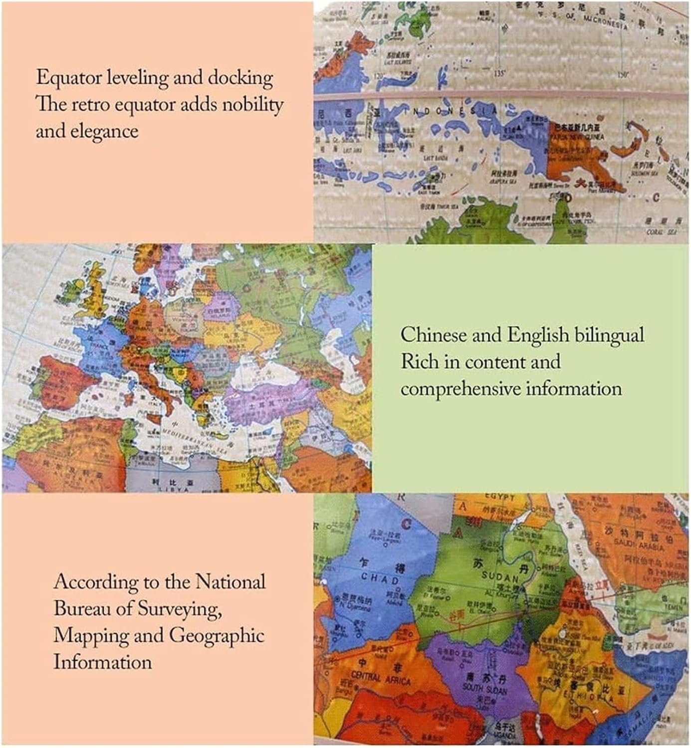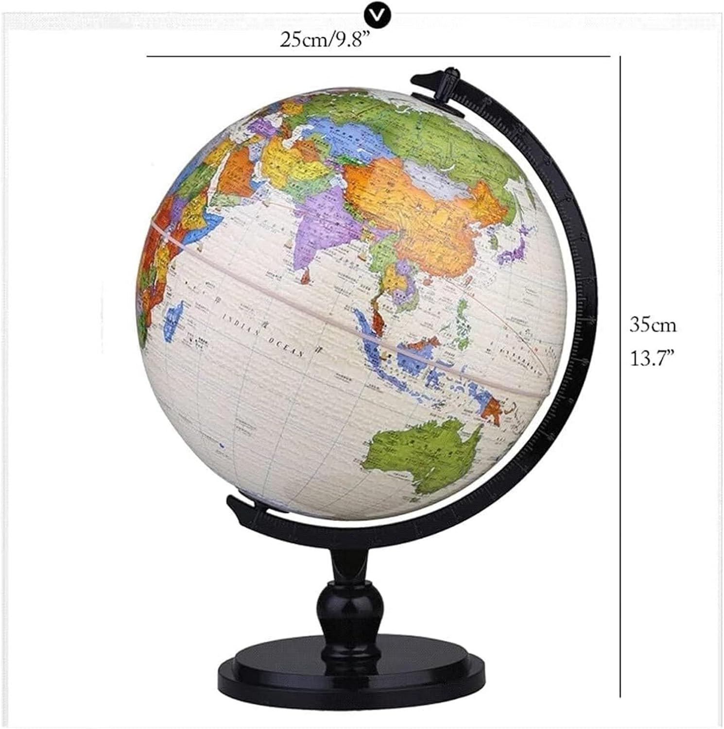Usa questo globo per espandere i tuoi orizzonti e migliorare la tua comprensione della Terra e della sua geografia! Offre un modo divertente e conveniente per imparare la geografia a casa, in classe o in ufficio. Una palla di plastica ABS sana ed ecologica che accompagna la tua salute. La staffa è realizzata in lega di zinco, che può essere ruotata in modo flessibile senza incepparsi o tagliarsi le mani. Diametro: 25 cm La superficie della palla adotta la tecnologia di stampa con picco a nove colori ad alta risoluzione con colori ricchi. Questo mappamondo politico è stampato con una mappa accurata che segna chiaramente continenti, oceani, confini nazionali e politici e capitali.
