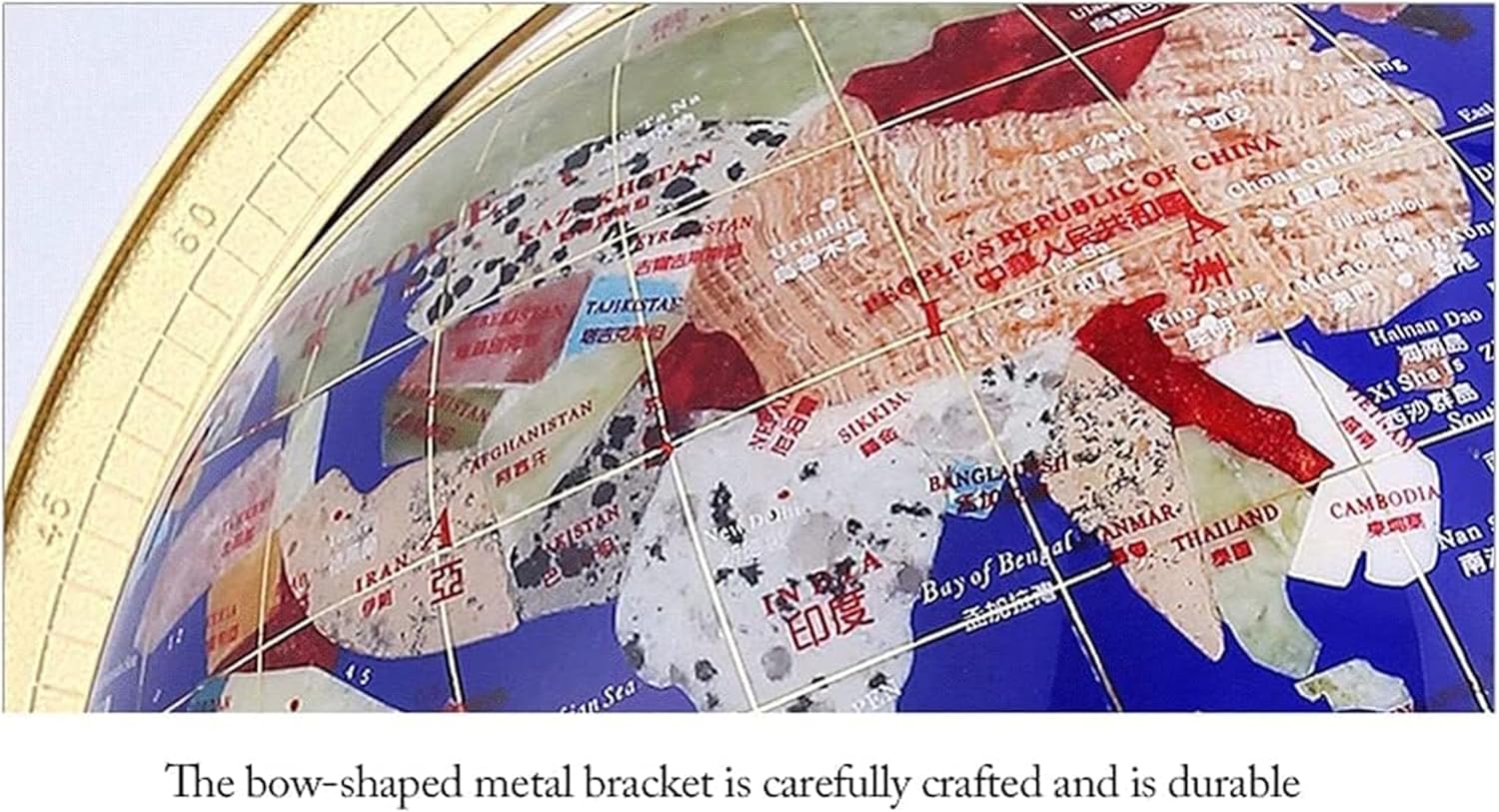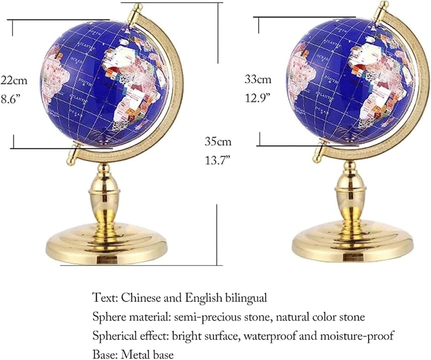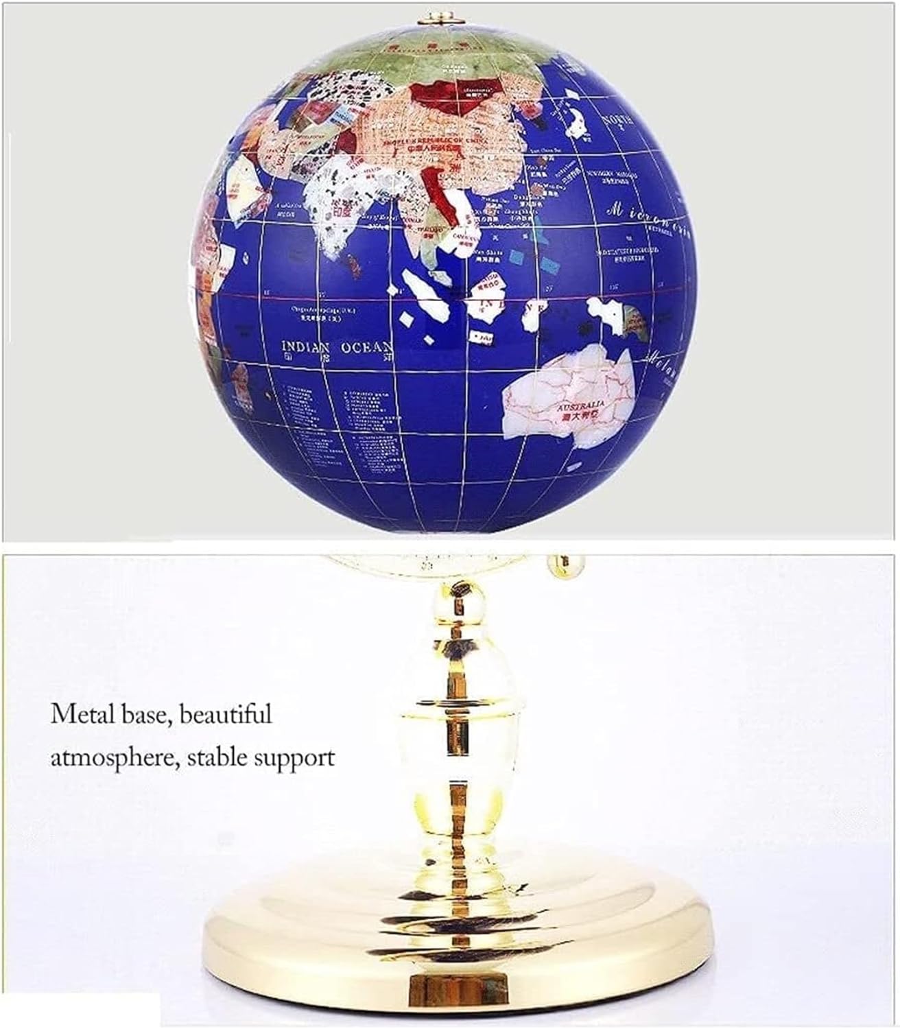 Usa questo globo per espandere i tuoi orizzonti e migliorare la tua comprensione della Terra e della sua geografia! Offre un modo divertente e conveniente per imparare la geografia a casa, in classe o in ufficio. Pietre semipreziose, pietre naturali colorate, base: base in metallo, effetto sfera: lucido. Vengono utilizzate pietre semipreziose e pietre preziose colorate naturali importate e la tecnologia di sintesi di seconda generazione viene utilizzata per formare un corpo integrale e le sfere sono collegate più strettamente. Il supporto in metallo a forma di arco è ben realizzato, flessibile e resistente; Gli indicatori di legenda contrassegnano accuratamente ciascun indice, contrassegnano il margine e sono ricchi di contenuti. Realizzato con pietre semipreziose e una varietà di pietre preziose colorate naturali importate, realizzate con cura, tagliate, lucidate e lucidate da incisori professionisti.