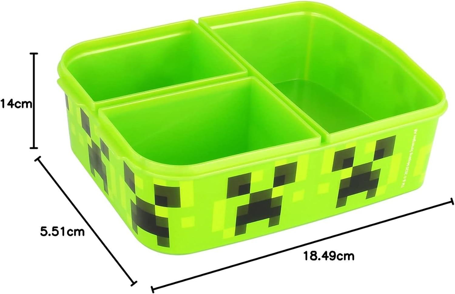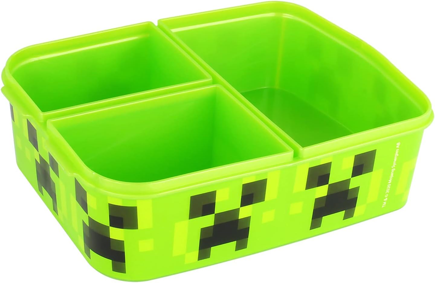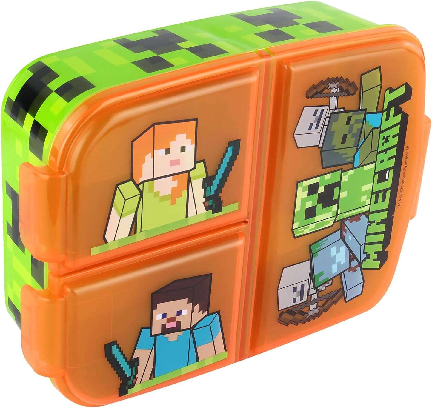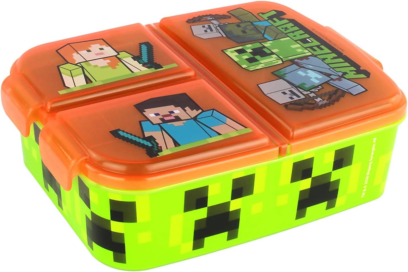 Scatola per snack per ragazzi e ragazze con 3 scomparti che si aprono e si chiudono indipendentemente con chiusure a clip Stampati con i coraggiosi e inventivi esploratori Steve e Alex e il misterioso Enderman, Zombie e Creeper del popolare gioco per computer Sandbox "Minecraft" Dimensioni della scatola per pesci: circa 18 x 13,5 x 5,5 cm, si adatta a qualsiasi zaino per la scuola o zaino per bambini. Capacità dello scomparto grande: circa 348 ml. Capacità dei piccoli scomparti: circa 175 ml Materiale: plastica (PP, senza BPA e ftalati) – riutilizzabile, infrangibile, facile da pulire, non adatto per lavastoviglie e microonde Ideale per la conservazione separata e per il trasporto sicuro di pane, snack, panini, frutta e verdura