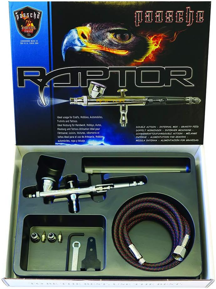 Aerografo doppio con alimentazione a gravità. Testine da 25, 38 e 66 mm incluse. Tubo da 1,8 m con attacco filettato NPT da 0,635 cm per compressore. Fabbricato negli USA.