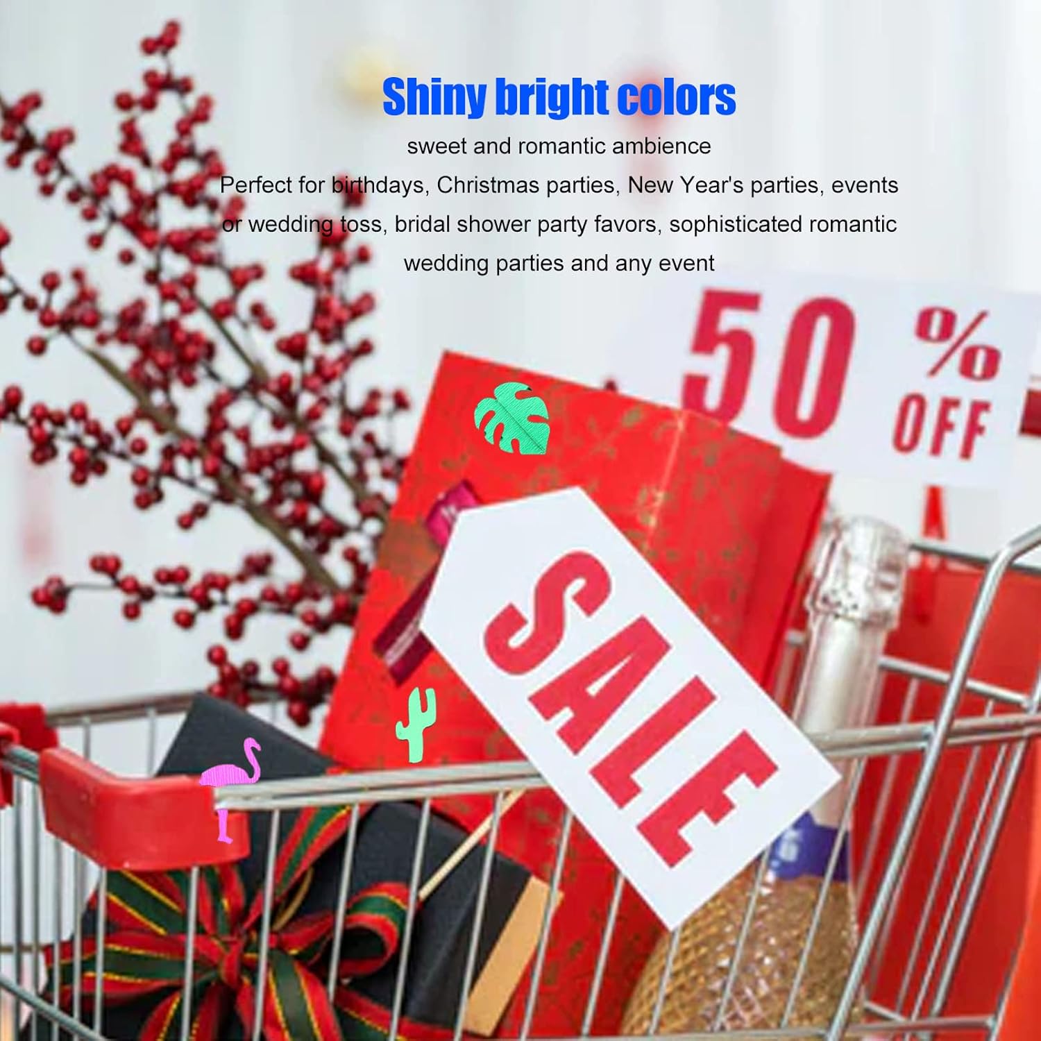 [Scintillante glitter] Crea un'atmosfera festosa con colori vivaci ed effetti luccicanti che stupiranno i tuoi ospiti. [Utilizzo multiuso] Per compleanni, feste natalizie, eventi in spiaggia estiva o temi romantici di matrimonio. [Atmosfera dolce e romantica] Aggiungi un tocco di dolcezza a ogni occasione, dalle docce per bambini alle feste a tema giungla. [Materiale durevole] realizzato con un forte foglio di alluminio in varie forme, garantendo un uso duraturo per le tue decorazioni. [Decorazioni versatili] Dalle tavoli da festa ai sacchetti , questi coriandoli sono ideali per aggiungere un tocco di colore e fascino a qualsiasi evento.