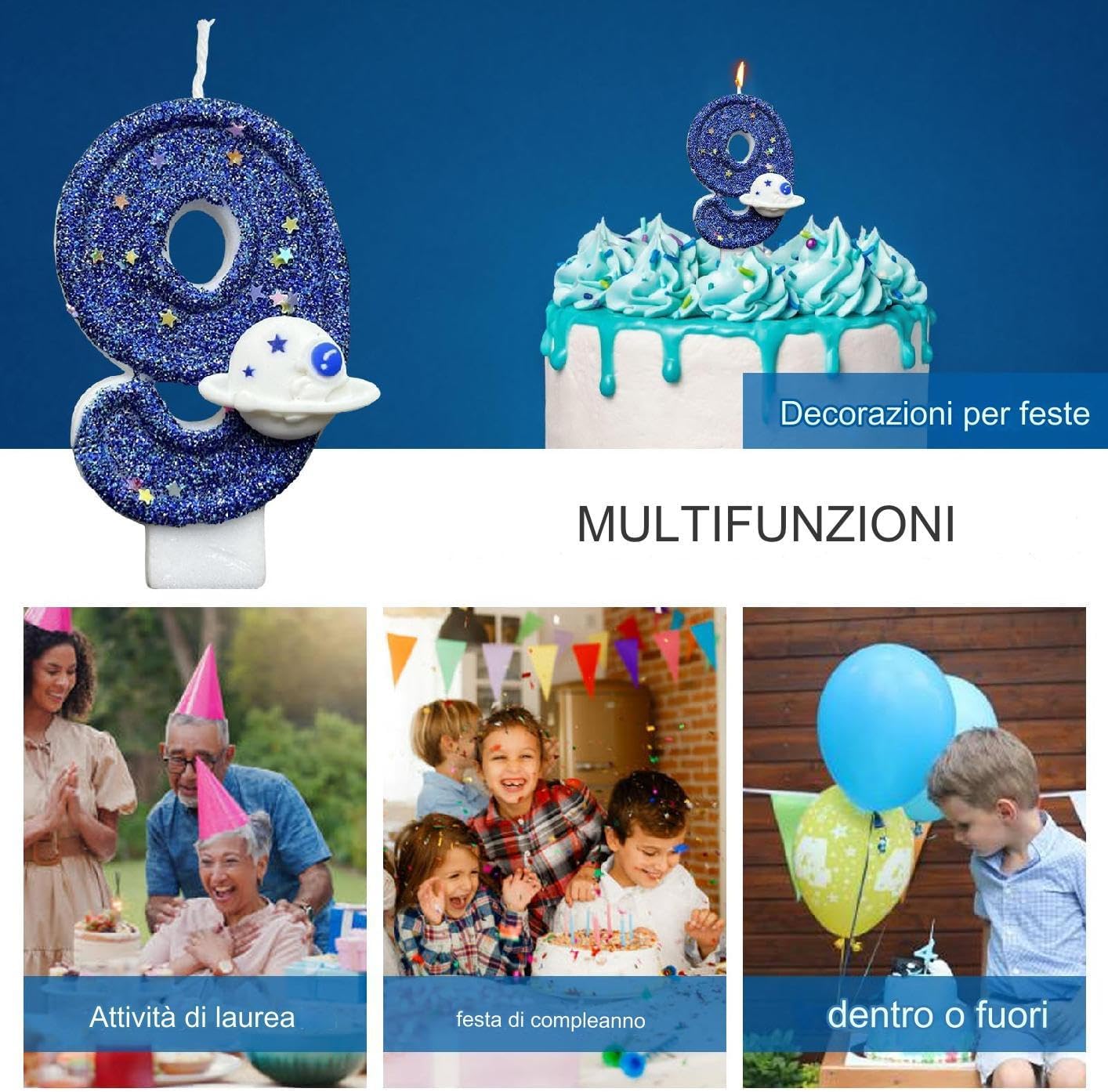 Numero candele: completa l'arredamento della tua festa con queste affascinanti candele per cifre. Il set è disponibile in tutti i numeri da 0 a 9, fornendo più possibilità di età Space Planet Design: trasporta la tua festa di compleanno in un altro mondo con questa candela di compleanno affascinante del design del pianeta spaziale blu. Il suo design unico aggiunge un tocco di fantasia alla torta tradizionale, creando un paesaggio straordinario che l'atmosfera e rende la celebrazione davvero indimenticabile Sicuro per l'utilizzo: un fondo ben progettato della candela migliora la sicurezza e lo rende sicuro da utilizzare per i bambini. Non si inclinò o cadrà, aggiungendo alla gioia e alla pace della mente della celebrazione. Inoltre, un facile inserimento nella torta l' della festa Forniture per feste perfette: questa candela di numero di compleanno a tema spazio è perfetta per creare l'atmosfera ideale per feste. Che si tratti di una festa a tema spaziale per bambini, parte 'intero decorazione della festa o di un'aggiunta romantica a una festa per adulti, questa candela aiuterà a reggere la celebrazione a nuove altezze Design scintillante: il colore blu di questo numero di candele con una luce affascinante, preparando la torta di compleanno immediatamente accattivante. Il suo design scintillante aggiunge un tocco di divertimento, rendendo le tue celebrazioni più memorabili e divertenti che mai