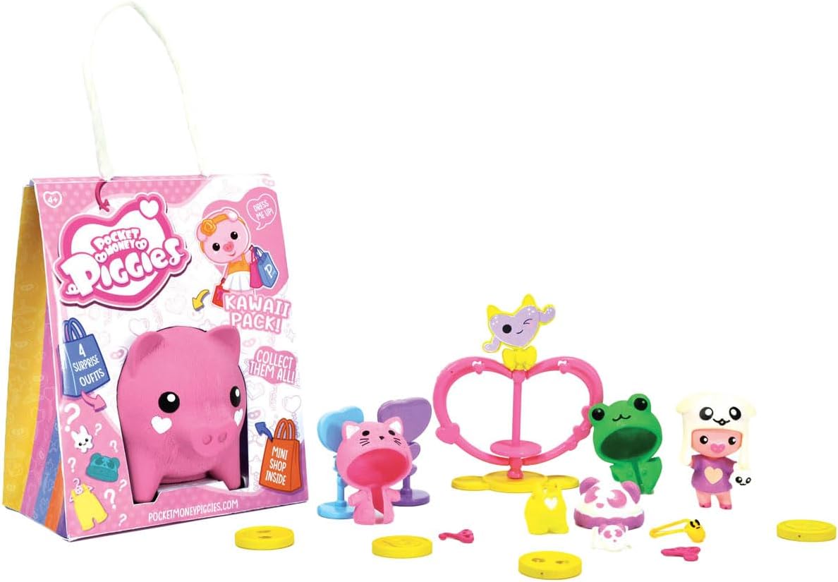 I Pocket Money Piggies sono maialini unici e divertenti con mini negozi e accessori all'interno di ogni salvadanaio. Colleziona tutti e 5 i temi! Include: 1 personaggio Piggy, 4 abiti completi, 1 mini negozio, 4 accessori e 1 foglio di adesivi. Il pacchetto Kawaii Pocket Money Piggies include abiti e accessori in stile kawaii! Vesti i tuoi maialini con gli abiti più carini, con i colori più carini, con le stampe più carine e le forme più carine! Abbiamo già chiarito che la parola giapponese kawaii significa CARINO?