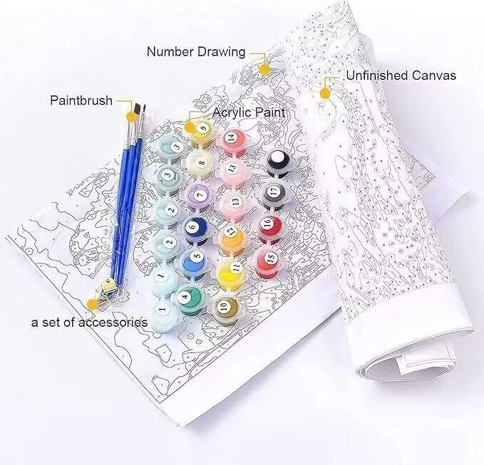 【DIPINGERE CON I NUMERI PER ADULTI PRINCIPIANTI】I kit per dipingere con i numeri includono tela per dipingere con i numeri, 1 set di colori acrilici, 1 set di pennelli per dipingere con i numeri (include 3 pezzi) e accessori per dipingere con i numeri (senza bordo), 【PIGMENTI ACRILICI DI ALTA QUALITÀ】I nostri kit per dipingere con i numeri sono diversi da quegli strumenti di pittura fai da te economici, utilizziamo colori acrilici di alta qualità, il colore è duraturo e coprente, mentre può essere facilmente lavato via con acqua e sapone, è sicuro da usare per i bambini. 【FACILE DA DIPINGERE】Dipingere con i numeri adatto a tutti i livelli di abilità adulti, principianti, bambini, studenti. Segui le istruzioni, dipingi con i numeri colorati, finisci uno per uno 【AMPIA APPLICAZIONE】 Dipingere con i numeri per adulti è un regalo perfetto per la decorazione della casa come pezzi d'arte colorati sulla tua parete, può anche essere la scelta migliore per i tuoi amici o familiari. Coinvolgi questo divertente progetto ora! 【ECCELLENTE SERVIZIO CLIENTI】Attribuiamo grande importanza alla qualità dei nostri prodotti e all'esperienza del cliente. Se non sei soddisfatto al 100% del modello, dei colori o dei pennelli, non esitare a contattarci, qualsiasi domanda riceverà risposta entro 24 ore.
