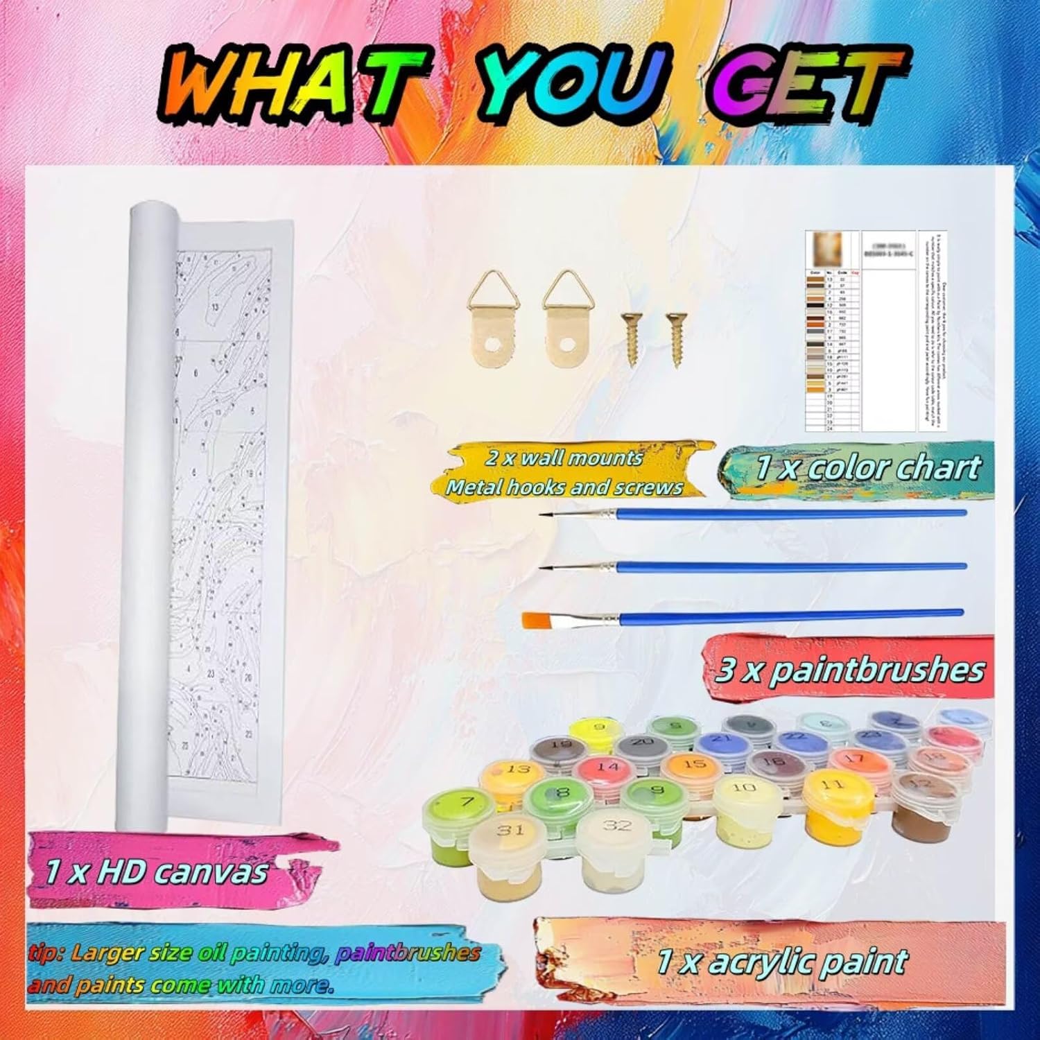 【Il pacchetto include】Dipingere con i numeri include tutto il necessario. Include tela prestampata (senza cornice), 1 set di colori acrilici, 3 pennelli, 1 riferimento di tela numerata su carta, 2 ganci metallici e viti. Il set di dipingere con i numeri può ispirare la creatività e alleviare lo stress, per favore non perdere il nostro "Dipingere con i numeri" 【Vernice acrilica sicura】 Le nostre vernici digitali sono diverse da quelle economiche strumenti di pittura fai-da-te, la vernice acrilica che usiamo, il colore è duraturo e opaco e può essere facilmente lavato via con acqua e sapone, è sicuro da usare 【Riduci il tempo davanti allo schermo】Dipingere con i numeri è un prodotto fai da te che richiede le mani dei tuoi bambini per completare il dipinto. Dipingere con i numeri non solo ti aiuta a tenere il tuo bambino lontano dall'elettronica, ma è anche per migliorare la creatività, la sicurezza, la capacità di attenzione e le abilità pratiche dei tuoi bambini 【Scelta regalo】Dipingere con i numeri è un regalo dolce e fantasioso per i tuoi amici e familiari. Può avvicinarti ai tuoi figli, parenti, amici. È un materiale artigianale divertente e innovativo, un ottimo modo per esercitare capacità pratiche, coordinazione occhio-mano, espressione creativa e sicurezza in se stessi, farli innamorare del fai da te e rimanere lontano dall'elettronica 【Servizio clienti】 Apprezziamo la qualità del prodotto e l'esperienza del cliente. Se hai domande sui nostri dipinti ad olio digitali, ti preghiamo di contattarci in tempo e risolveremo il problema in tempo.