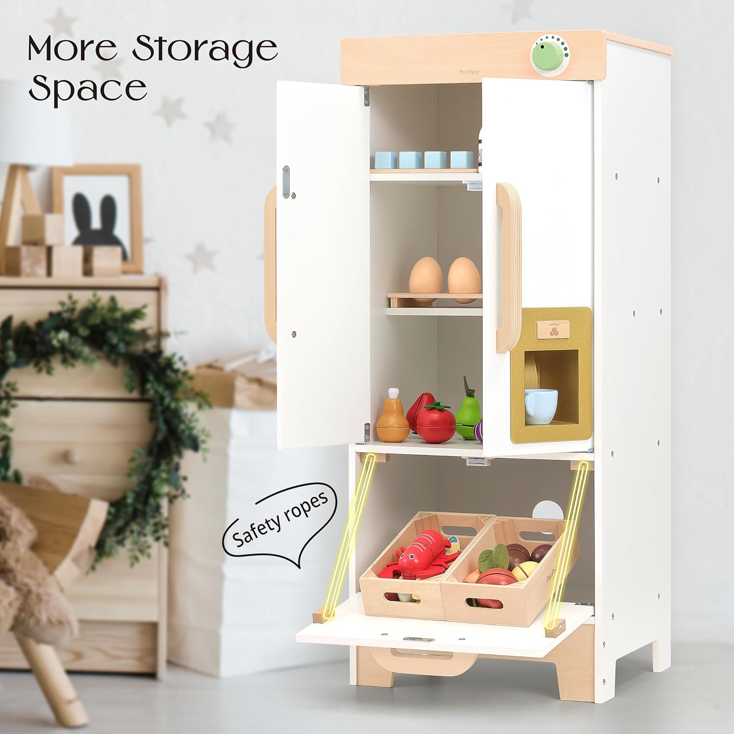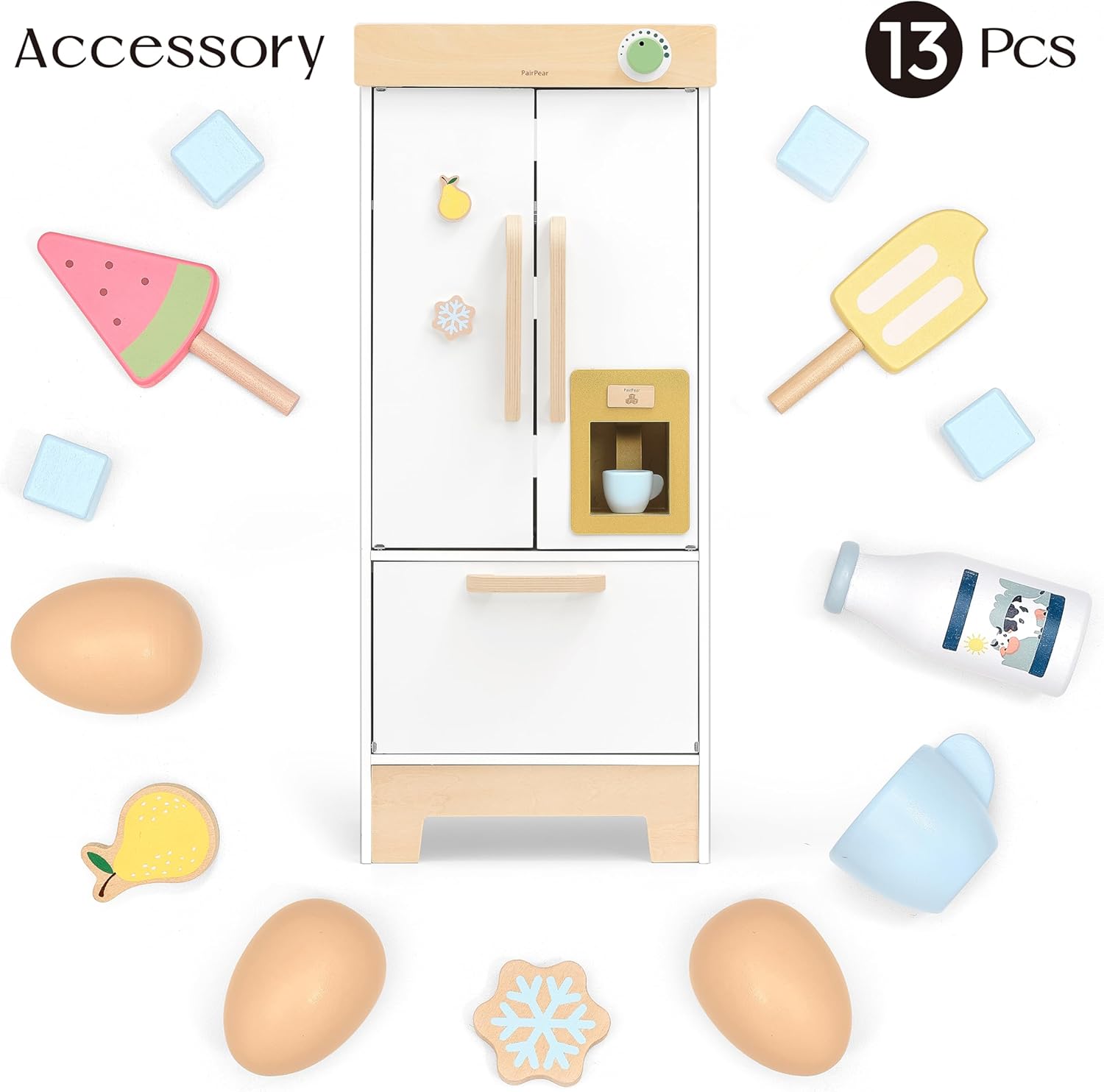 Divertente gioco in cucina per i bambini: il frigorifero giocattolo PairPear è dotato di un distributore di ghiaccio integrato che rilascia cubetti di ghiaccio per un gioco di ruolo realistico. Include anche un magnete da frigo in legno che stimola il processo creativo. I piccoli chef possono esplorare diversi scenari e sviluppare le loro capacità motorie. Frigorifero giocattolo con funzione reale: un totale di 17 accessori da cucina giocattolo, tra cui un simpatico magnete da frigorifero, uovo giocattolo, congelatore con 4 cubetti di legno, tazze, latte, gelato con supporto. Aiuta a migliorare l'abilità manipolativa e a coltivare l'interesse per i lavori domestici attraverso il gioco con il set da cucina e frigorifero in legno PairPear. Design sicuro: realizzato con materiali naturali durevoli e vernici colorate a base d'acqua non tossiche, testate secondo i più alti standard di sicurezza dei bambini (ASTM F963, CPSC). I bordi lisci li rendono una scelta più sicura e amichevole rispetto ai giocattoli di plastica. Le manine dei più piccoli adoreranno la finitura ben realizzata dei giocattoli. Scatola porta giocattoli: oltre ad essere un frigorifero giocattolo, questo resistente set da cucina per bambini funge anche da soluzione per riporre giocattoli, snack e altri oggetti. Aiuta i bambini a imparare a riporre le cose correttamente e a mettere finalmente il cibo al posto giusto. Miglior regalo: grande set da cucina per bambini con accessori da cucina per le mani dei più piccoli. Ottimo regalo educativo per la prima infanzia, ideale per ragazzi e ragazze dai 3 anni in su