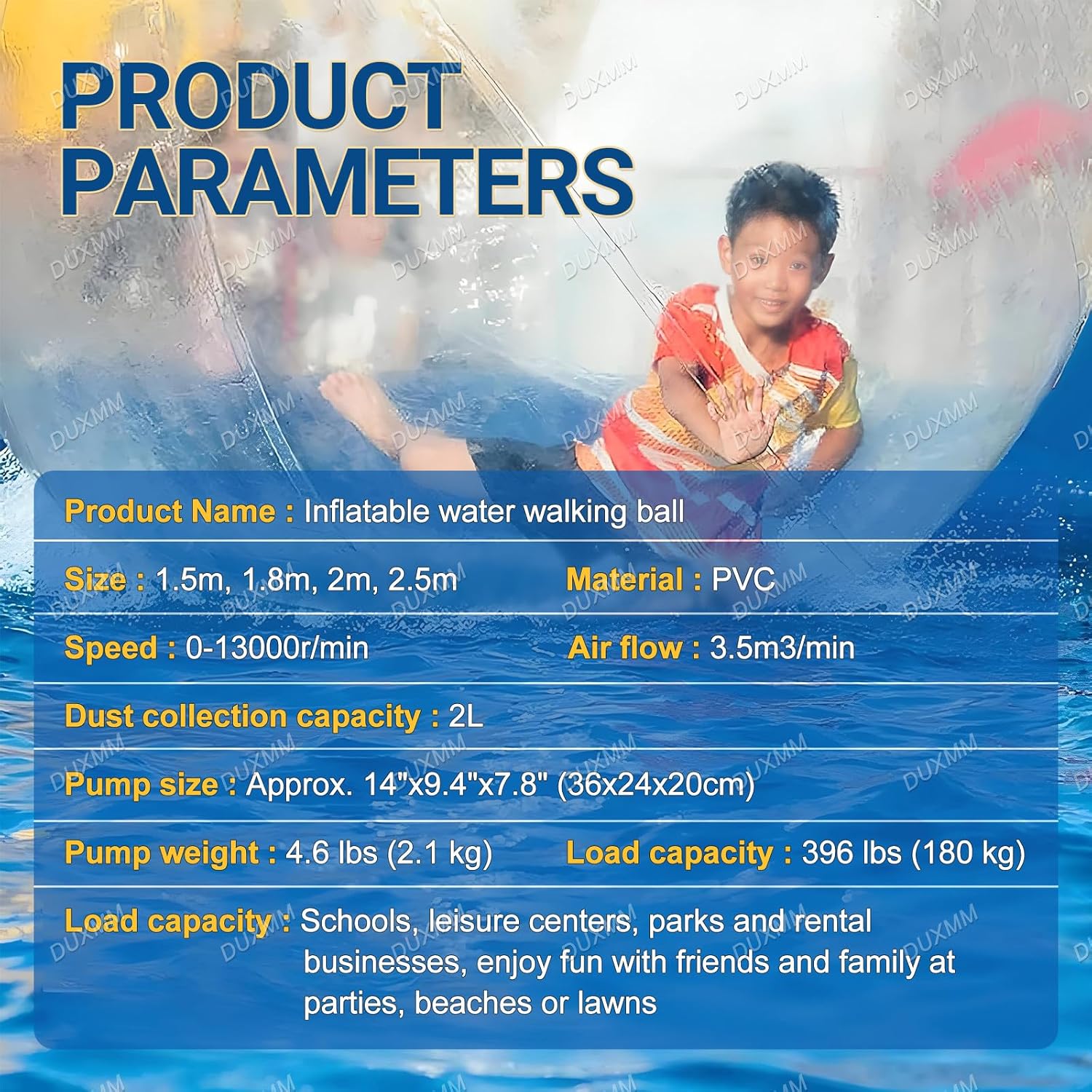 ○● 【MATERIALE ROBUSTO PER UN GIOCO SENZA FINE】Realizzata con robuste pellicole in PVC da 0,18 mm, la palla da passeggio sull'acqua garantisce un'elevata resistenza alla trazione e un'eccellente resistenza all'abrasione. Può sopportare un peso di 180 kg/390 libbre. Questo materiale ecologico e atossico la rende sicura per i bambini, offrendo loro tranquillità durante il gioco ○● 【VARIETÀ DI MISURE E COLORI】La palla da passeggio sull'acqua è disponibile in diverse misure (diametro = 1,5 m/1,8 m/2 m/2,5 m) e colori per soddisfare le tue preferenze e le tue esigenze! Aggiunge un elemento unico e divertente a qualsiasi attività acquatica che ti piaccia. (Nota: 1,5 m è adatto solo ai bambini) ○● 【DOPPIO SIGILLO】La palla da passeggio gonfiabile è dotata di una cerniera impermeabile professionale, che scorre fluidamente senza incepparsi; L'interfaccia sigillata è ulteriormente rinforzata con adesivi ad alta resistenza per una doppia protezione, prevenendo efficacemente l'usura della cerniera o perdite d'acqua accidentali. Che tu stia correndo, rotolando o facendo salti mortali a 360° all'interno della palla, l'interno rimane asciutto ○●【GONFIAGGIO E SGONFIAGGIO 5 VOLTE PIÙ VELOCI: PORTATILE E SENZA SFORZO】La palla gonfiabile è dotata di una potente valvola dell'aria sigillata e di una pompa ad aria ad alta efficienza da 800 watt, che rende il gonfiaggio e lo sgonfiaggio oltre 5 volte più veloci rispetto ai prodotti tradizionali. Può essere completamente gonfiata o sgonfiata in pochi minuti. Dopo lo sgonfiaggio, è facile da riporre senza occupare spazio ○●【AMPIA APPLICAZIONE】La palla da passeggio è adatta a scuole, centri ricreativi, parchi, attività di noleggio. Goditi la corsa, il rotolamento e i salti mortali sull'acqua. Divertiti con i tuoi amici e familiari alle feste, in spiaggia o sui prati erbosi. Assicurati sempre una supervisione competente durante il gioco per massimizzare la sicurezza e il divertimento durante le tue avventure acquatiche