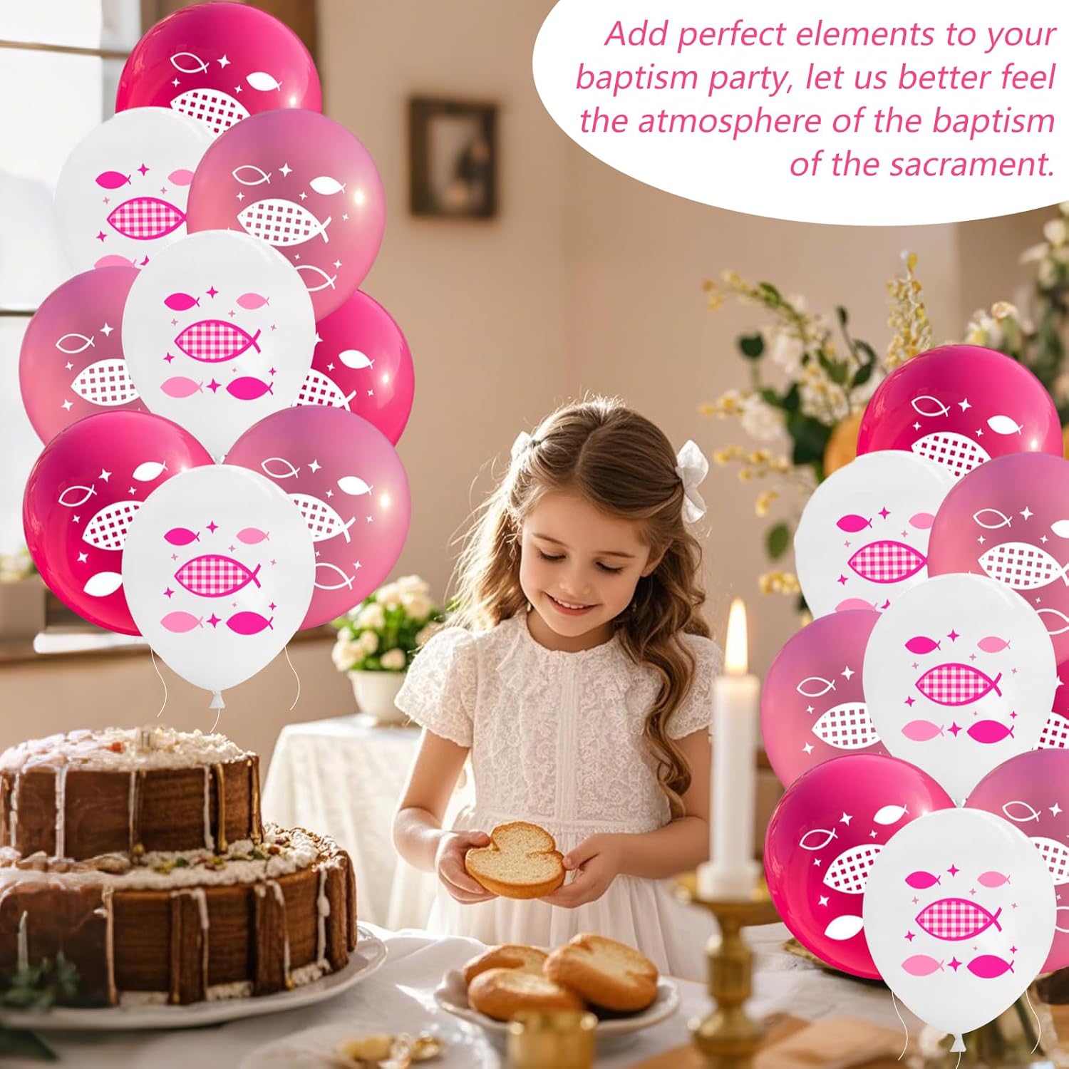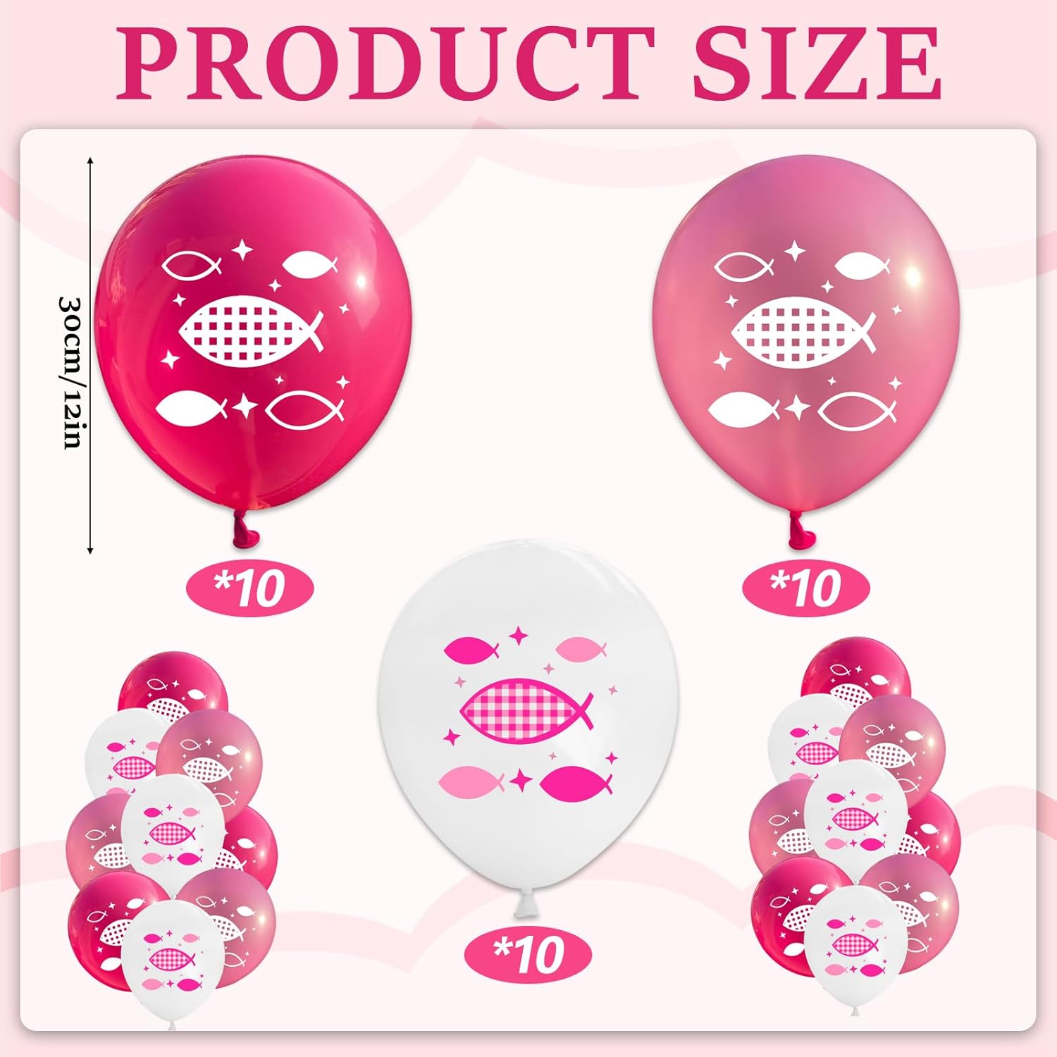 【Set Palloncini Battesimo】: Questo set comprende 30 palloncini da battesimo di 12 pollici in tre colori distinti: rosa shock, rosa pallido e bianco, perfetti per le decorazioni di conferma di una ragazza. Riutilizzabili, questi palloncini sono pronti a rendere indimenticabile ogni celebrazione del battesimo. 【Design Bello e Sacro】: Decorati con disegni di pesci di varie dimensioni, questi palloncini bianchi e blu sono perfetti per la prima celebrazione del battesimo di ogni piccolo. 【Palloncini di Alta Qualità】: Fatti di lattice resistente e durevole, questi palloncini sono non tossici, inoffensivi e rispettosi dell'ambiente. Semplicemente appenderli a pareti, soffitti, porte, tavoli, interni o esterni. 【Per Uomini e Donne】: Questi addobbi battesimo sono ideali sia per festeggiamenti femminili che maschili, rendendo il tuo evento speciale un ricordo indimenticabile per tutti. 【Versatili】: I nostri palloncini per battesimo sono perfetti per decorazioni vintage per battesimi femminili, la prima celebrazione del battesimo di una ragazza, la celebrazione del battesimo di una ragazza, decorazioni per battesimi femminili in rosa, o per dare il benvenuto a una nuova nascita femminile.